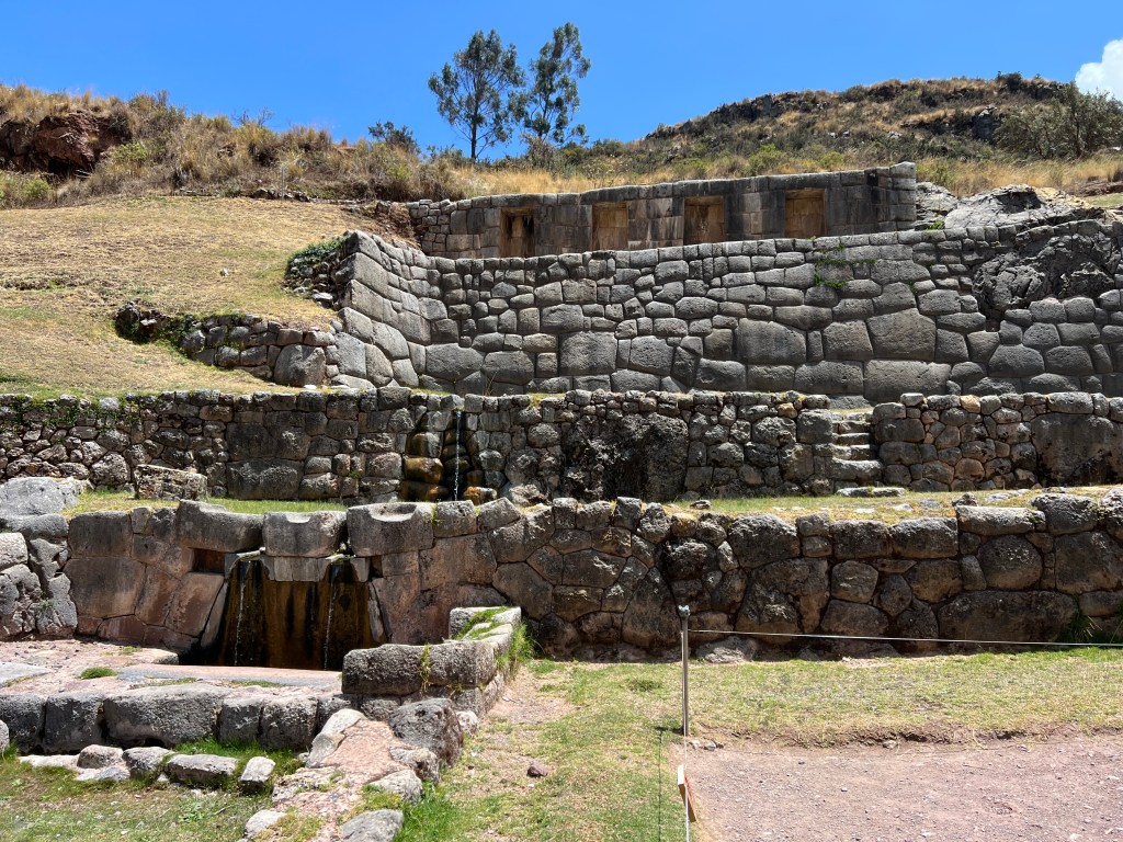 According to Gary Urton in his book El Cosmos Andino, Cusco was considered the center of the universe with a direct radial connection to the middle of the Milky Way. As the stars spread out in the sky, so too do the rays spread out across the landscape from the central axis, Cusco. Here, instead of all roads leading to Rome, they lead to and from the Incan capital. The Incans were amazing engineers, astronomers, artists and agriculturalists and they learned from the way the natural environment flowed. For the terraces that they used for agriculture, they ingeniously laid out canals fed from spring waters that surrounded the various terrace levels but placed so that there was never too much flow to cause damage. Tipón is a site in the south valley that highlights this principle. It was both a religious site for water and used for agricultural purposes. At the origin spring there is a larger stone in the wall above what will become a singular canal that flows for a couple of meters before it separates into two canals, that then separate into three by way of two triangular stones before flowing down to the first terrace where the waters are directed both right and left. The angle of the canals between each level is mathematically calculated to keep a steady flow. The engineering system, while amazing in itself, is also symbolic of the belief system. From one major source, comes duality, which flows into the three worlds, which again are subject to duality creating life.