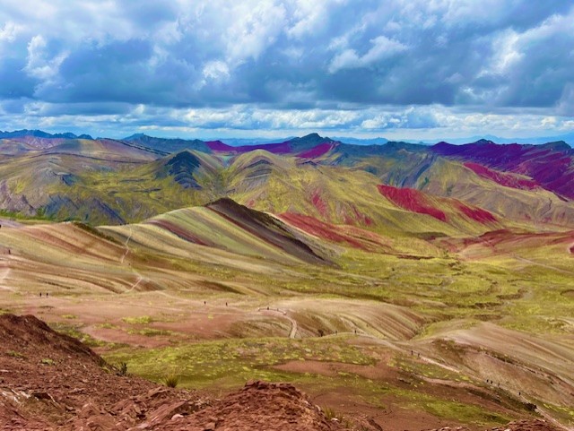 The tour that got me to Waqrapukara was my second attempt to get there. The first time, a week before the successful event, we were unable to go up the gravel section of the road as it was closed for a rally. The tour guide suggested we go to another place across the valley as no one in the group had been there. There are three ‘rainbow mountain’ tours in the Cusco area. The main one, has thousands of people and is almost as popular as Machu Picchu. One of the other ones, Palccoyo, has much less traffic, and this is the one we went to. It was a beautiful walk/short hike (1 ½-2 hrs) with amazing views of the different colors from the earth’s minerals shining through. In the distance from the top, Ausungate, the sacred glaciated mountain, peaked through the clouds. The Andes around Cusco are truly beautiful.