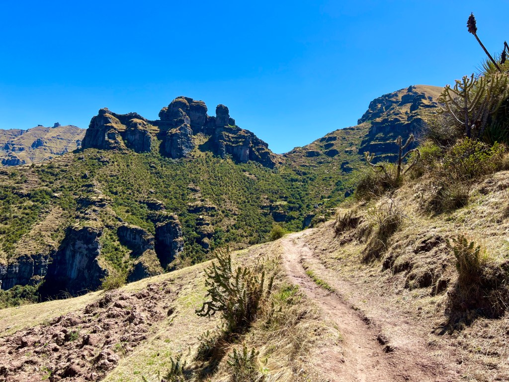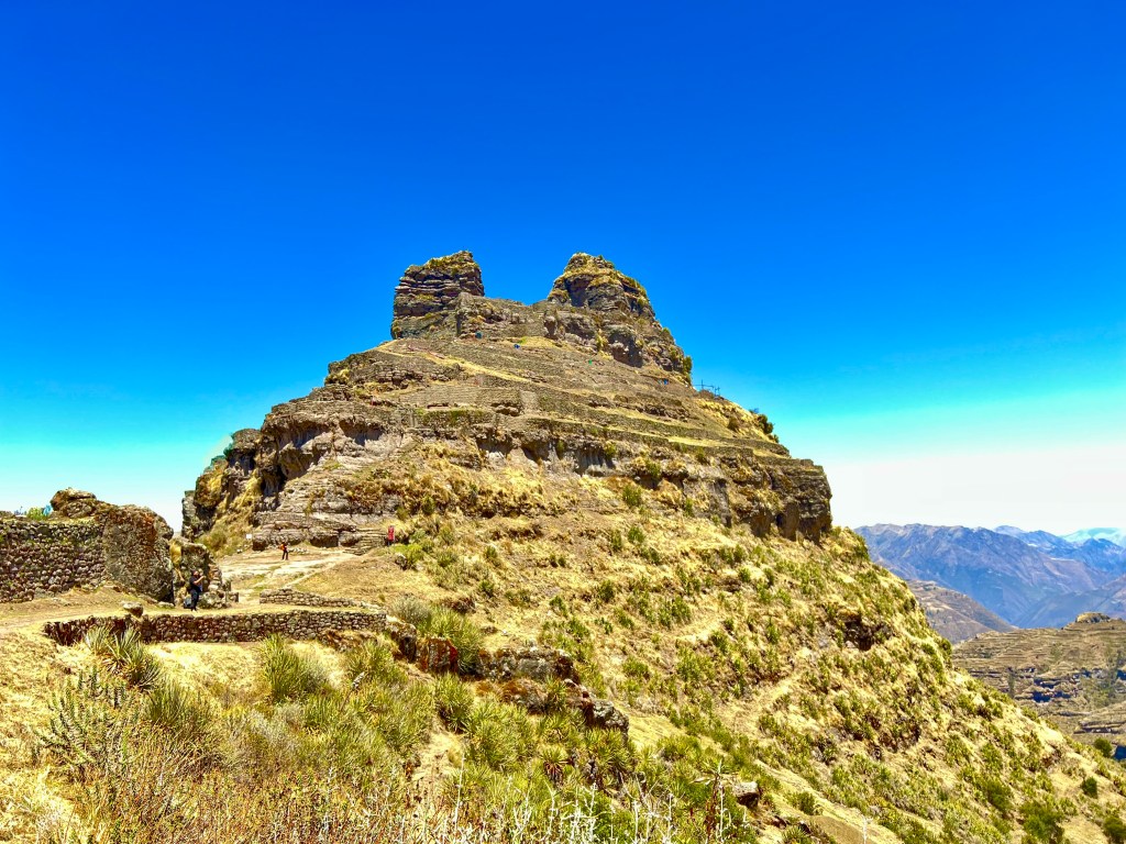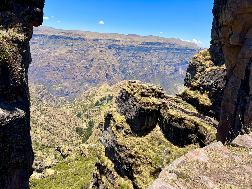 Even though I did not want to go back to Machu Picchu, I did want to visit an undisturbed Incan cult site in the mountains. Waqrapukara opened up to tourism fairly recently and is only a day trip from Cusco, unlike Choquequirao, which is a three to four day trek. Waqrapukara was called by two names, the horned mountain or the ears of the llama mountain. The name comes from two rock protrubances that shoot up from the plateau like horns or ears depending on the perspective. This site is amazing. It was used as a religious as well as astronomical observatory as the sun falls directly in the middle of the platform on the equinoxes. The horns/ears also create a tunnel between surrounding mountains. The walls were formed directly from the rock face in an incredible feat of engineering prowess. There are a few different paths to get to the site, and it is recommended to take a tour rather than try to figure out the paths by oneself. The tour I took had a total of eight people, mostly from Peru, and took off from the small village of Santa Lucia. This entailed about an hour and a half winding gravel road up the mountain and at least one person did get carsick. (Not me!) This route, however, had the shortest trail. The first part was relatively flat until it went quite steeply up for about 20-25 minutes to get to the bottom of the site. Then there are very steep small stone stairs to get to the three levels of the complex. Some of the stairs and paths at the top require good footing and no fear of heights. The views from the top, and our group was alone there, were breathtaking. The steep canyon below could have been a slightly more vegetated Grand Canyon, with many kinds of cacti. It is amazing to me how people construct such sites on the tops of mountains.