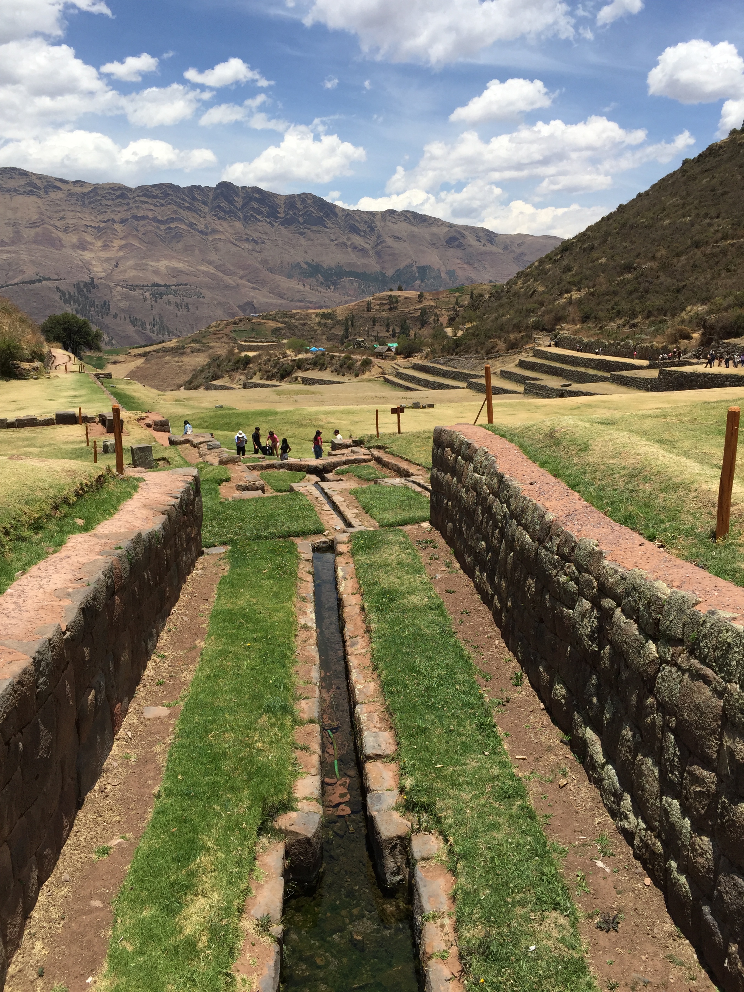 According to Gary Urton in his book El Cosmos Andino, Cusco was considered the center of the universe with a direct radial connection to the middle of the Milky Way. As the stars spread out in the sky, so too do the rays spread out across the landscape from the central axis, Cusco. Here, instead of all roads leading to Rome, they lead to and from the Incan capital. The Incans were amazing engineers, astronomers, artists and agriculturalists and they learned from the way the natural environment flowed. For the terraces that they used for agriculture, they ingeniously laid out canals fed from spring waters that surrounded the various terrace levels but placed so that there was never too much flow to cause damage. Tipón is a site in the south valley that highlights this principle. It was both a religious site for water and used for agricultural purposes. At the origin spring there is a larger stone in the wall above what will become a singular canal that flows for a couple of meters before it separates into two canals, that then separate into three by way of two triangular stones before flowing down to the first terrace where the waters are directed both right and left. The angle of the canals between each level is mathematically calculated to keep a steady flow. The engineering system, while amazing in itself, is also symbolic of the belief system. From one major source, comes duality, which flows into the three worlds, which again are subject to duality creating life.