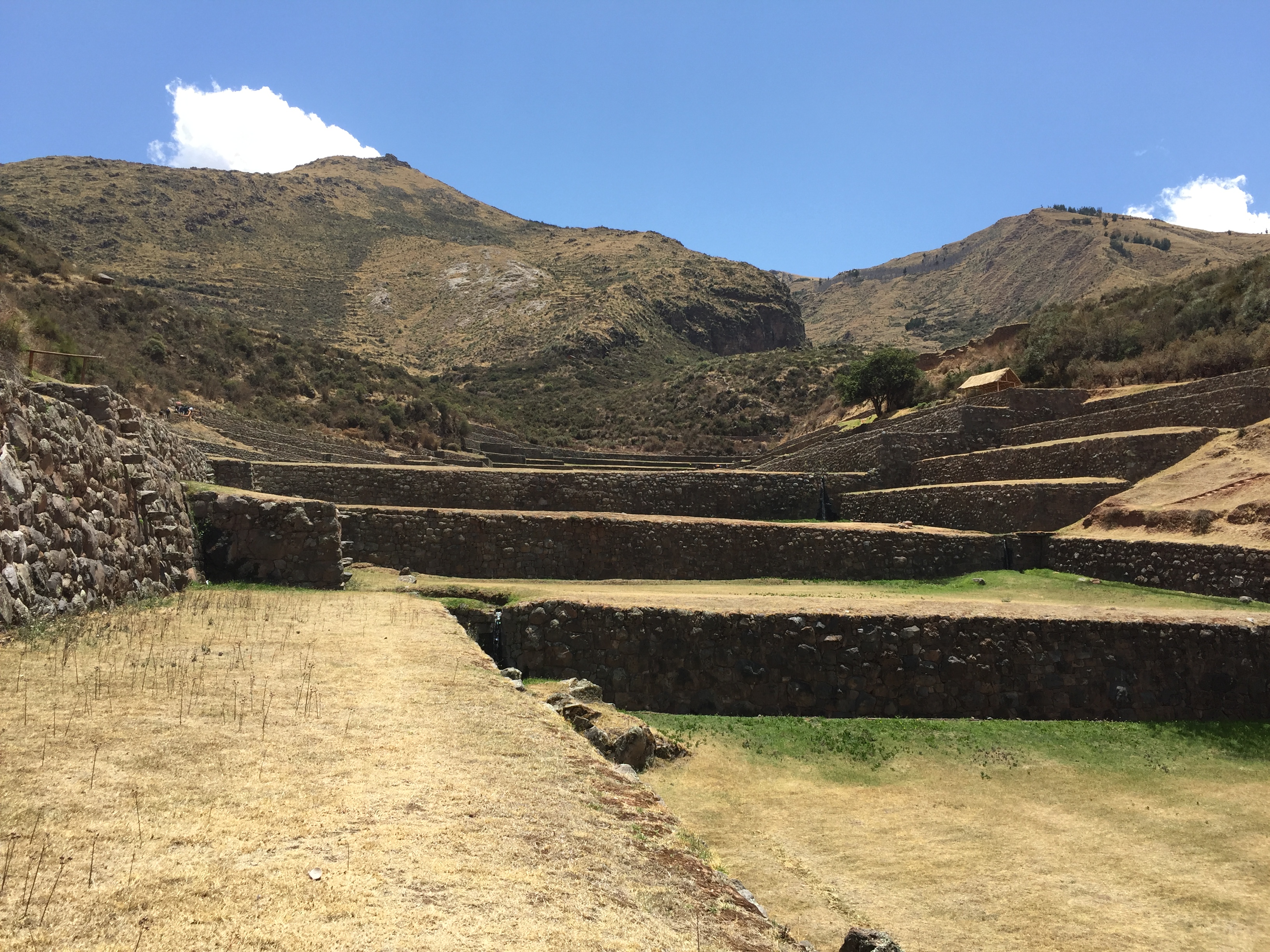 In the Sun Temple, as elsewhere in the Incan sites, there are niches in many of the rooms where gold and silver votive figures would be placed. Gold represents the sun, while silver represents the moon, i.e., male and female. In the granaries the votive figures protected the food. On the hill across from the main site, there are a series of granaries/storehouses. The Incans had a sense about changing climatic patterns and were smart enough to build storage units high on the hills that would preserve food for up to seven years. Due to the way they managed the terraces, they were also able to plant and harvest foods that were not native to the area, along with the essential multiple corn and potato varieties. The construction of the Sun Temple is a perfect example of how the Incan’s built seismically resistant buildings, by having a slight inward angle rather than the perfectly straight right angles of the earlier Wari civilization buildings. Naturally, the Sun Temple and other Incan edifices didn’t survive until now, but that was due to the destruction caused by the Spanish who felt the need to eradicate Incan beliefs and convert everyone to Christianity. Even Pachamama became sometimes known as “Pachamama Sancta Tierra”.