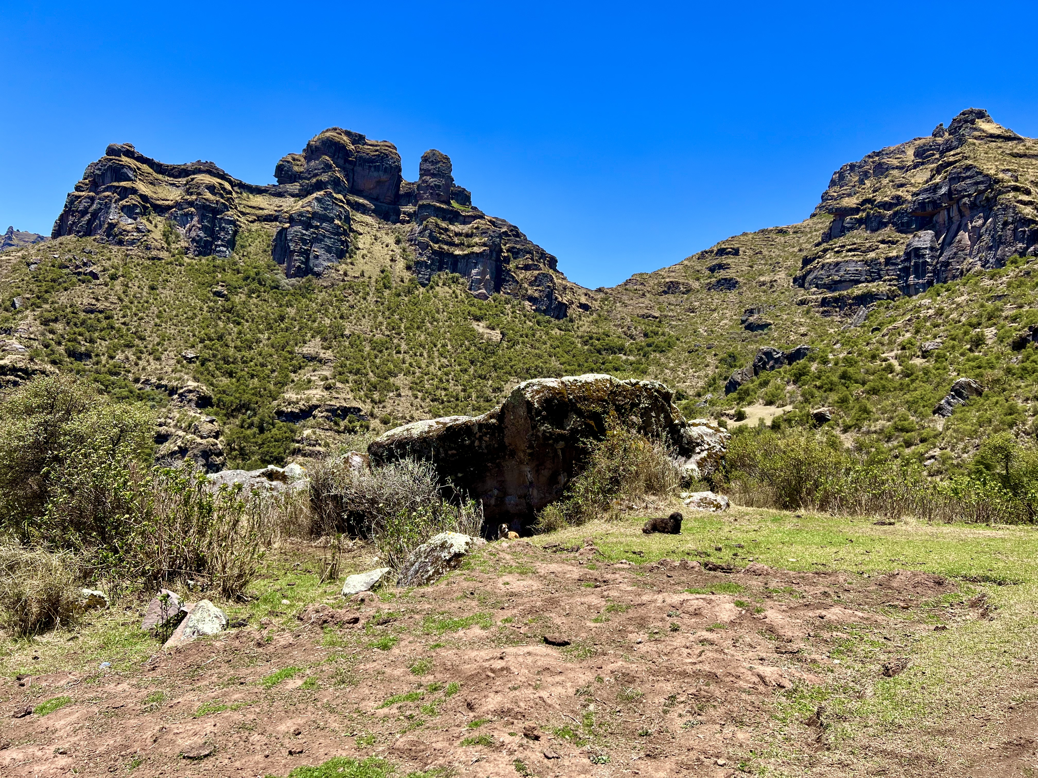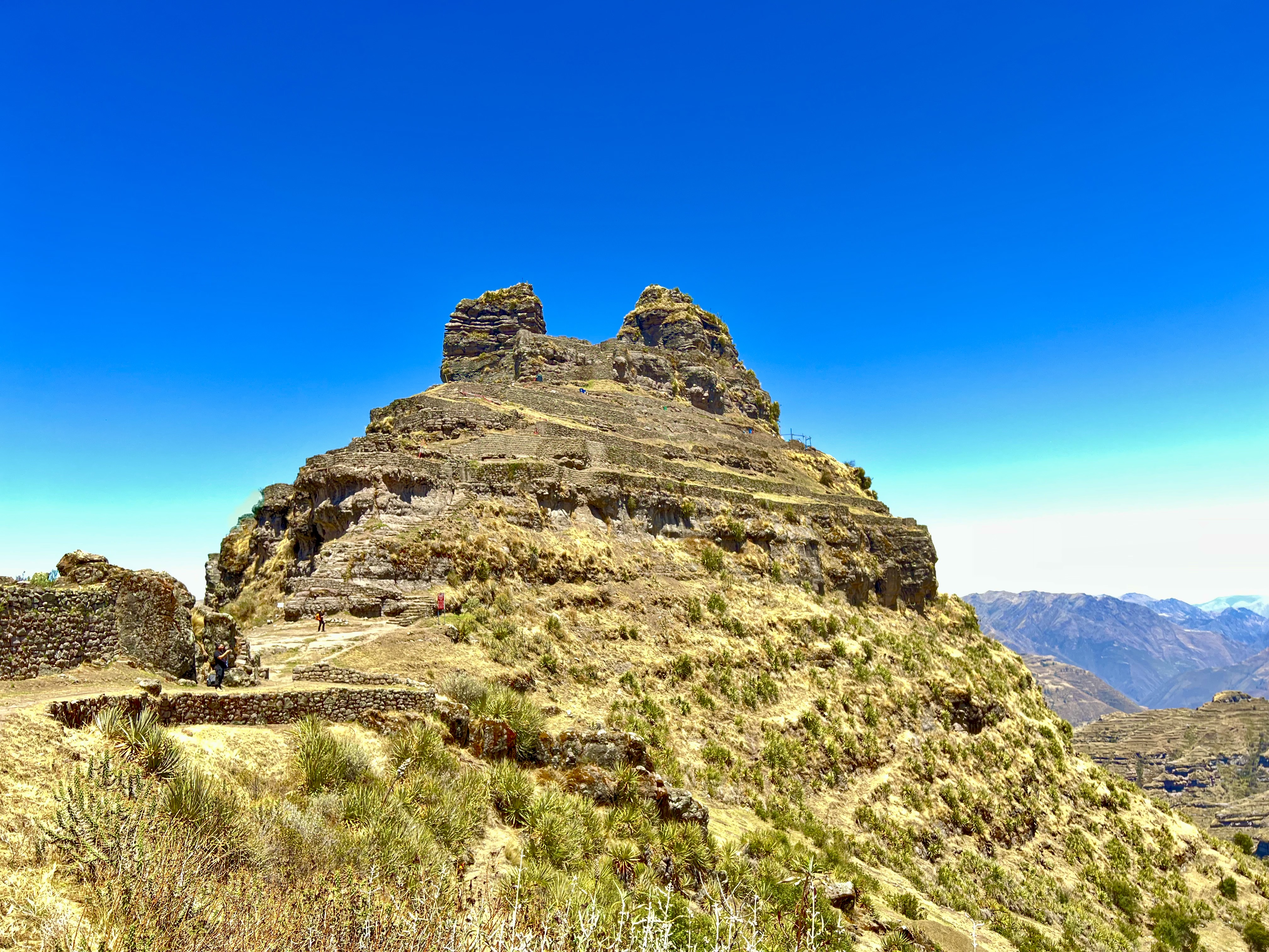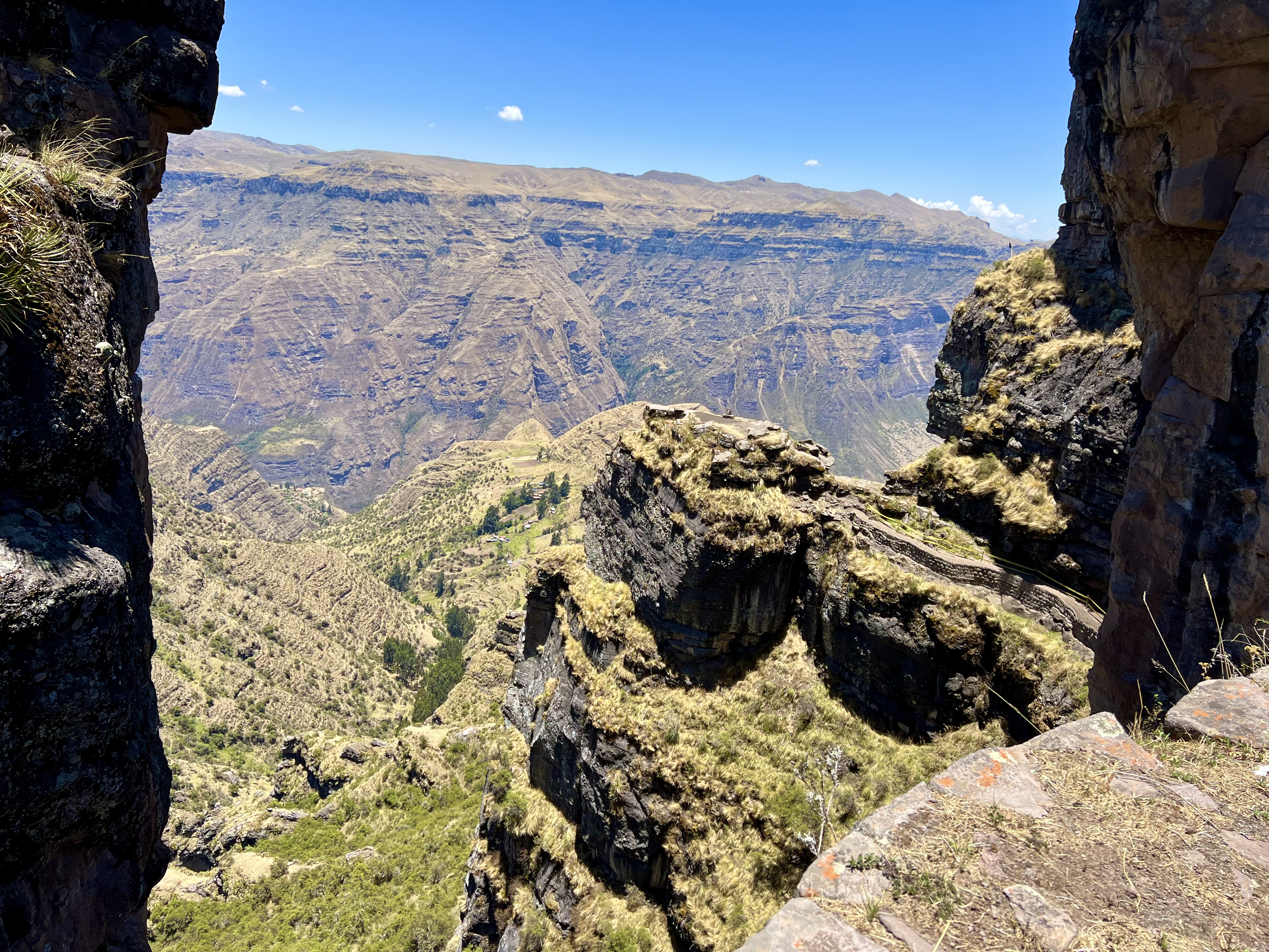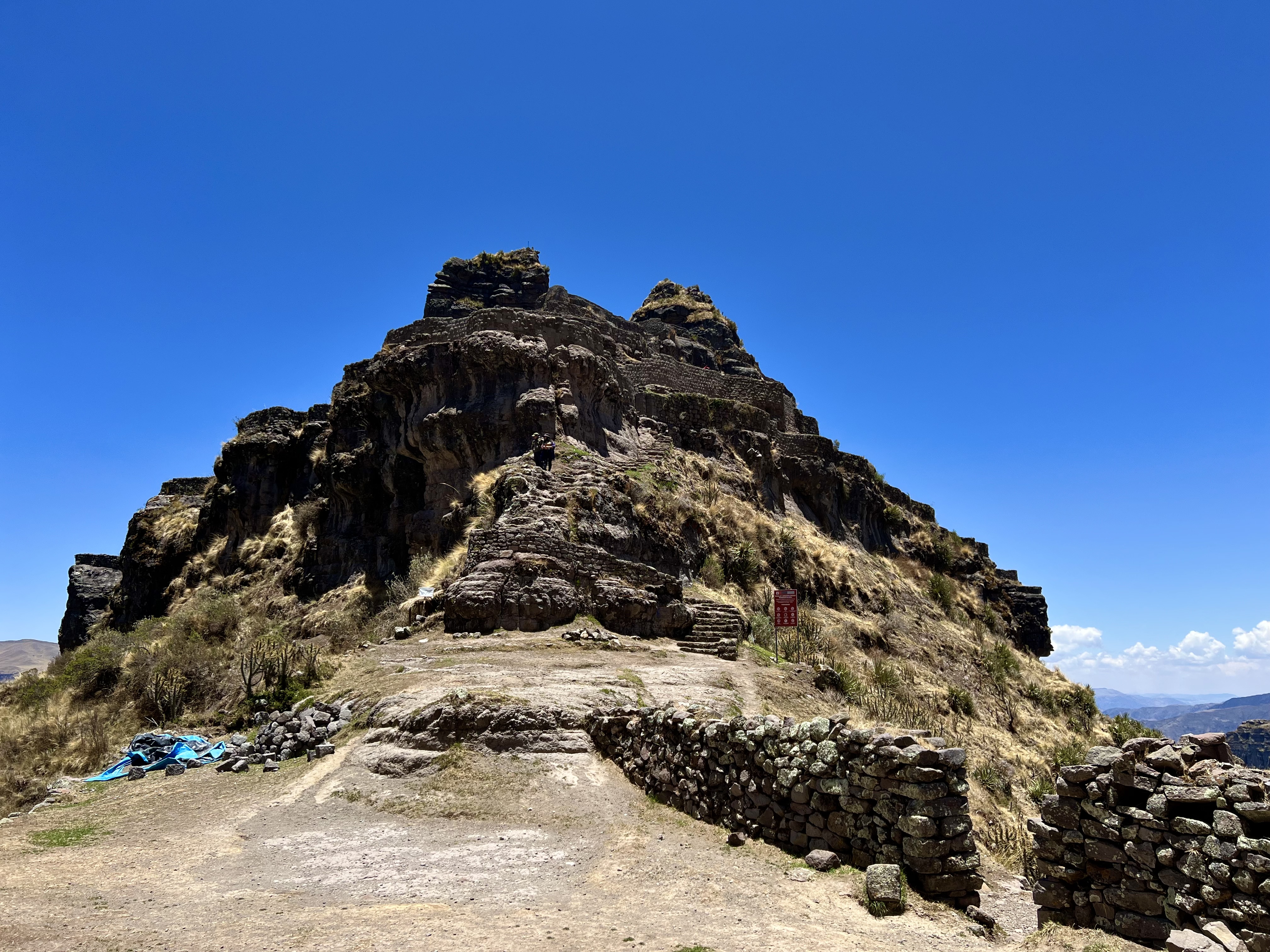 Even though I did not want to go back to Machu Picchu, I did want to visit an undisturbed Incan cult site in the mountains. Waqrapukara opened up to tourism fairly recently and is only a day trip from Cusco, unlike Choquequirao, which is a three to four day trek. Waqrapukara was called by two names, the horned mountain or the ears of the llama mountain. The name comes from two rock protrubances that shoot up from the plateau like horns or ears depending on the perspective. This site is amazing. It was used as a religious as well as astronomical observatory as the sun falls directly in the middle of the platform on the equinoxes. The horns/ears also create a tunnel between surrounding mountains. The walls were formed directly from the rock face in an incredible feat of engineering prowess. There are a few different paths to get to the site, and it is recommended to take a tour rather than try to figure out the paths by oneself. The tour I took had a total of eight people, mostly from Peru, and took off from the small village of Santa Lucia. This entailed about an hour and a half winding gravel road up the mountain and at least one person did get carsick. (Not me!) This route, however, had the shortest trail. The first part was relatively flat until it went quite steeply up for about 20-25 minutes to get to the bottom of the site. Then there are very steep small stone stairs to get to the three levels of the complex. Some of the stairs and paths at the top require good footing and no fear of heights. The views from the top, and our group was alone there, were breathtaking. The steep canyon below could have been a slightly more vegetated Grand Canyon, with many kinds of cacti. It is amazing to me how people construct such sites on the tops of mountains.