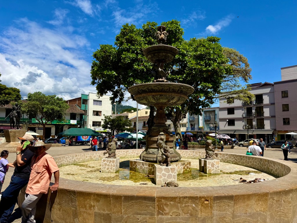 Before we stopped in the center of Jardin, we had lunch (included in the tour) at a trout farm, where I saw a vulture right by the fish tanks waiting for his opportunity. The trout farm had an ancient water wheel that kept the water in the tanks fresh. Nearby was a stream with a couple of small waterfalls flowing down the hillside. In town, we stopped at a place selling sweets, and they gave each of the tour participants a coconut rice pudding dish to taste. After the sweet, we had some free time to walk around, which was when I went to the museum, found a zipline site for people to slide or bike across, and people watched in the plaza. It seemed every third man had a cowboy hat on. Even if Jardin is a tourist mecca for Antioquia, it is still the commercial hub for coffee and plantains.