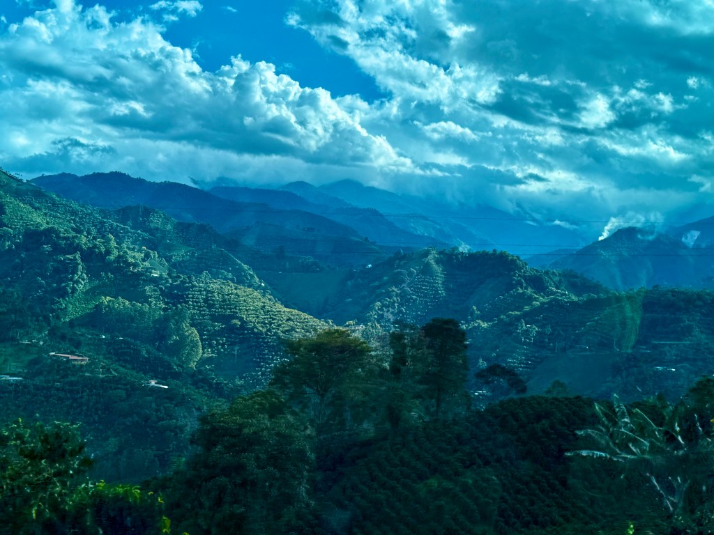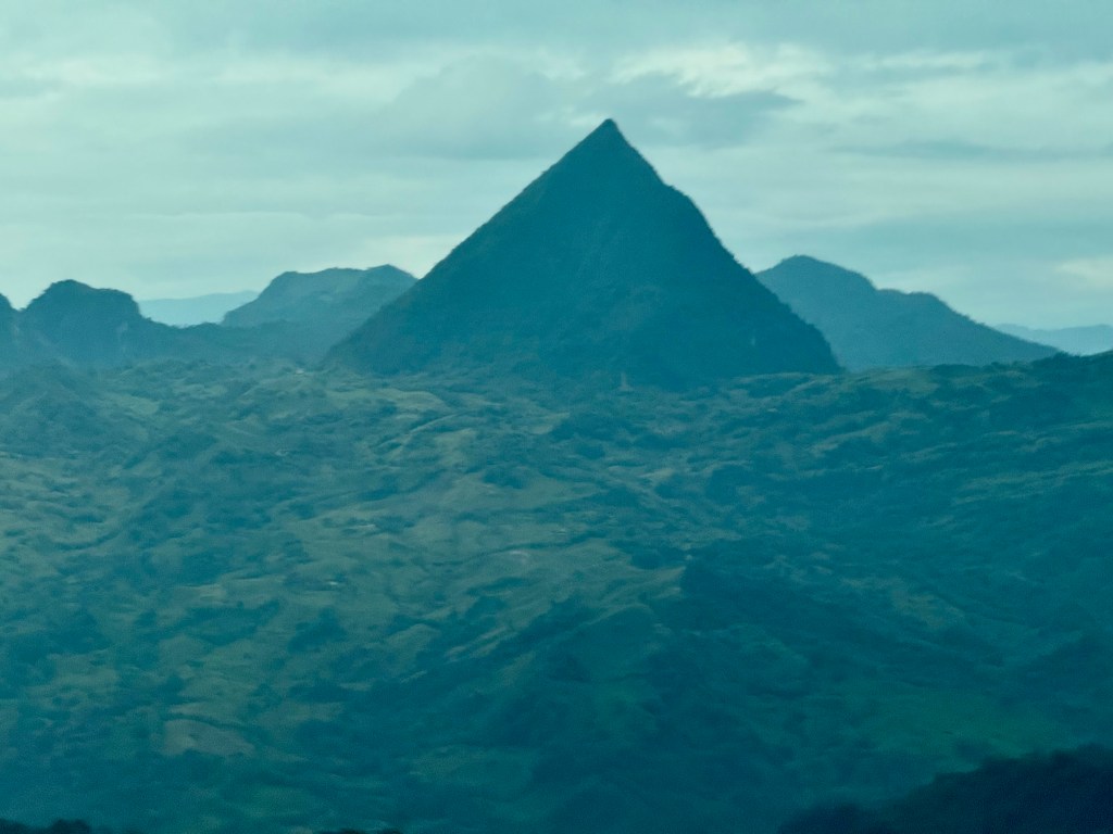 The Get Your Guide site said that the meeting point was at the Estado metro station at 5am. This was far from my hotel, so I had to take an Uber to get there. When the bus left the station, the driver and guide stopped at five other pick-up points, one of which was a 10-minute walk from my hotel. I guess it would have been wiser to email the guide to ask about other pick-up places. We finally left Medellin for the over two-hour drive to the first of the villages we were going to visit about 6:30. Along the way we stopped at a place for breakfast, which was not included in the tour, and passed by Cerro Tusa, which is the world’s largest natural pyramid. I was only able to get a photo through the glass windows of the bus.