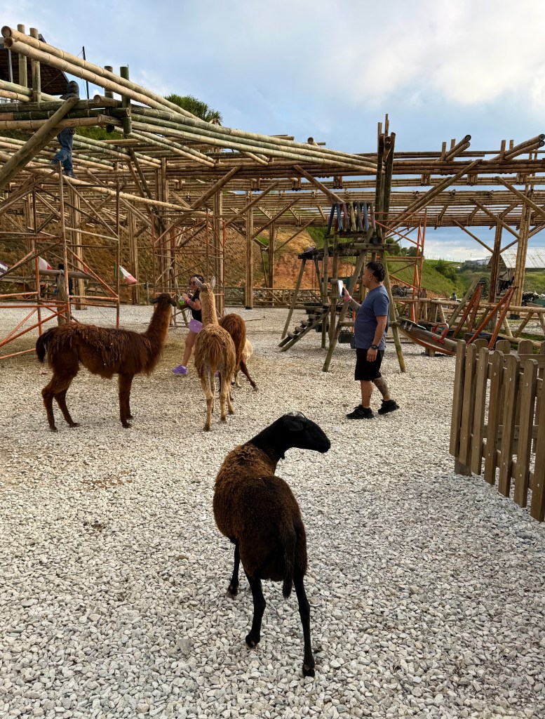 After the boat tour, we stopped for lunch at the same place we had breakfast. On the menu was a chicken filet served with rice, beans and some lettuce. Before heading back to Medellín, we had one more stop at “El Alto del Chocho.” Here goats, sheep and llamas roam freely in the yard waiting to be fed by the tourists. In the back there are stalls with horses, ponies, more sheep, and goats. While I was there a black horse was drenched with sweat as he was performing a pseudo-dressage movement between a passage and piaffe on a long stretch of concrete in front of the restaurant area. The flowing high movement was beautiful, but the animal was clearly stressed out. I saw him again a few minutes later and he was being led on a lead while someone who obviously did not know how to ride was in the saddle. He was a beautiful horse; I hope he is well taken care of and not just used as a money-making gimmick.