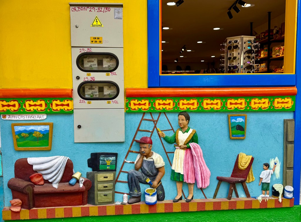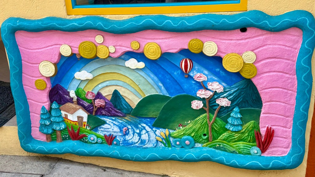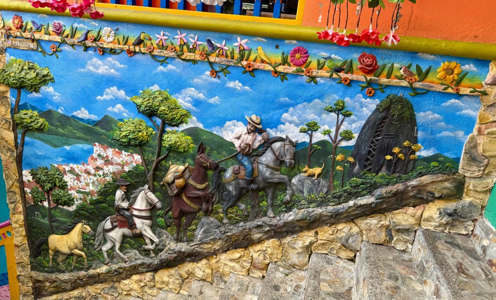 After that we stopped in Guatapé town, which is a colorful very touristy village. The people who live and work here have painted and sculpted reliefs on the bottom of the houses and shops that relate to the work that is done by the inhabitants. Some of these are true works of art. Even though it is a tourist town, it was delightful. We sampled some local coffee and had a coco tea, which I hadn’t had since Peru. There are a number of humorous signs, some selling cannabis beer and others that simply want to entice visitors to drink. On the other end of the spectrum, the church was decked out in preparation for Holy Week with purple banners. The symbol of the town is the lamb, for the Lamb of Christ, and is portrayed on the base of the fountain in the main square as well as in many other places throughout the village.