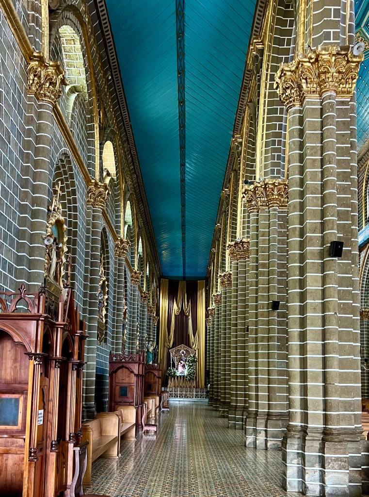 The last village stop of the day was in Jardin, which is considered to be one of the most beautiful villages in the country. It too is on the National Heritage registry because many of the houses have retained their original character. They are brightly painted with flowers hanging in baskets from the balconies and on the sides of the houses. The wooden windows are lined with horizontal wooden strips that let both light and views in exposing the interior. Jardin is the largest of the towns we visited with around 15,000 inhabitants. It is the center of the coffee production for the region. As with many places in this part of the world, the Plaza Mayor is dedicated to El Liberador, Simon Bolivar, and his statue is on prominent display not too far from the large fountain in the middle, which used to be the water source for the town, when it was still a village. The site of the town and surrounding area has been inhabited by indigenous peoples well prior to the Spanish conquest and their artwork is still valued, and sold, in the square and shops. On the side of the Plaza kitty corner from the Basilica, is the museum in the Casa de Cultura, which has both indigenous and more contemporary art on display. The church, which was built in a quasi-neo-Gothic style between 1918-1942 was raised to minor basilica standing in 1980. The Basílica de la Unmaculada Concepción is quite large. What is most striking about the structure, however, is that it is made from cut stones from local mountains as penance for the parishioners’ sins. The church was designed by Giovanni Buscaglione and is a very impressive – if austere – structure. One has to wonder what sins in this small town could be committed to warrant such a large building. There is a novel waiting to be written about this place.
