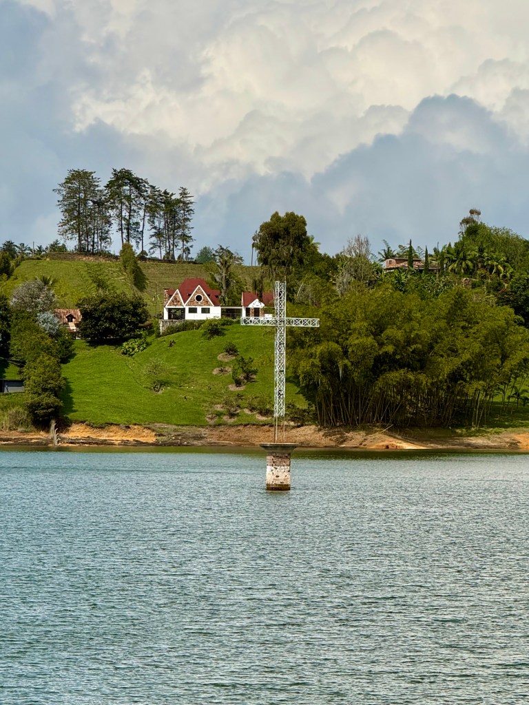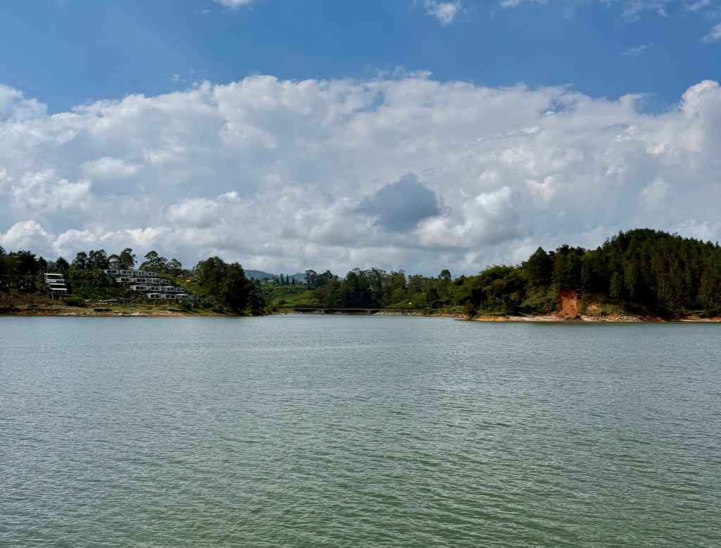 We then walked down the hill to a boat that took us on a 45-minute tour of a small section of the lake. On the way we passed by one of Pablo Escobar’s former villas; this one was bombed in the 1990s by a rival gang, whose name, according to the guide, translates into ‘those who were persecuted by Escobar’. On the top of the rise above his villa are the remnants of his former stable. He must have had quite a few horses here by the size of the structure. Today, the houses around the lake/reservoir are owned by wealthy Medellínos or other well-heeled locals. The architecture on some of them is stunning. Electric boating, kayaks and paddle boards are allowed, but swimming is not due to the currents created by the mix of different water sources flowing into the reservoir, not the least of which is the Rio Negro. A bridge marks the entry of the river into the reservoir. In Brazil, the Rio Negro flows directly into the Amazon; when the two meet their distinct colors flow side by side for more than six kilometers.
