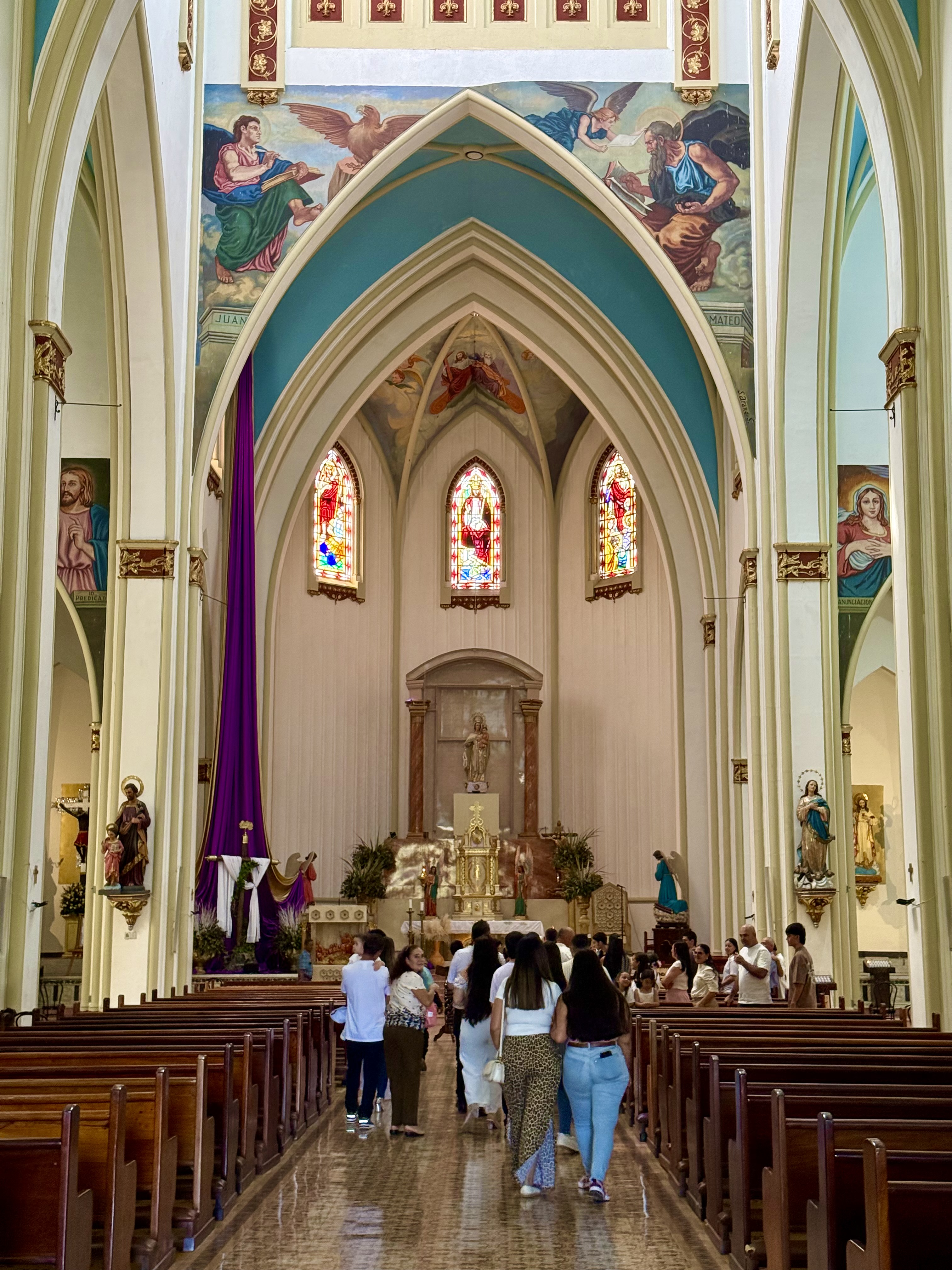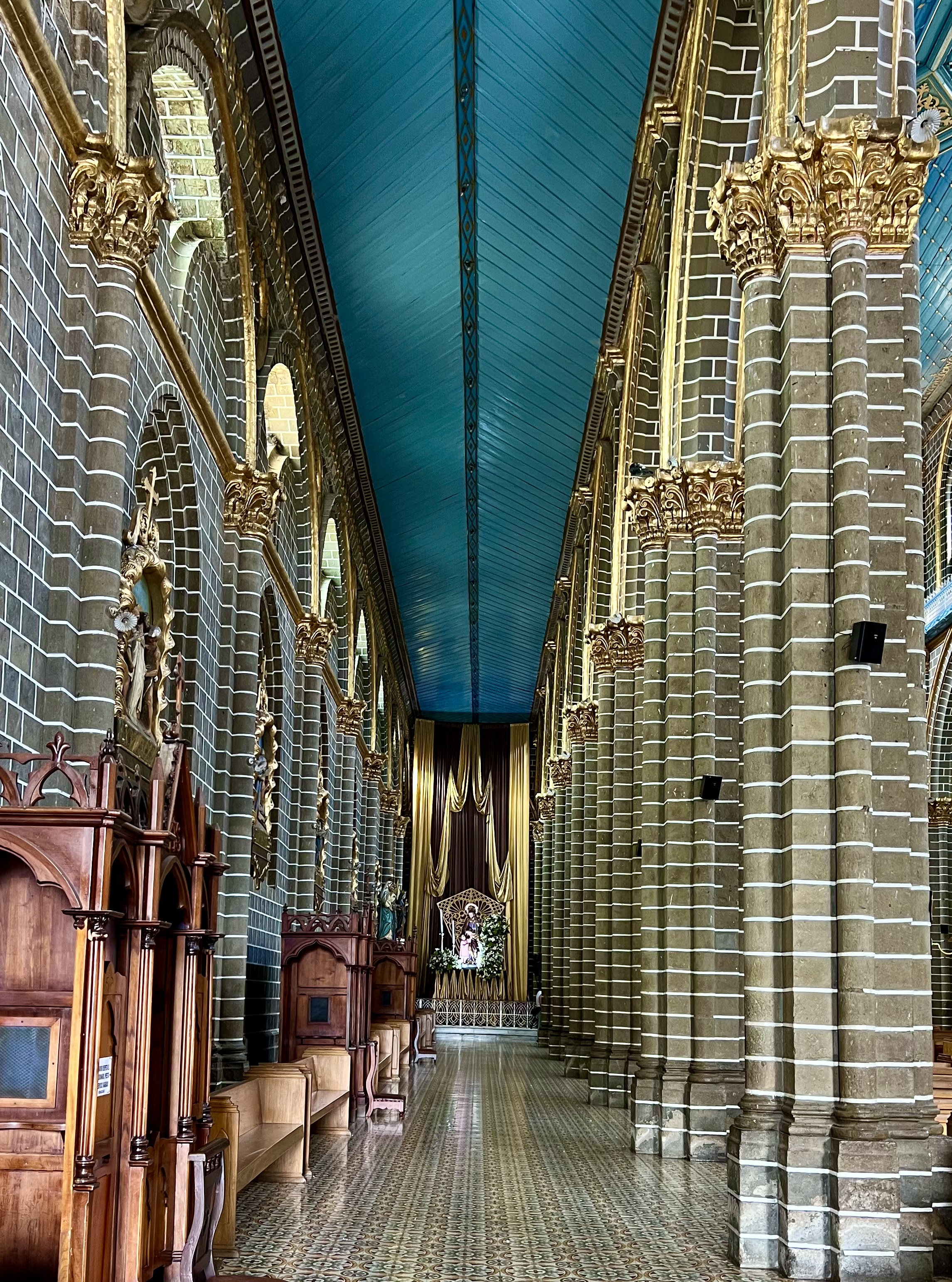 Our first official stop was in Hispania, a small traditional village situated at about 1000 m in altitude and with about 5,000 inhabitants. There were two highlights in Hispania, the first is the Parque Principal, which is the square in front of the second, the church. The Parque has six flower bed sections with large old trees. There are walking paths between the sections and a traditional wooden two-story rotunda selling drinks and snacks in the middle. The church, the Iglesia Nuestra Señora de las Mercedes was constructed in 1931. The structure is fairly typical of the region, but what stands out in this church are the stained-glass windows and sculptures of Maria and the saints. When one enters, the right side of the building is lined with sculptures of Maria in her various identities, from that of protector to divine grace. Above the sculptures are the stained-glass windows, mostly in pairs with one window dedicated to symbols relating to the Virgin and the other to the Christ narrative. On the other side, there are sculptures of the saints and apostles, with similar windows above. The stained-glass windows are true works of art.