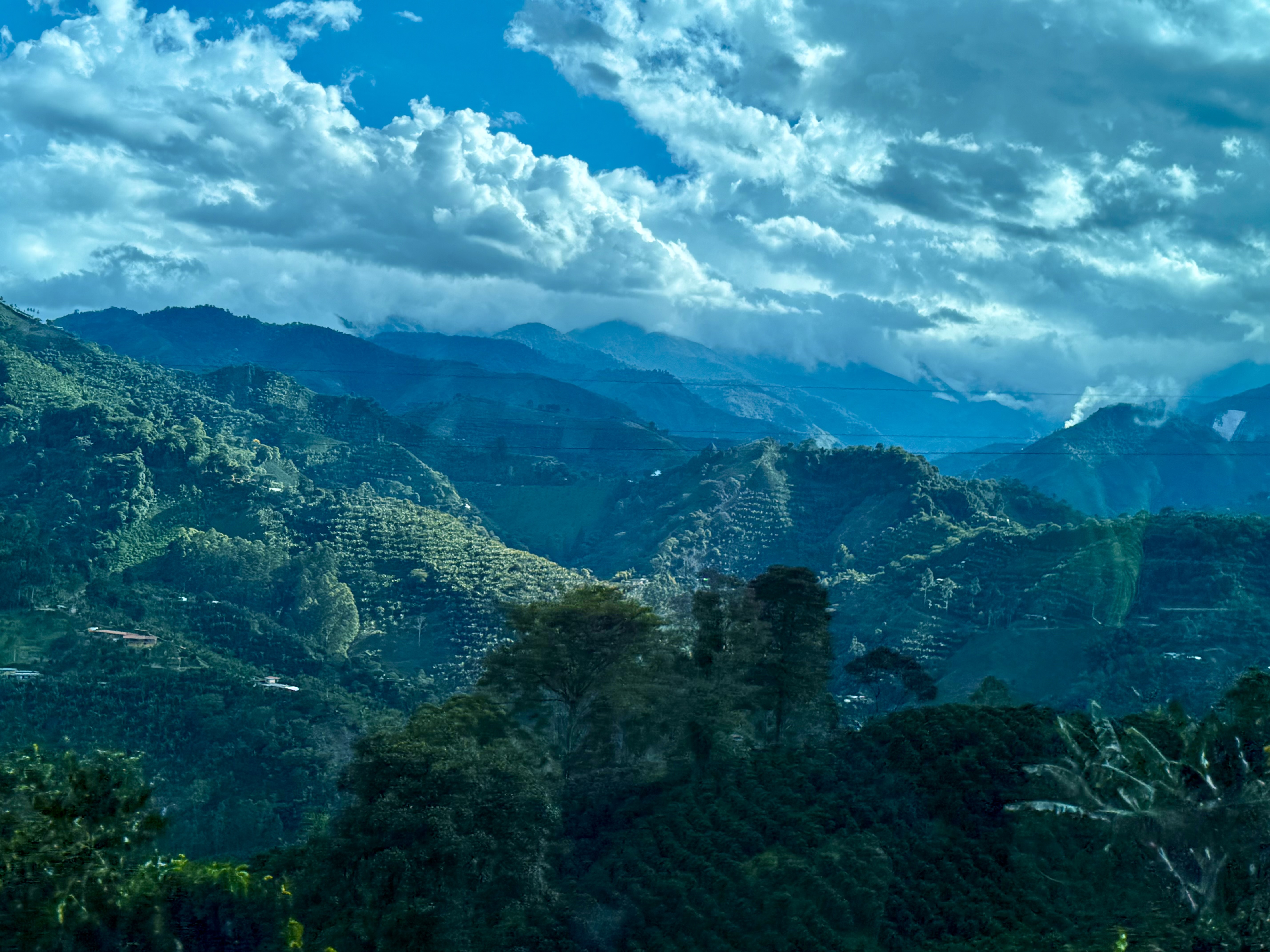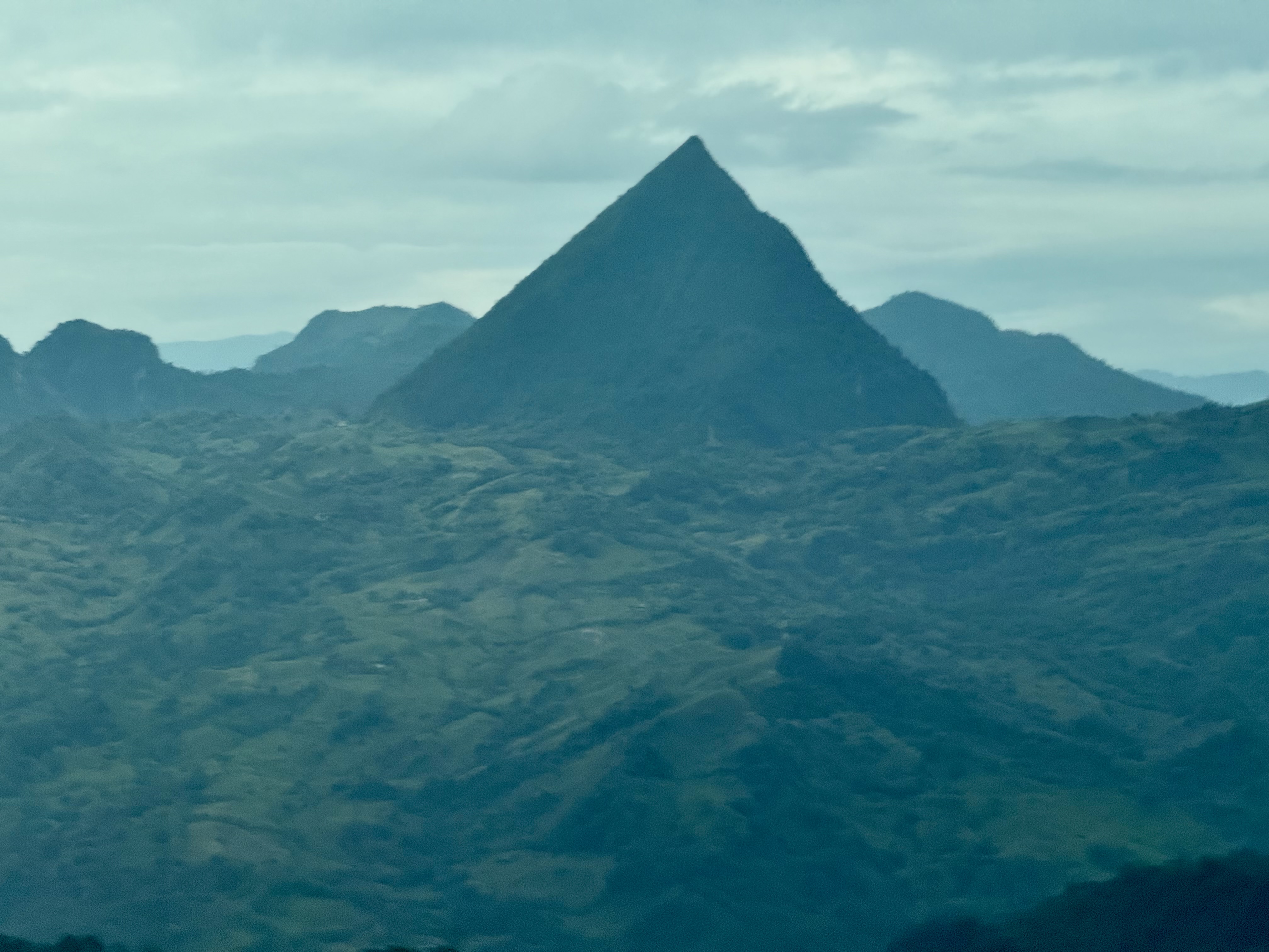 The Get Your Guide site said that the meeting point was at the Estado metro station at 5am. This was far from my hotel, so I had to take an Uber to get there. When the bus left the station, the driver and guide stopped at five other pick-up points, one of which was a 10-minute walk from my hotel. I guess it would have been wiser to email the guide to ask about other pick-up places. We finally left Medellin for the over two-hour drive to the first of the villages we were going to visit about 6:30. Along the way we stopped at a place for breakfast, which was not included in the tour, and passed by Cerro Tusa, which is the world’s largest natural pyramid. I was only able to get a photo through the glass windows of the bus.