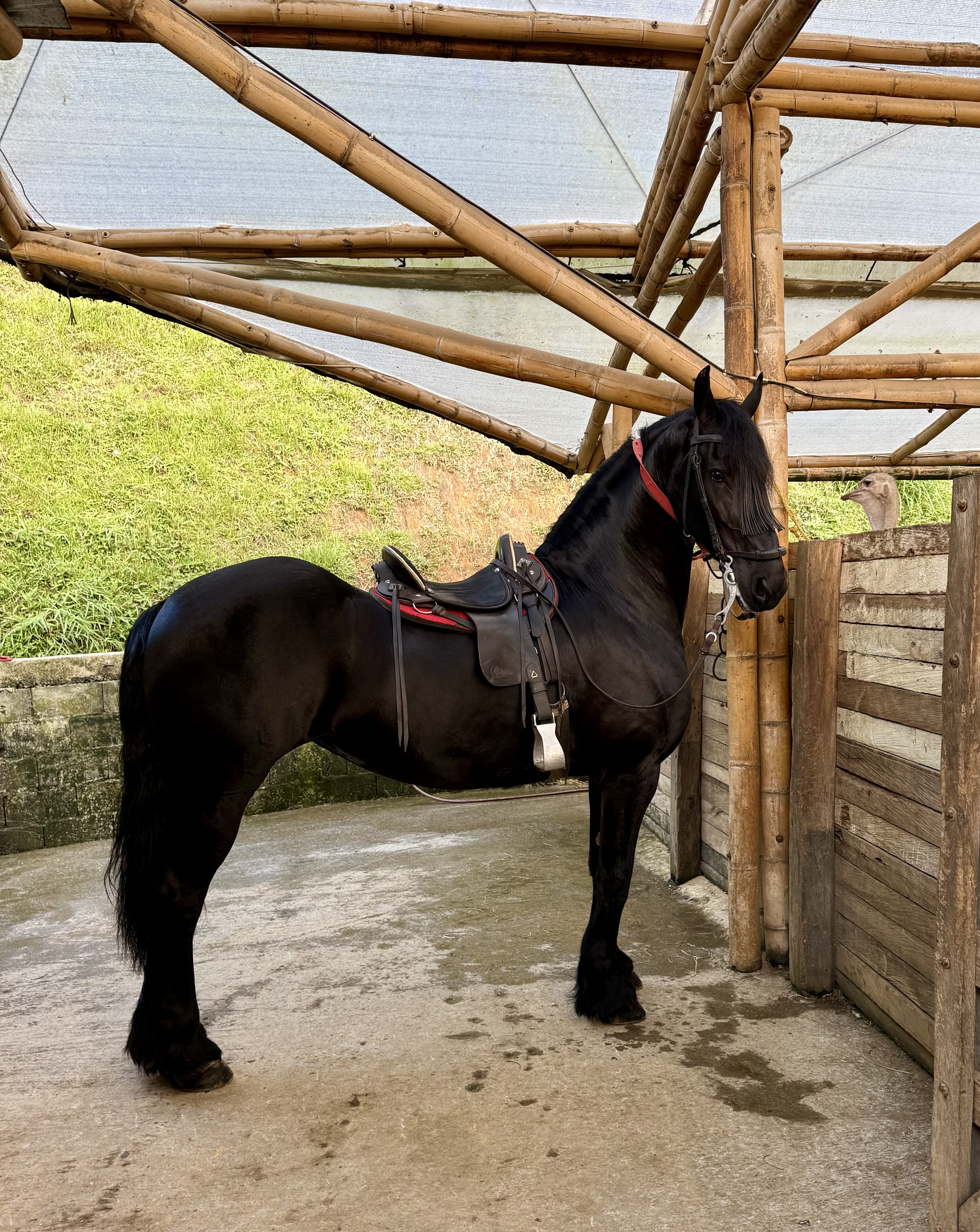 After the boat tour, we stopped for lunch at the same place we had breakfast. On the menu was a chicken filet served with rice, beans and some lettuce. Before heading back to Medellín, we had one more stop at “El Alto del Chocho.” Here goats, sheep and llamas roam freely in the yard waiting to be fed by the tourists. In the back there are stalls with horses, ponies, more sheep, and goats. While I was there a black horse was drenched with sweat as he was performing a pseudo-dressage movement between a passage and piaffe on a long stretch of concrete in front of the restaurant area. The flowing high movement was beautiful, but the animal was clearly stressed out. I saw him again a few minutes later and he was being led on a lead while someone who obviously did not know how to ride was in the saddle. He was a beautiful horse; I hope he is well taken care of and not just used as a money-making gimmick.