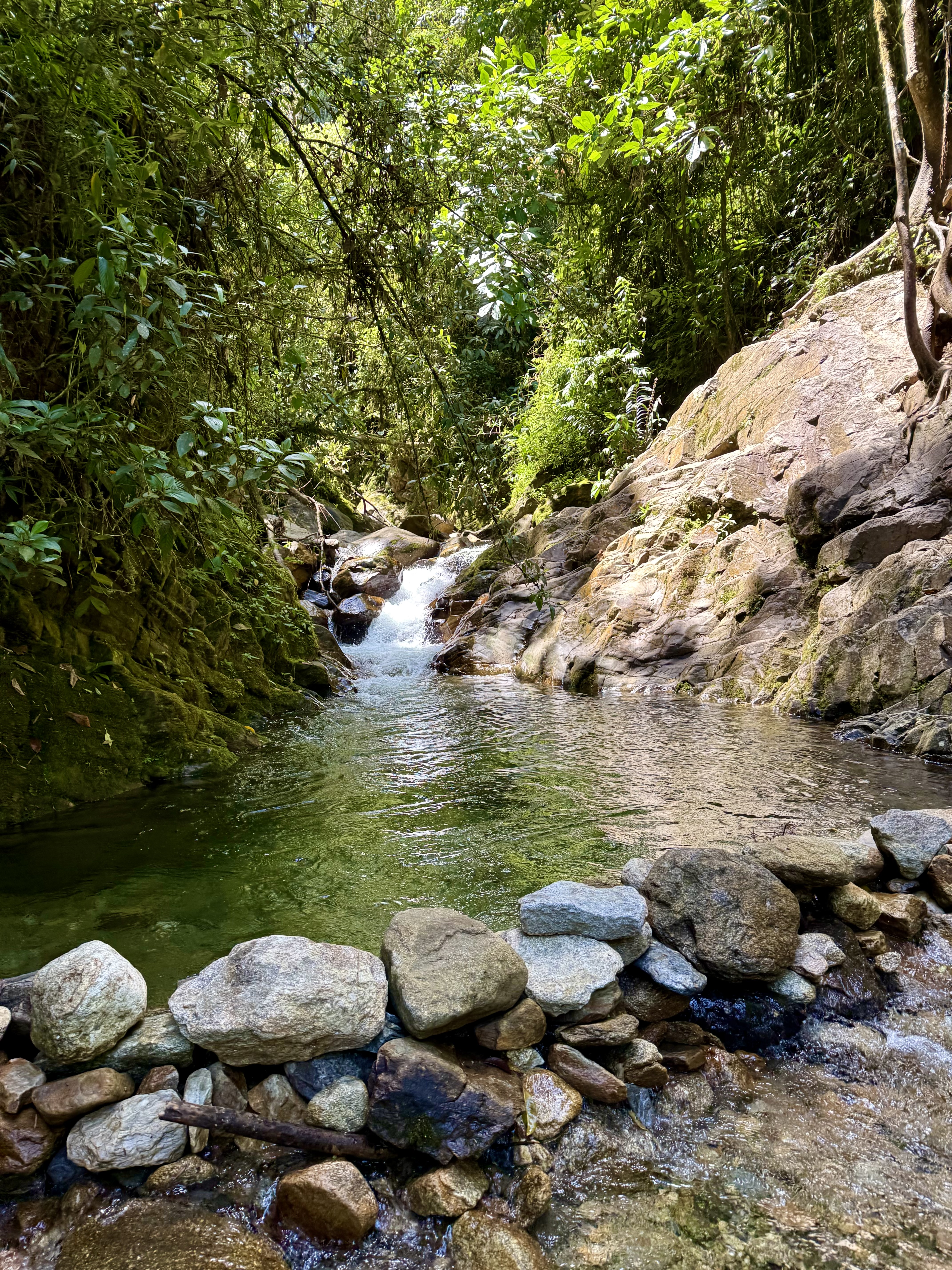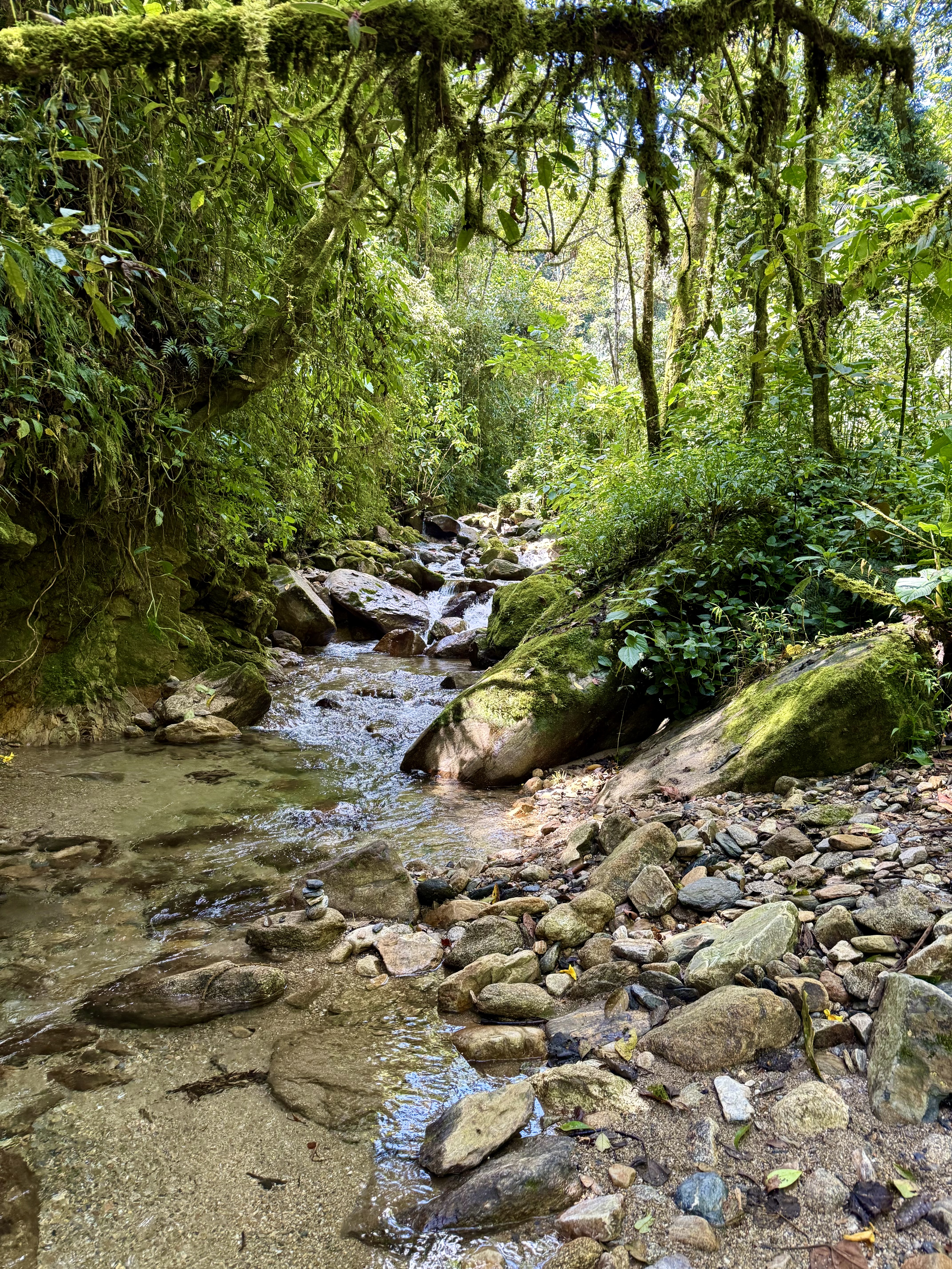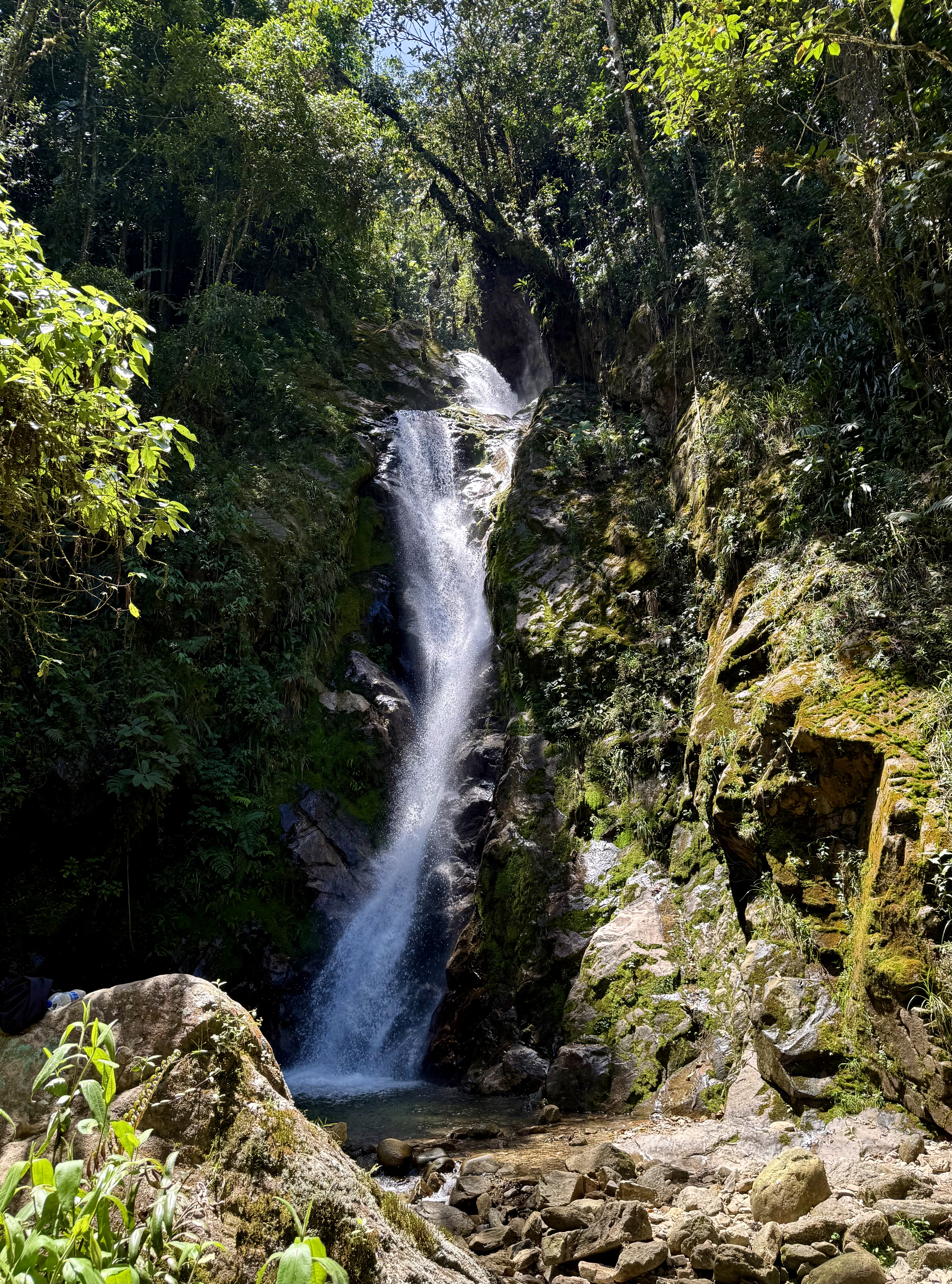 The meeting point for the tour was just a few minutes’ walk from where I was staying in El Poblado, a tourist section of Medellín. The group of five people, including me, met about 9am. The others were from NYC and Quebec, so the tour was conducted in English. We drove for a little over a half hour up into the mountains surrounding the city, and I was once again glad I was not responsible for driving on the steep narrow windy mountain roads. Along the way, we picked up the second guide, Eduardo, who apparently lives in a nearby mountain village. As with the waterfall hike in El Salvador, there is a guide in the front and one in the back. We finally stopped at a finca, where I was able to rent a pair of rubber boots. Sebastian, the first guide, warned us that we would be crossing streams with water up to our knees, and as I didn’t want to get my hiking shoes soaked, I was glad that the goulashes were available, as was a walking stick. We headed out from the finca on a flat path for a few hundred meters, before coming to a series of stairs. Along the way, Sebastian stopped at a plaque explaining that the trail we were on has been used for over 2,500 years and to explain some of the vegetation we were encountering, including the trees whose leaves or seeds have psychedelic properties. After descending a few hundred stairs, we came to the real beginning of the rainforest trail. From here to the waterfall took about an hour and we did crisscross the stream innumerable times. The sides were covered with various sized boulders, some of which were very slippery, and I was glad I had the walking stick for added balance. At times, I also needed Eduardo’s helping hand to get up and not slip. At one place a rope was tied to a tree, and we had to scramble up some steep boulders; it wasn’t nearly as bad as the climb in El Salvador, but still a bit of a challenge. When we got to the waterfall another group was just leaving. It is customary to sit under the falling water for at least seven seconds, and if one is really a masochist, seven minutes. The water is freezing! I cheated and just did a Pachamama ritual as we were in her midst. We stayed at the waterfall for about a half hour before returning the same way to the finca. The tour ended back where we started about 1:30pm. It wasn’t a long tour, but it was absolutely delightful. The rainforest around Medellín is magnificent, as are the views of the city from the mountains!