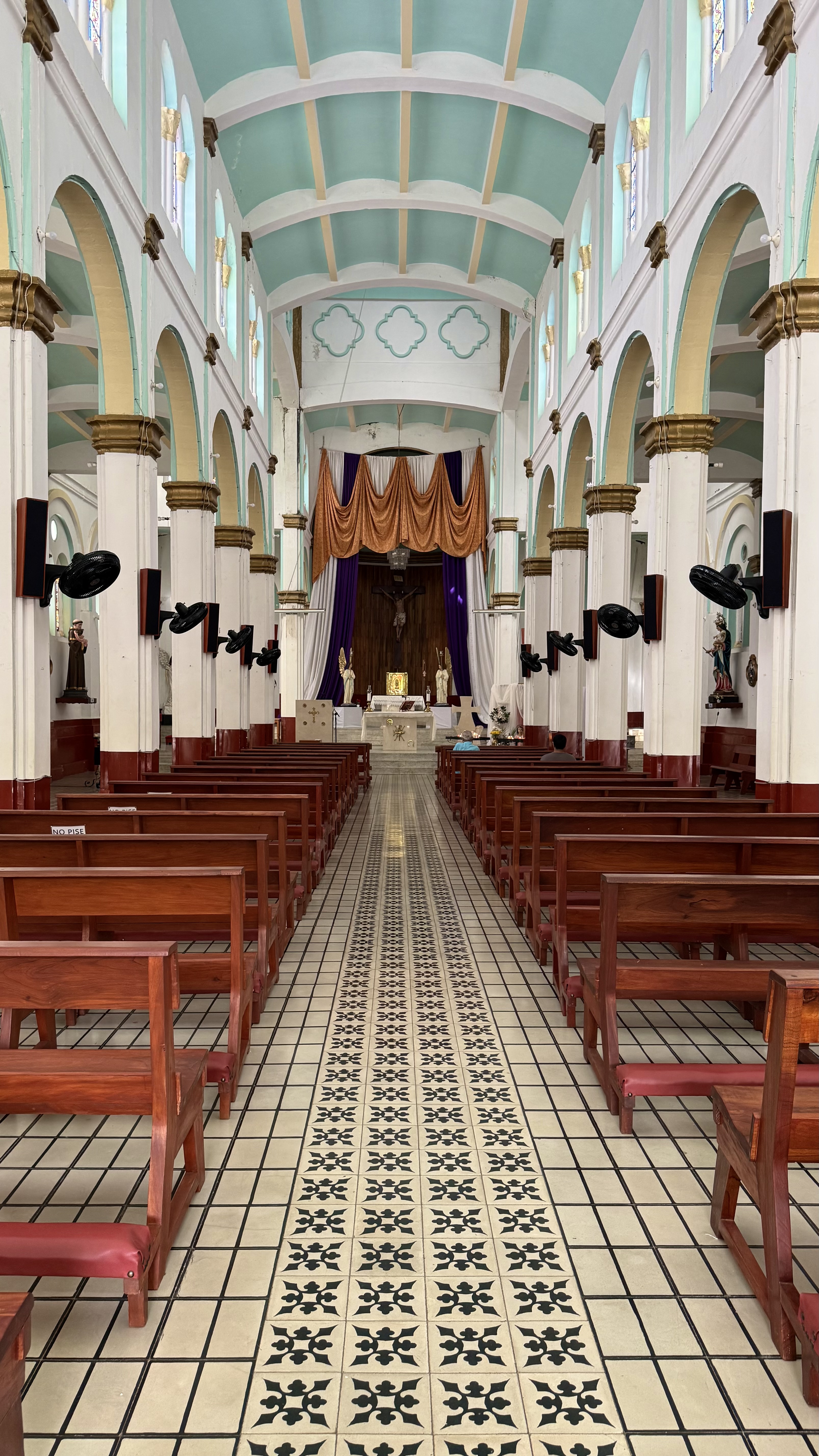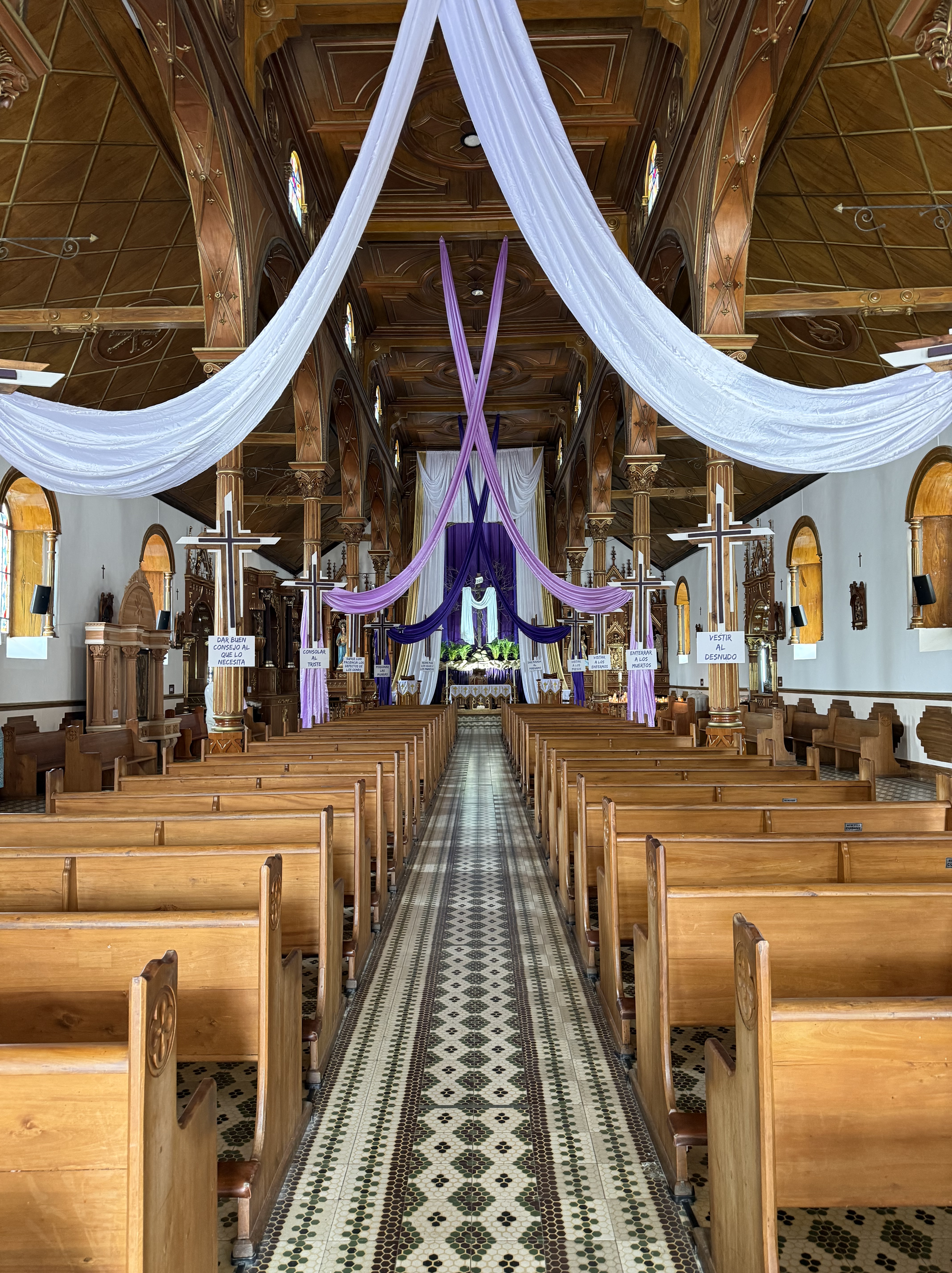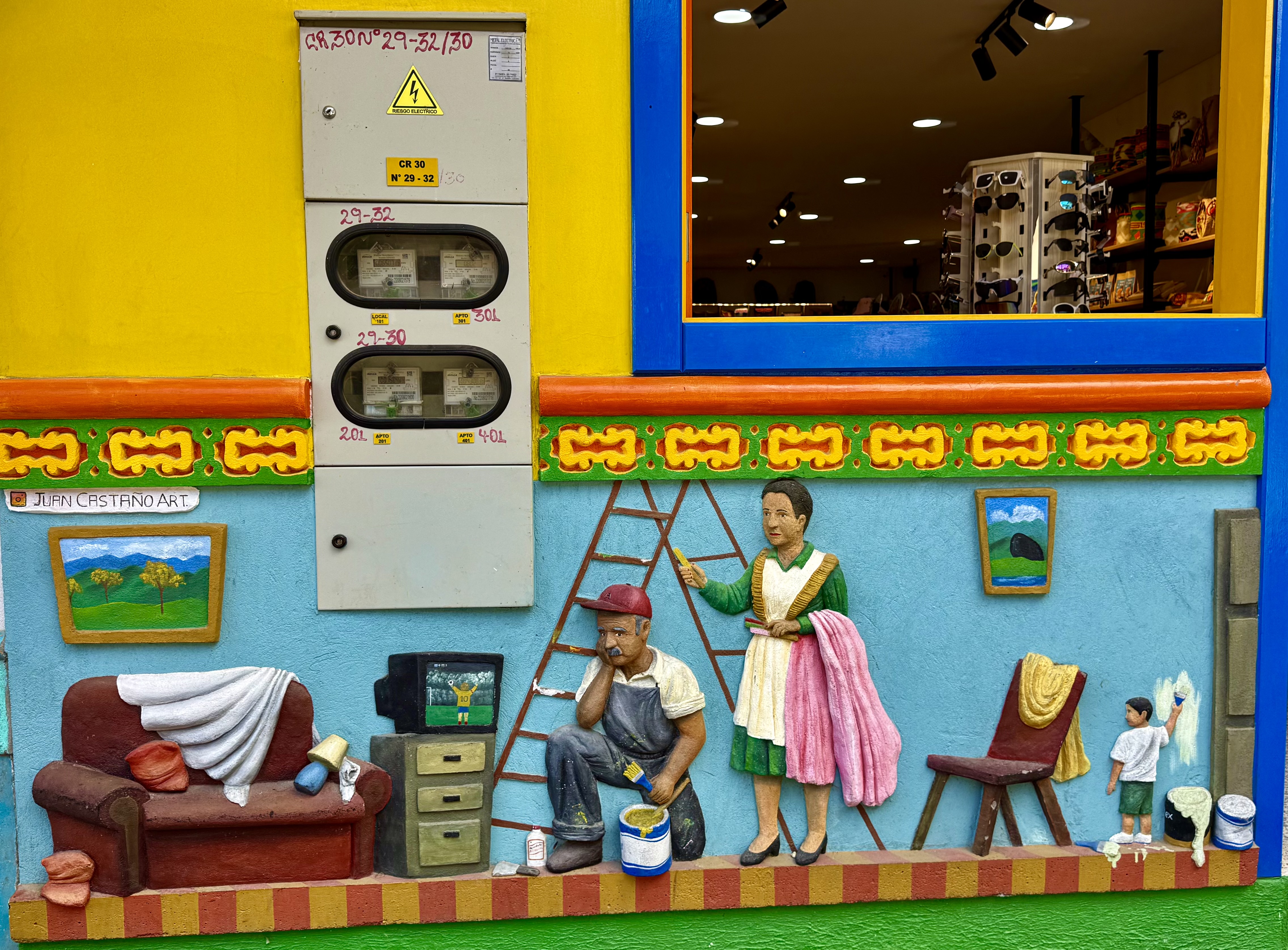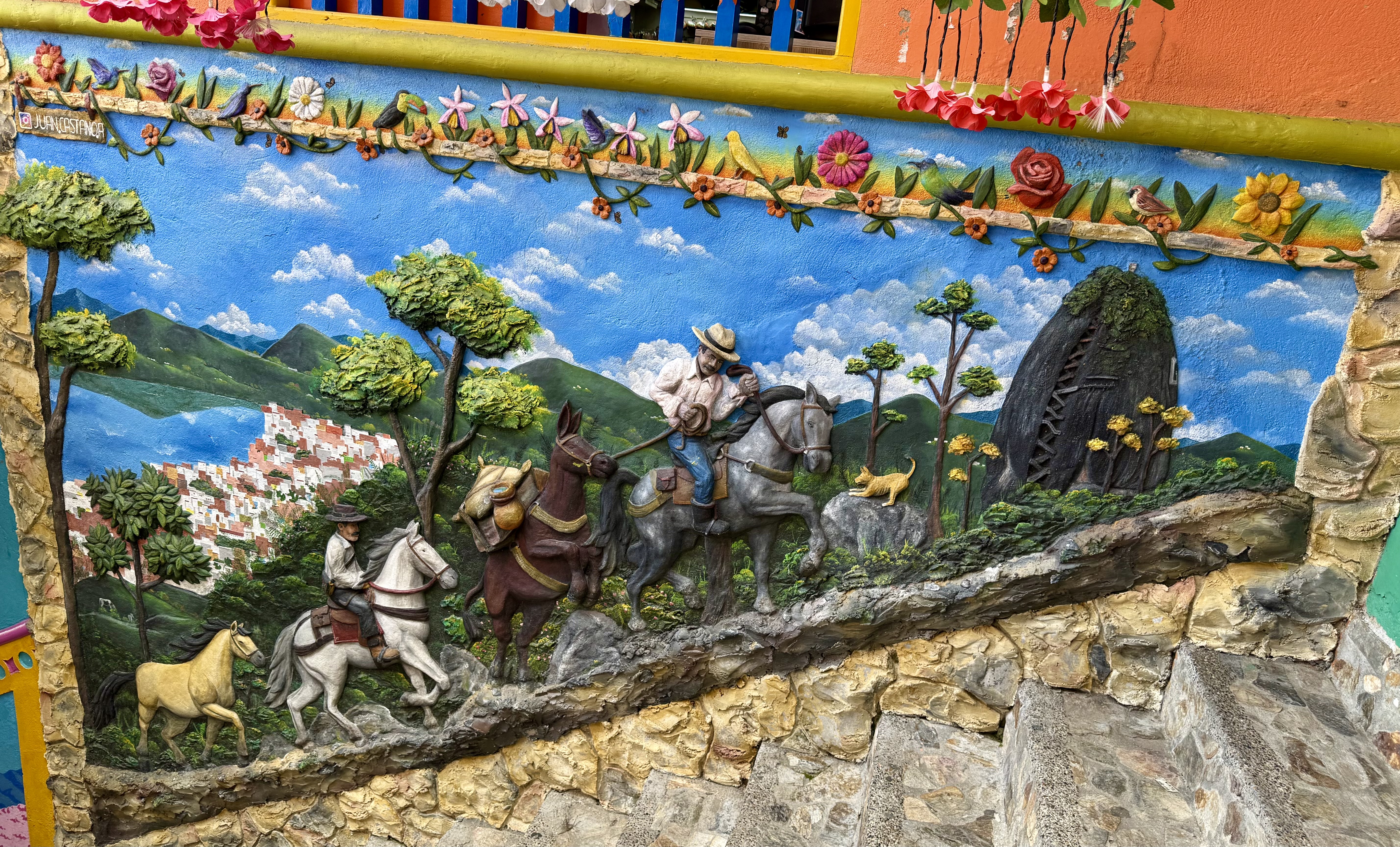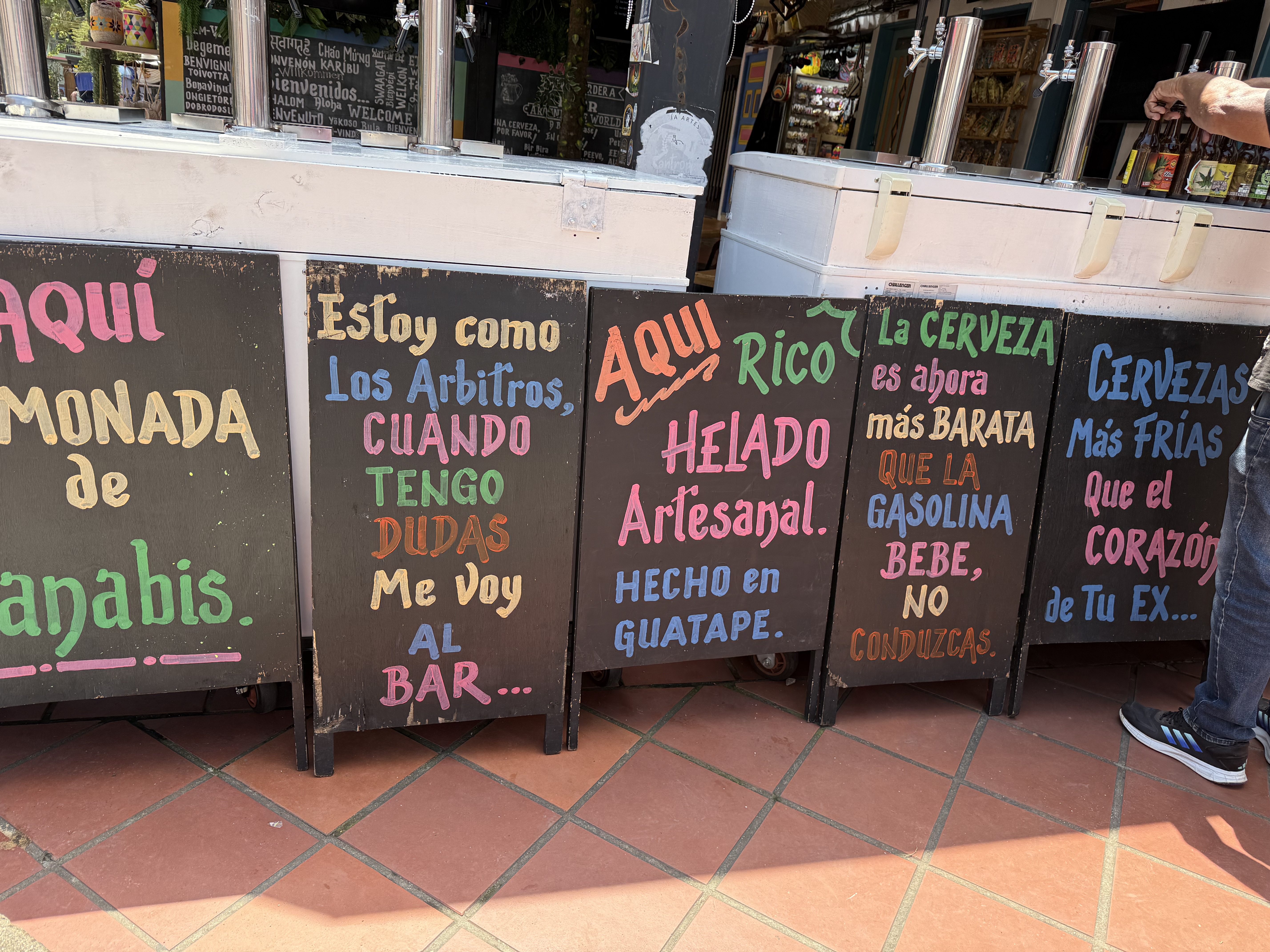 After that we stopped in Guatapé town, which is a colorful very touristy village. The people who live and work here have painted and sculpted reliefs on the bottom of the houses and shops that relate to the work that is done by the inhabitants. Some of these are true works of art. Even though it is a tourist town, it was delightful. We sampled some local coffee and had a coco tea, which I hadn’t had since Peru. There are a number of humorous signs, some selling cannabis beer and others that simply want to entice visitors to drink. On the other end of the spectrum, the church was decked out in preparation for Holy Week with purple banners. The symbol of the town is the lamb, for the Lamb of Christ, and is portrayed on the base of the fountain in the main square as well as in many other places throughout the village.