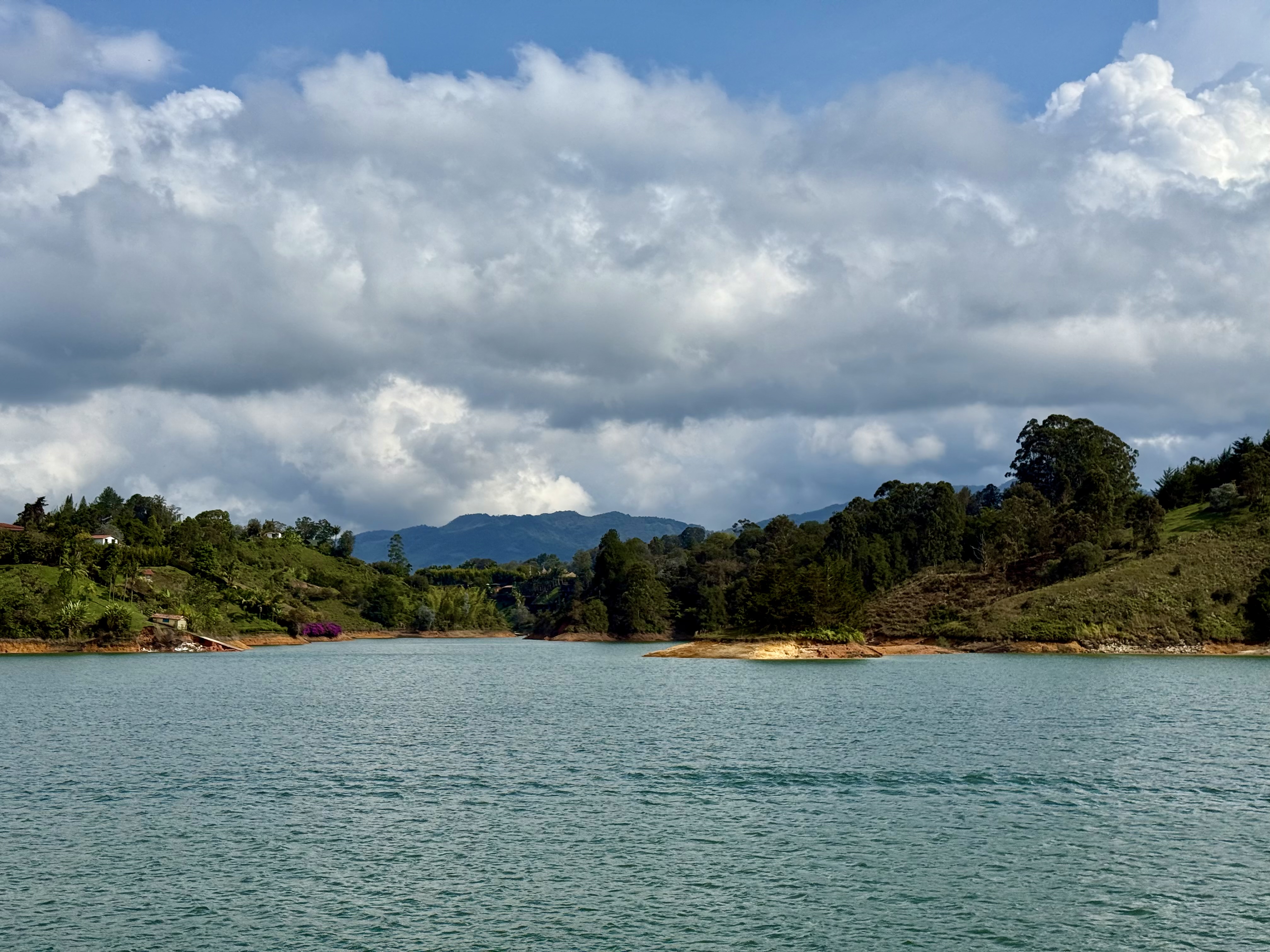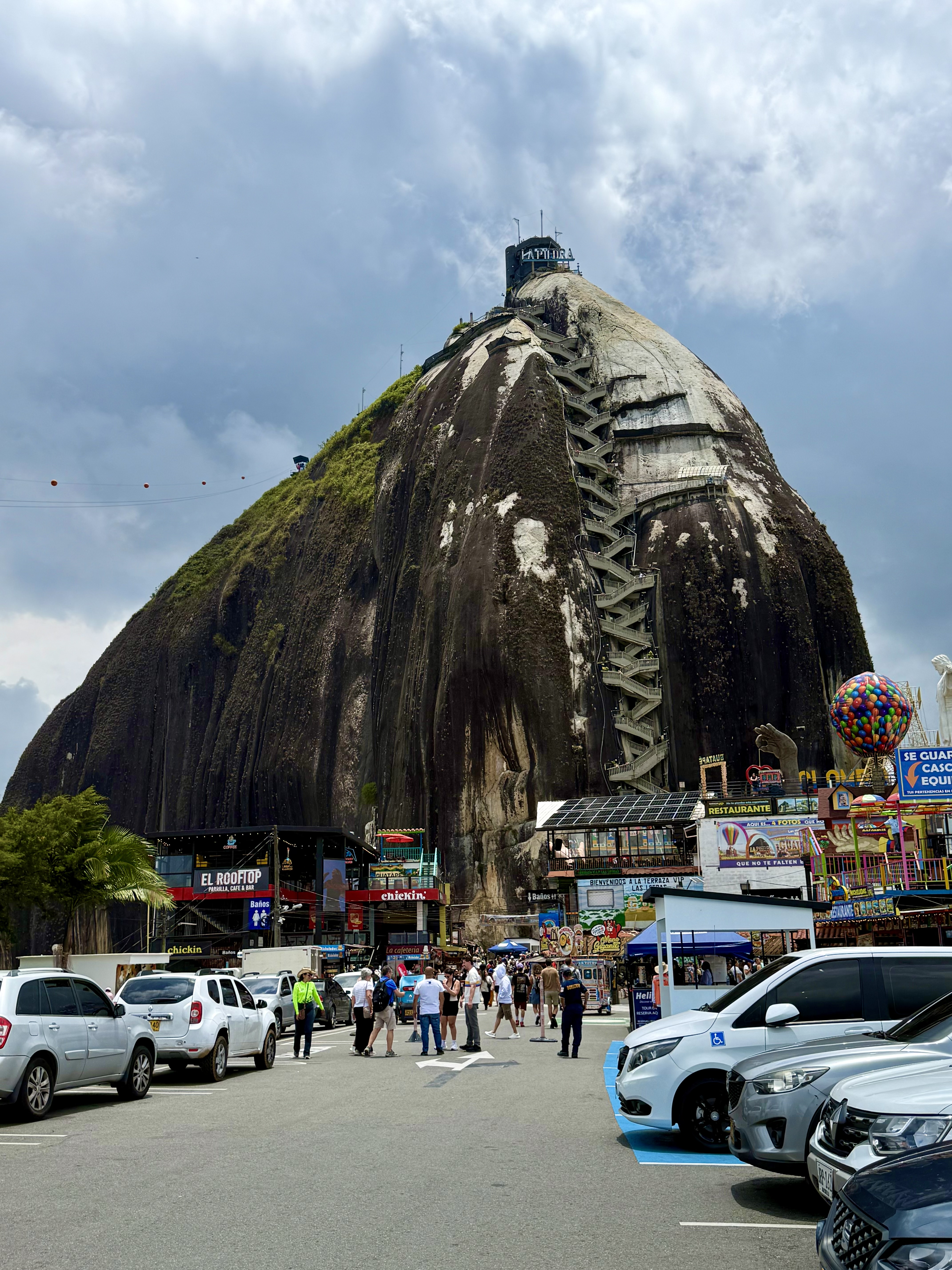 The first tour was to Guatapé. A big white bus arrived at the guesthouse at 7am and I was surprised at how large it was. After we had picked everyone up, though, it was completely full. It took a little over two hours before we made our first stop, which was for breakfast. It was a typical Columbian meal of scrambled eggs, rice, a tortilla and a small roll. They also served coffee with milk, which was what I was looking forward to. Antioquia is known for its coffee. On the way, we passed Cerro Tusa, which is said to be the tallest natural pyramid on earth. I could only get a bad photo through the bus window in the early morning light.