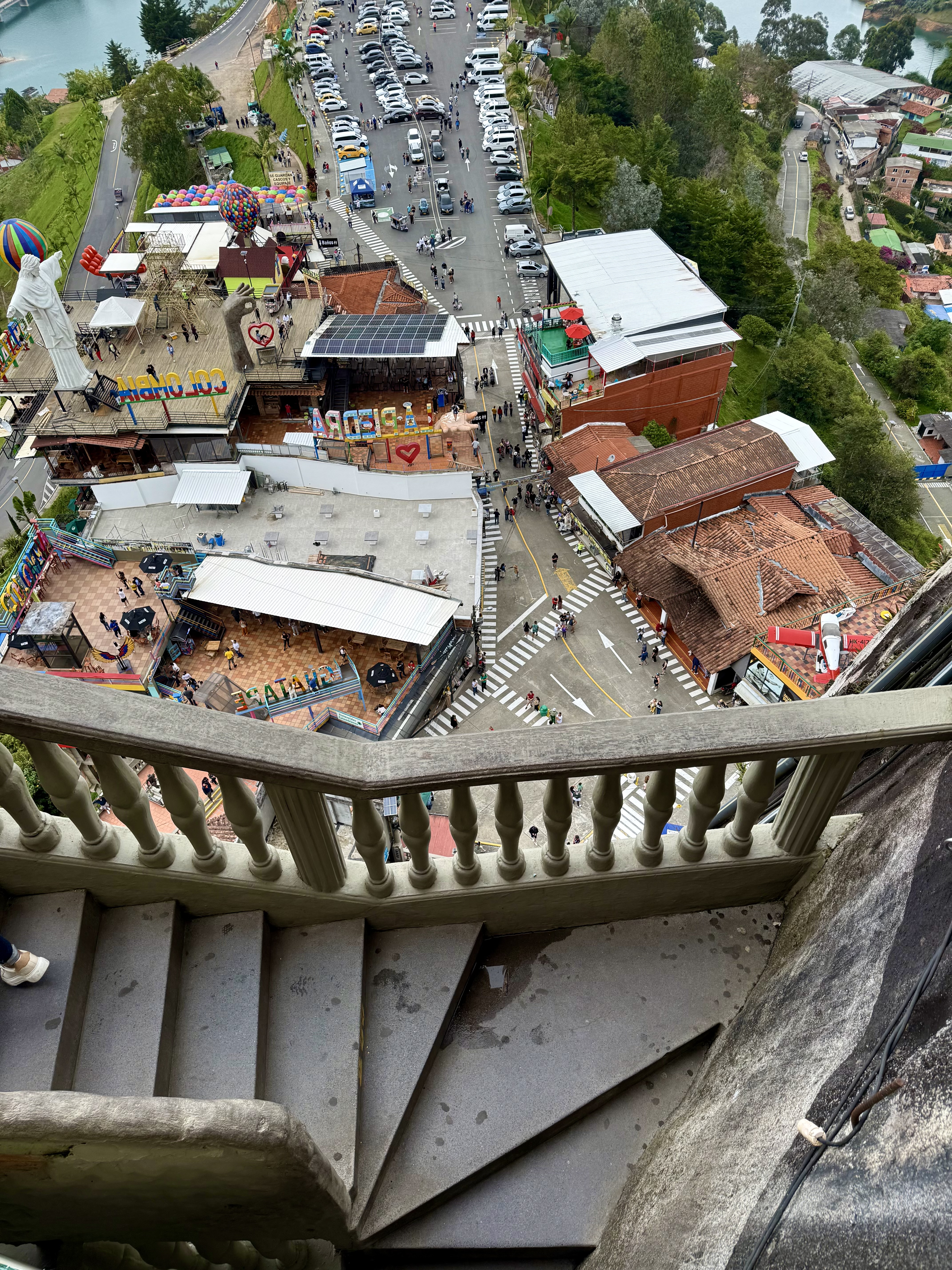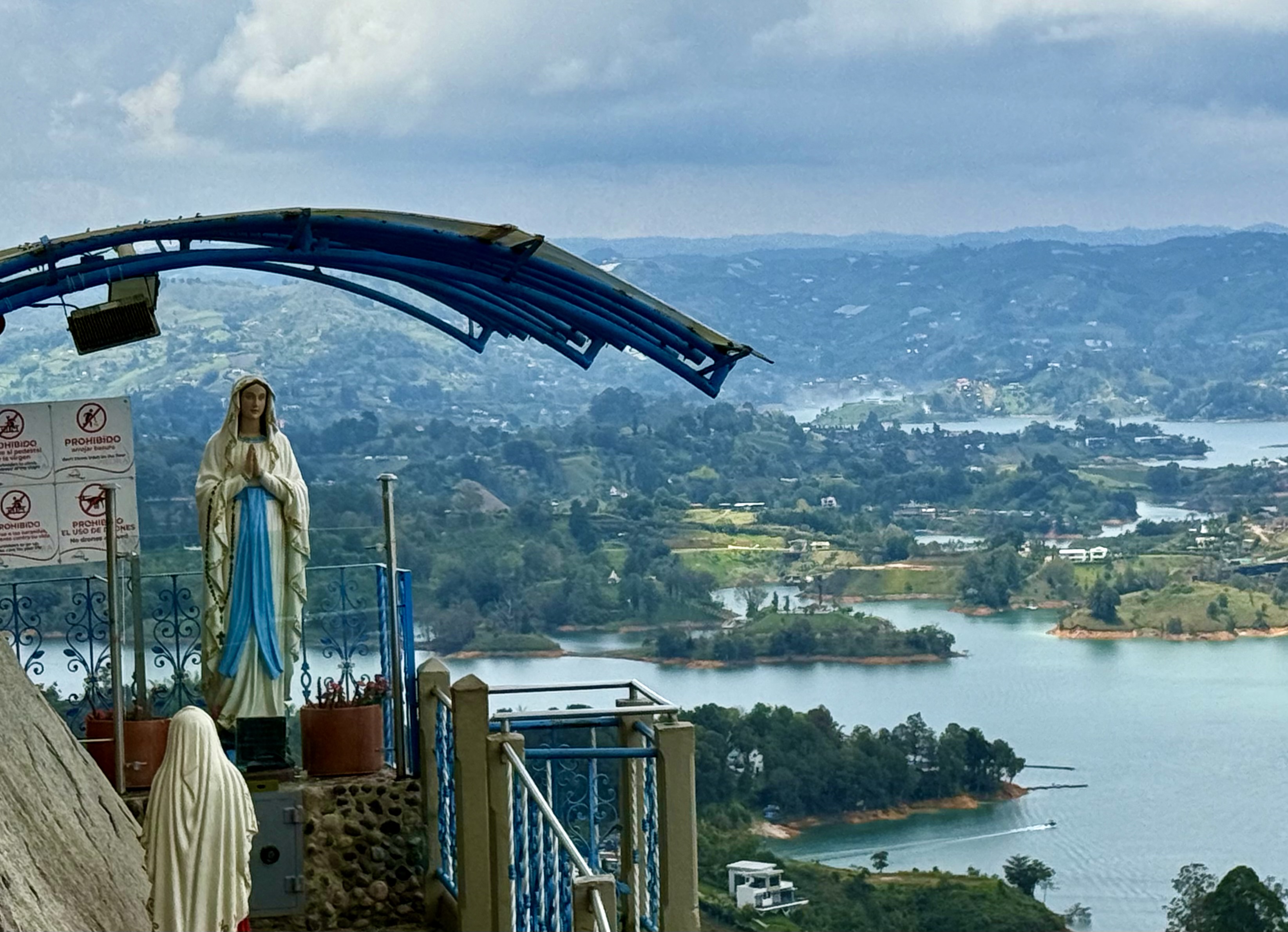 From Guatepé it is a five-minute drive to la Piedra del Peñol. This massive rock has 721 steps to the top and is the main reason for the tour. Steps zigzag steeply up a split in the rockface and it challenges those who want to climb up. It takes around 15- 20 minutes, depending on how many people are stopped ahead of one. I confess, I must be out of shape as I did have to stop to catch my breath a couple of times. The part that one sees is only a fraction of the mountain itself, which is buried beneath the ground, much the way a volcano is. The Piedra is private property and does not belong to the government. It is owned by the heirs of the first men who climbed the rock together in the 1950s in search of pirate treasure. They didn’t find anything the pirates left but have made a goldmine out of tourism. The view from the top is spectacular. One can see the entire reservoir as it winds among islands and farmlands with the hills and mountains in the background. Back on the plaza where the stairs start is a platform with a tall Jesus statue. Halfway up the stairs there is a smaller one of the Virgin.