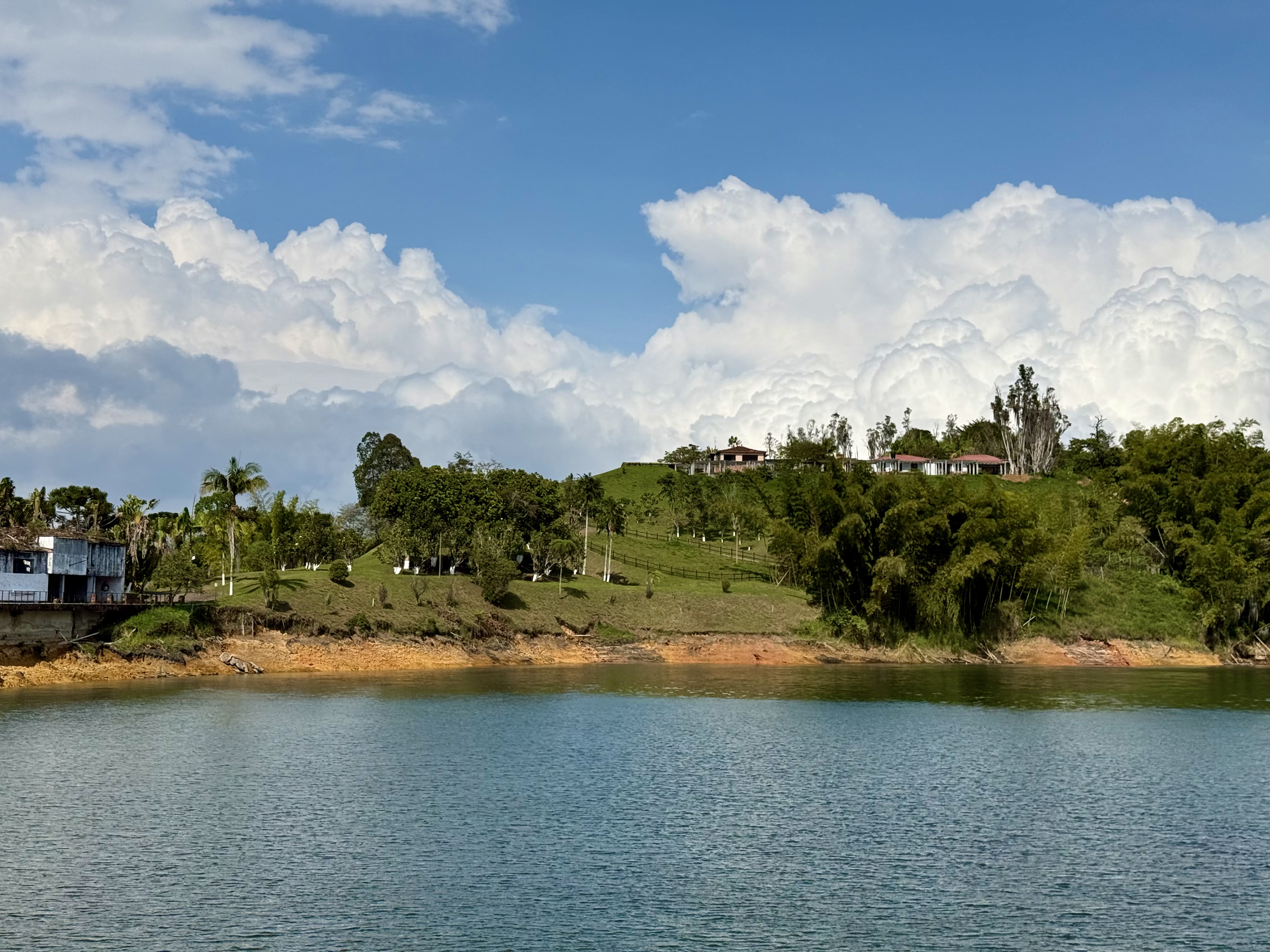 We then walked down the hill to a boat that took us on a 45-minute tour of a small section of the lake. On the way we passed by one of Pablo Escobar’s former villas; this one was bombed in the 1990s by a rival gang, whose name, according to the guide, translates into ‘those who were persecuted by Escobar’. On the top of the rise above his villa are the remnants of his former stable. He must have had quite a few horses here by the size of the structure. Today, the houses around the lake/reservoir are owned by wealthy Medellínos or other well-heeled locals. The architecture on some of them is stunning. Electric boating, kayaks and paddle boards are allowed, but swimming is not due to the currents created by the mix of different water sources flowing into the reservoir, not the least of which is the Rio Negro. A bridge marks the entry of the river into the reservoir. In Brazil, the Rio Negro flows directly into the Amazon; when the two meet their distinct colors flow side by side for more than six kilometers.