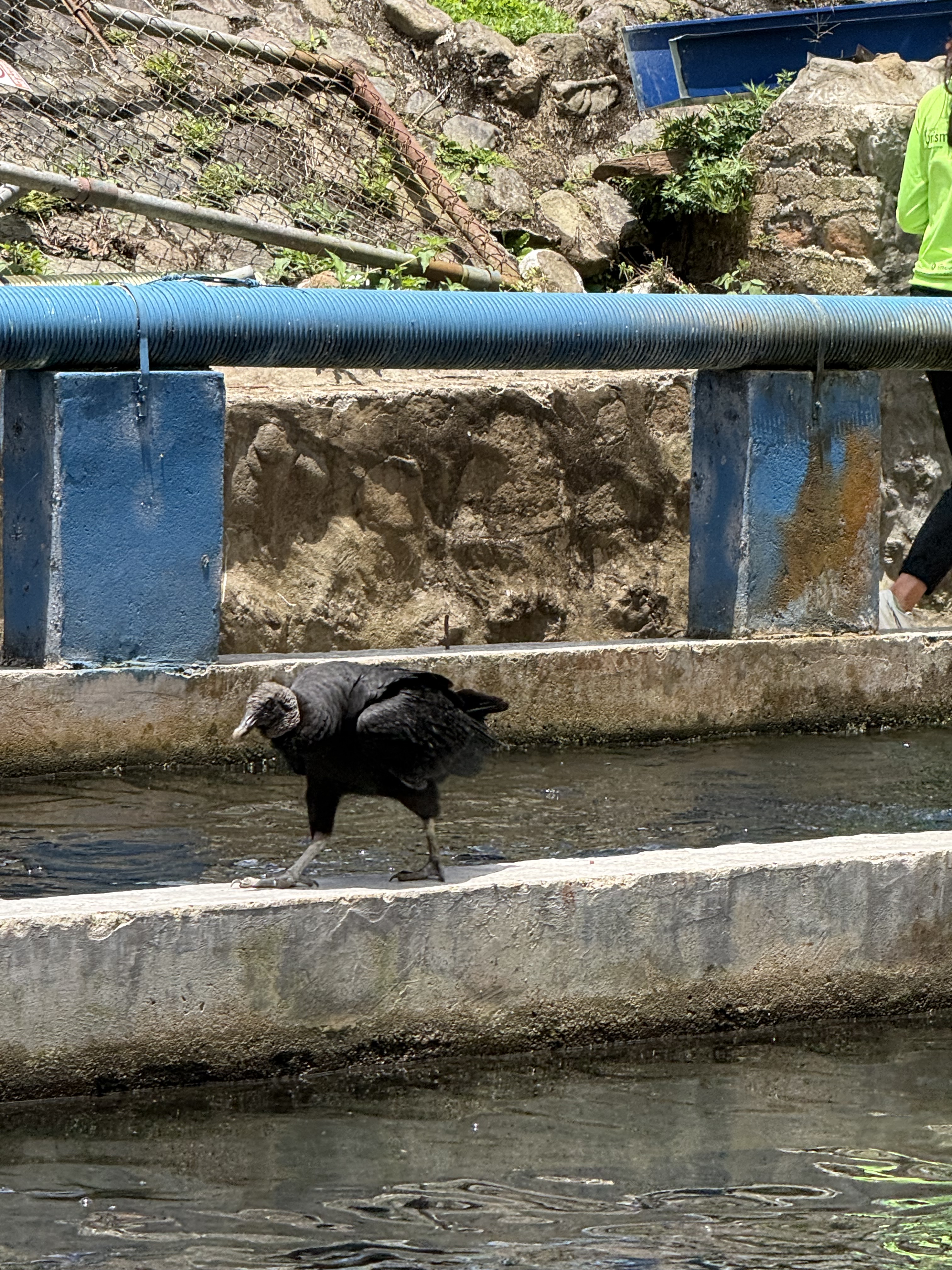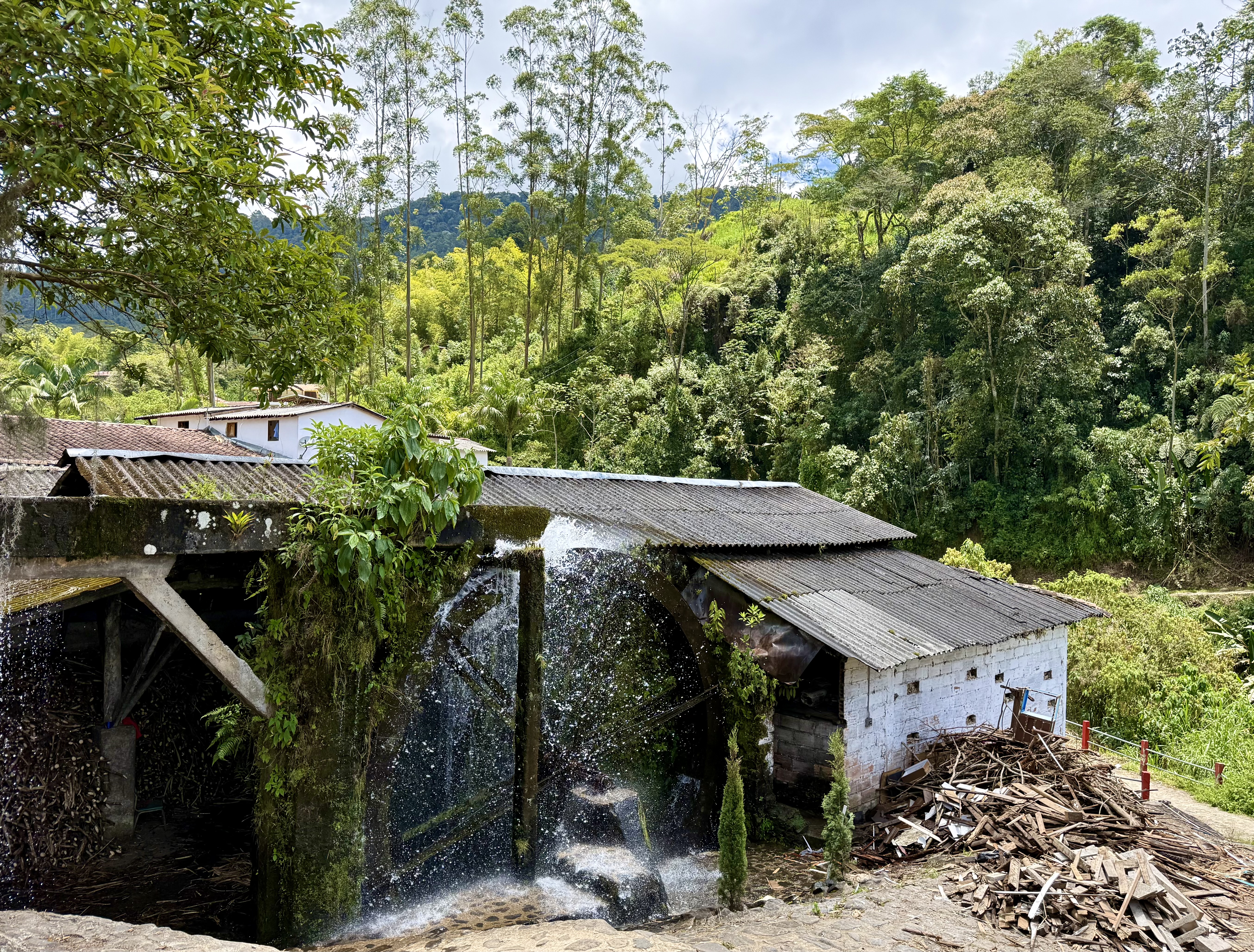 Before we stopped in the center of Jardin, we had lunch (included in the tour) at a trout farm, where I saw a vulture right by the fish tanks waiting for his opportunity. The trout farm had an ancient water wheel that kept the water in the tanks fresh. Nearby was a stream with a couple of small waterfalls flowing down the hillside. In town, we stopped at a place selling sweets, and they gave each of the tour participants a coconut rice pudding dish to taste. After the sweet, we had some free time to walk around, which was when I went to the museum, found a zipline site for people to slide or bike across, and people watched in the plaza. It seemed every third man had a cowboy hat on. Even if Jardin is a tourist mecca for Antioquia, it is still the commercial hub for coffee and plantains.