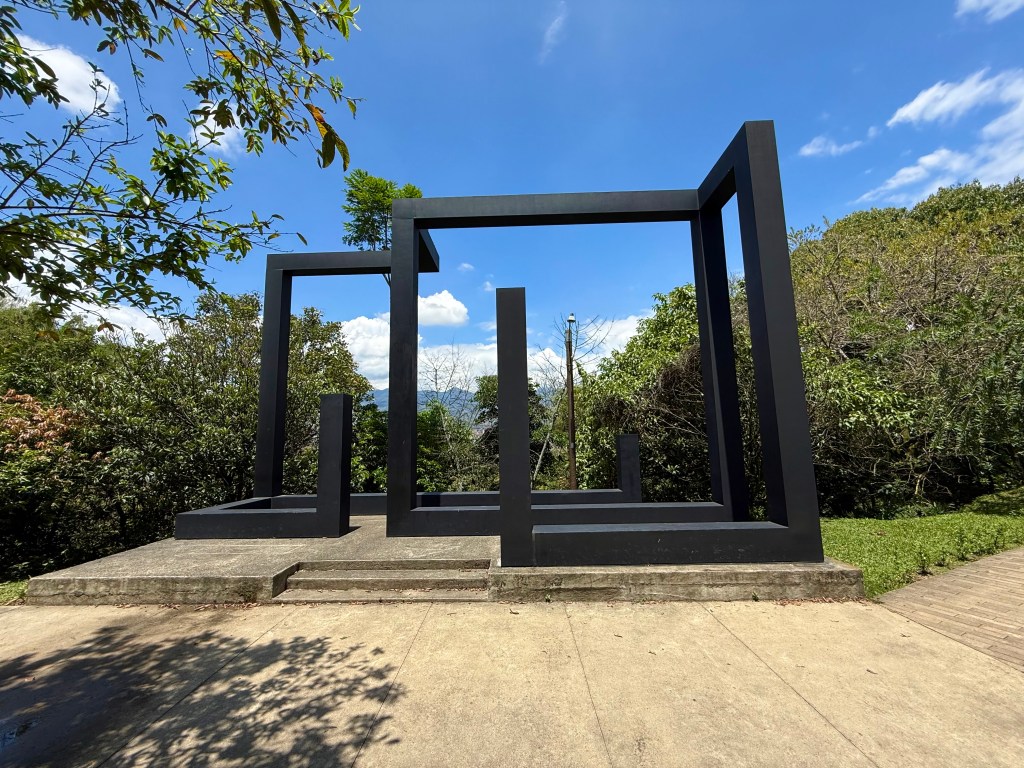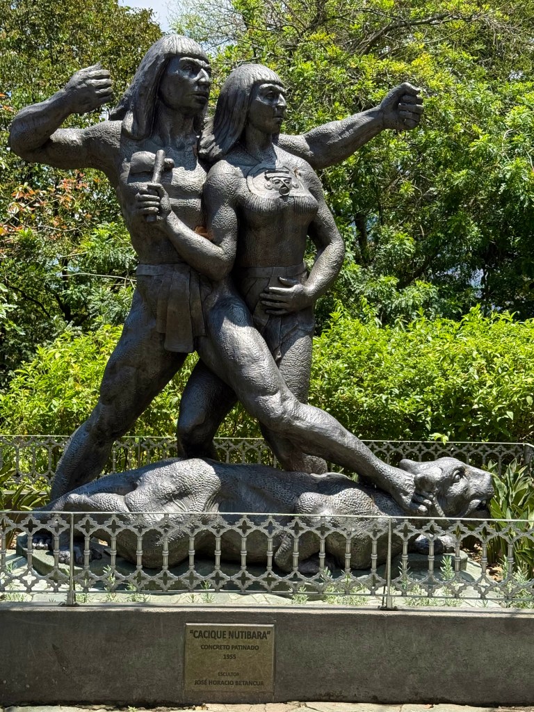From Comune 13 we drove to Cerro Nutibara and the small hilltop village of Paisa in the center of Medellín. This is a hill oasis of greenery with a tourist village site at its apex. On the sides of the hill are walking paths with various designations, e.g., one dedicated to sculpture, another to wildlife and so on. As I didn’t have much time because the tour was coming to an end, I only did the sculpture path as I did want to walk around the little village as well. The sculptures were all modern conceptual art, some very interesting. Two that I especially liked were the multi-colored one by Otto Herbert Hajek and the iron structure by Carlos Rojas. There is a museum in the village that I, unfortunately, didn’t have time to visit it. This hill deserves at least a couple of hours to explore the various paths and the museum. There is a small chapel, and I was able to get a photo of it.