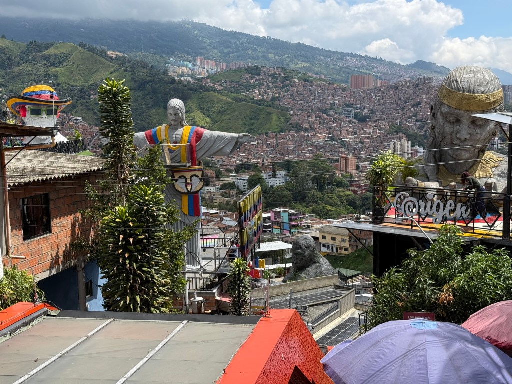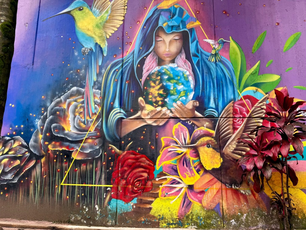 Murals by different artists line the pathways, some of which relate to living in the community, others with depictions similar to that on velvet art, and others that are much more original. A few large sculptures are also visible from various viewpoints up and down the mountainside. One fairly recent addition is a Jesus statue, where the owner charges $3 for people to take their photo with the statue. His is one of the many ways locals are finding to break out of a cycle of poverty that formerly defined the community.