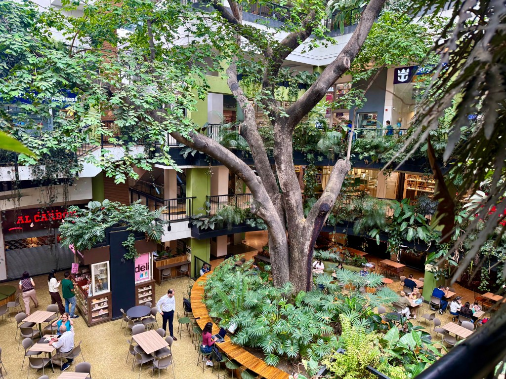 Medellín is a beautifully lush vibrant city. Trees and bushes line the streets and sidewalks giving a park-like atmosphere to all but the most congested areas. I stayed in Poblado, which is where many tourists stay, and was delighted with the open-air outdoor cafes, restaurants, and bars. The first morning, I needed to get something fixed on my new computer and went to a local Apple store in the Oviedo mall. Even the food court had a large tree in its center.
