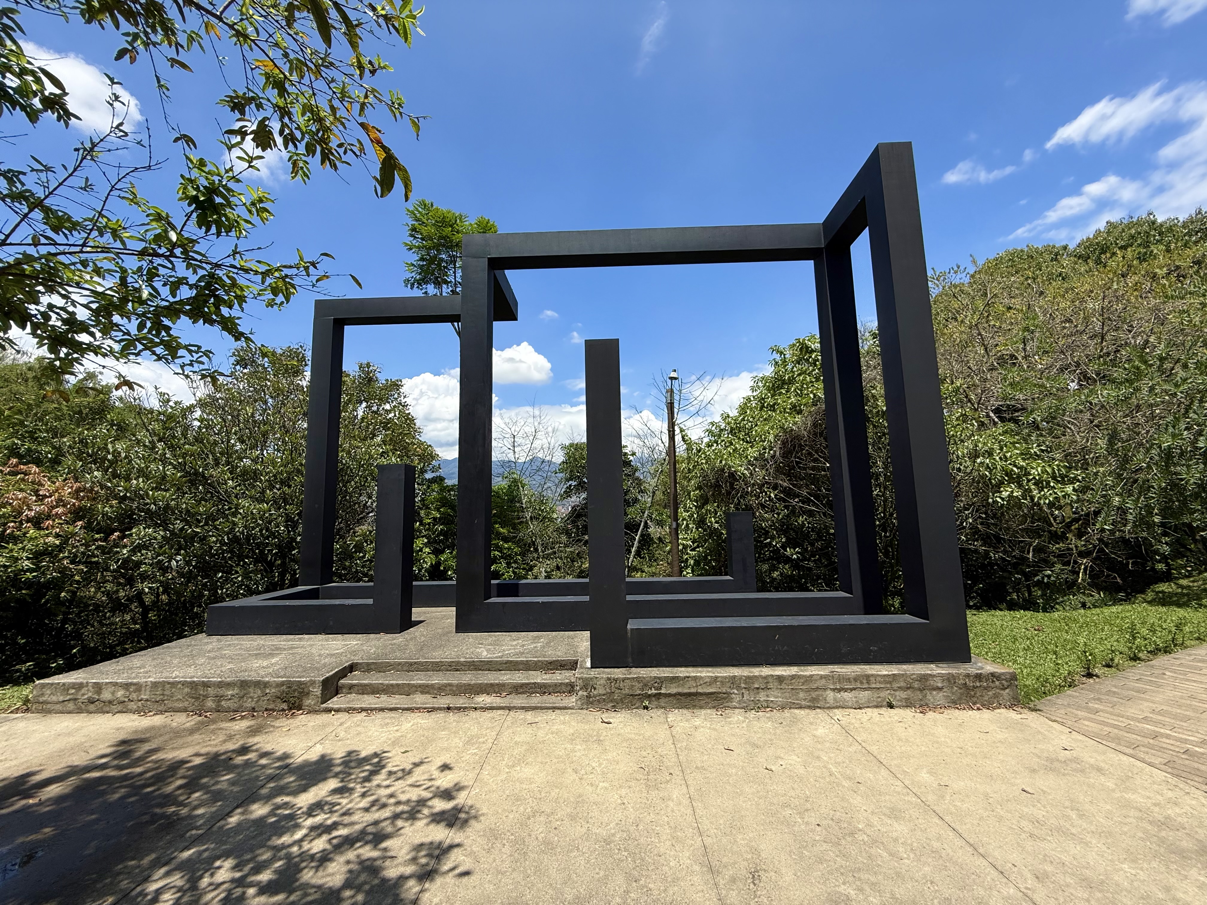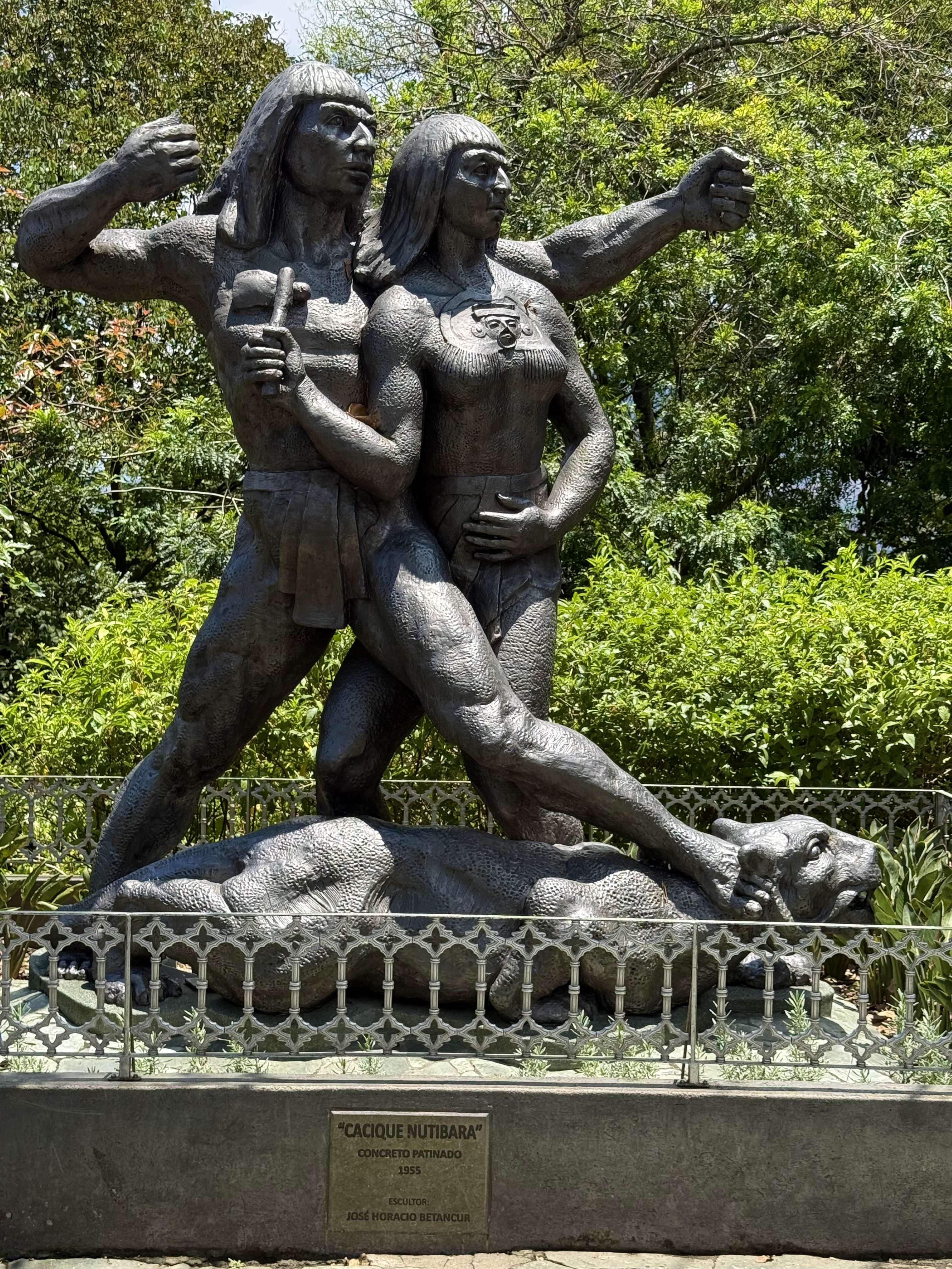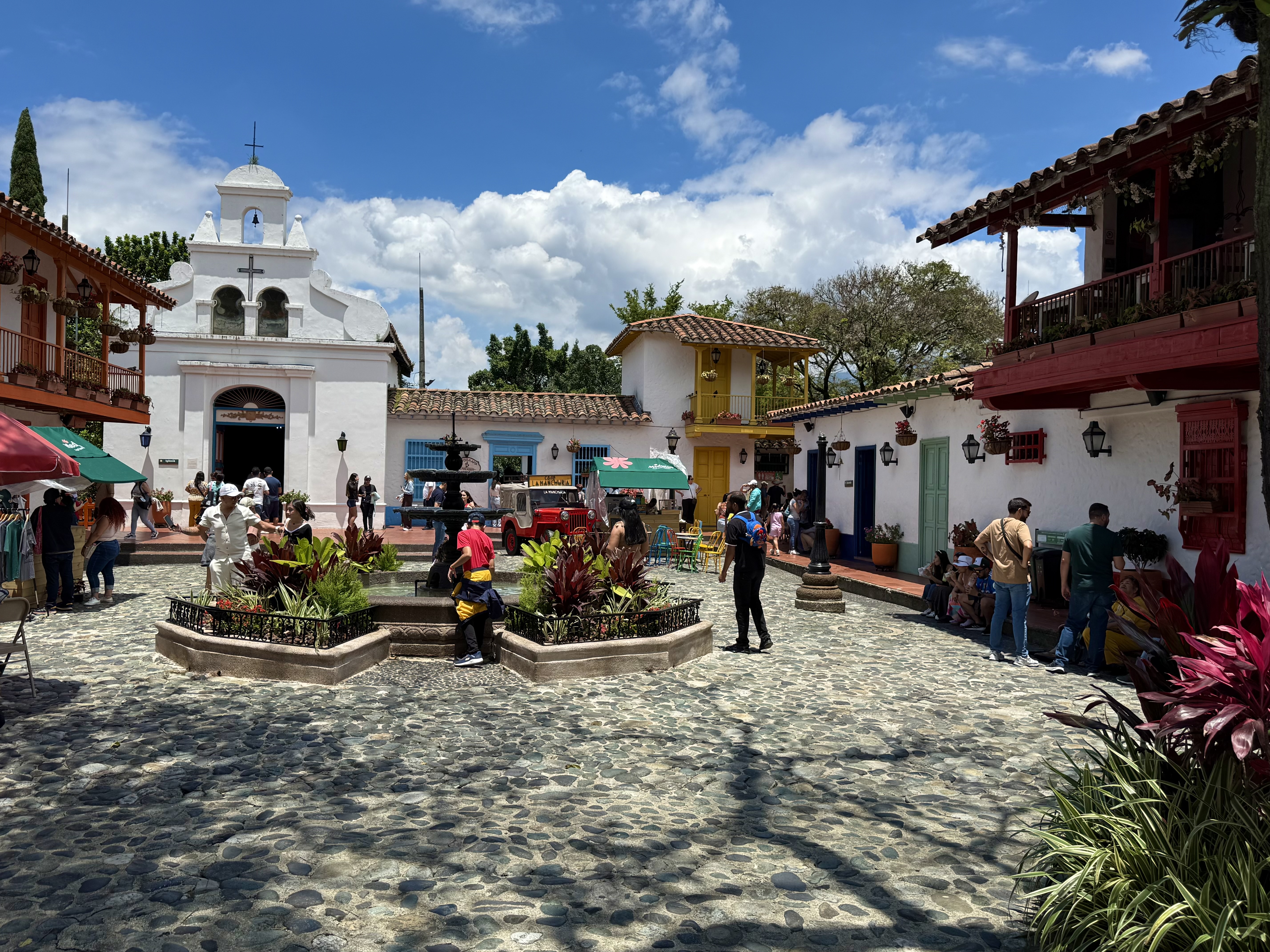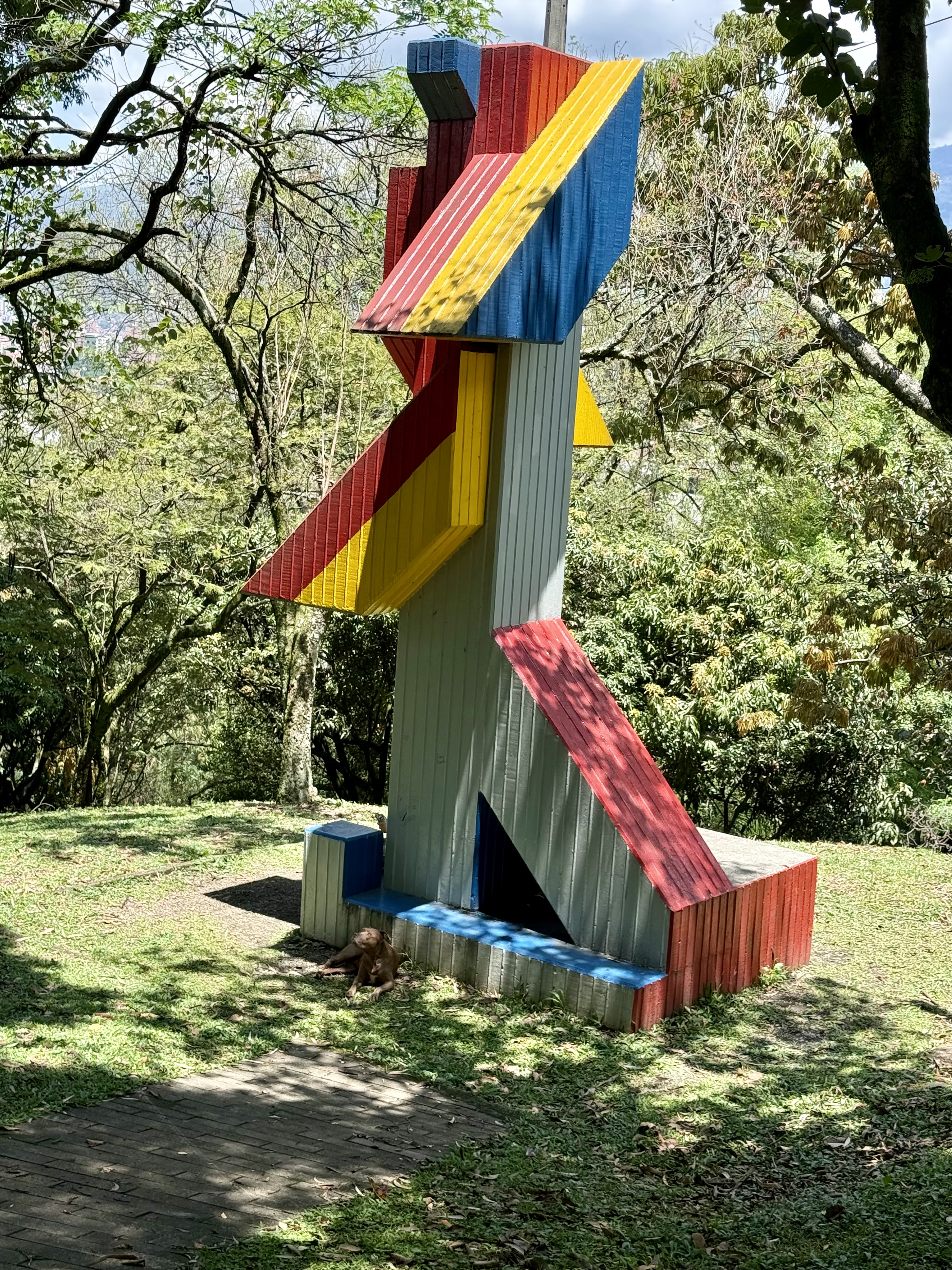 From Comune 13 we drove to Cerro Nutibara and the small hilltop village of Paisa in the center of Medellín. This is a hill oasis of greenery with a tourist village site at its apex. On the sides of the hill are walking paths with various designations, e.g., one dedicated to sculpture, another to wildlife and so on. As I didn’t have much time because the tour was coming to an end, I only did the sculpture path as I did want to walk around the little village as well. The sculptures were all modern conceptual art, some very interesting. Two that I especially liked were the multi-colored one by Otto Herbert Hajek and the iron structure by Carlos Rojas. There is a museum in the village that I, unfortunately, didn’t have time to visit it. This hill deserves at least a couple of hours to explore the various paths and the museum. There is a small chapel, and I was able to get a photo of it.