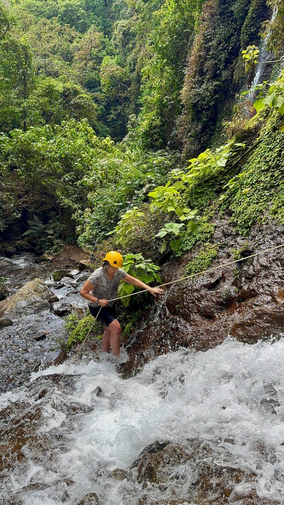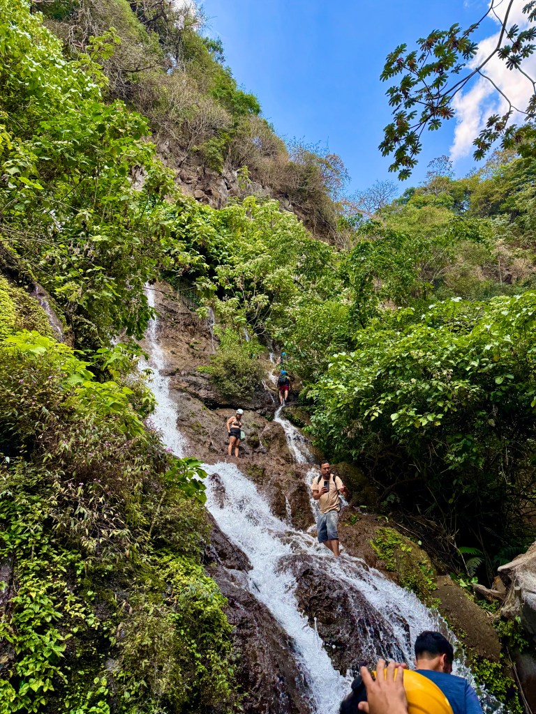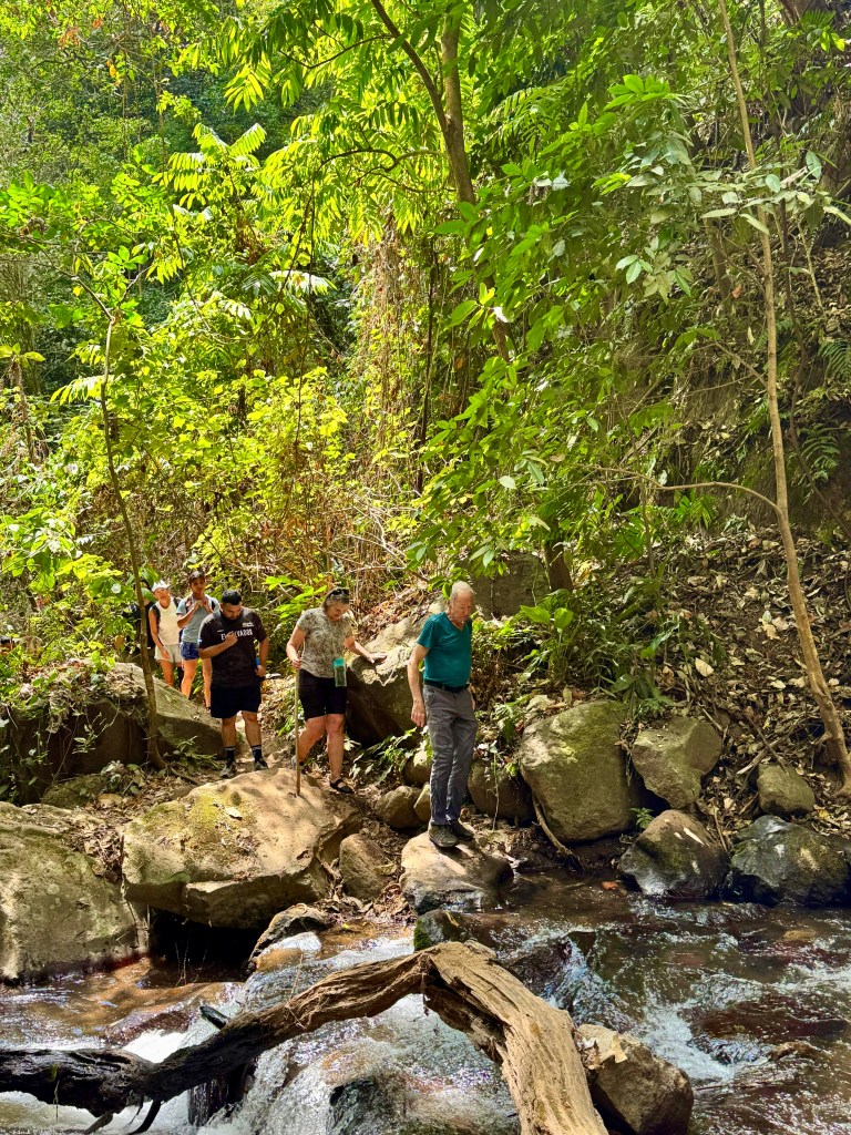 The next day, we booked an excursion to the Juayua waterfalls. The advertisement for the excursion said it would be a mild hike to seven waterfalls – it didn’t say anything about having to scale number five to get to the remaining two! I saw the cliff and thought my heart would stop. As there was no going back, I had to crawl up with the water crashing over me as I tried to find foot and hand holds in the rock. Lots of other people had done this before me, but they were considerably younger with good knees and hips! With the help of the guides, I did make it up, drenched but nonetheless successful. It was wonderful being in a rainforest again, and the streams we crossed were warmer than anticipated, even though standing under the waterfall was like having a cold shower.