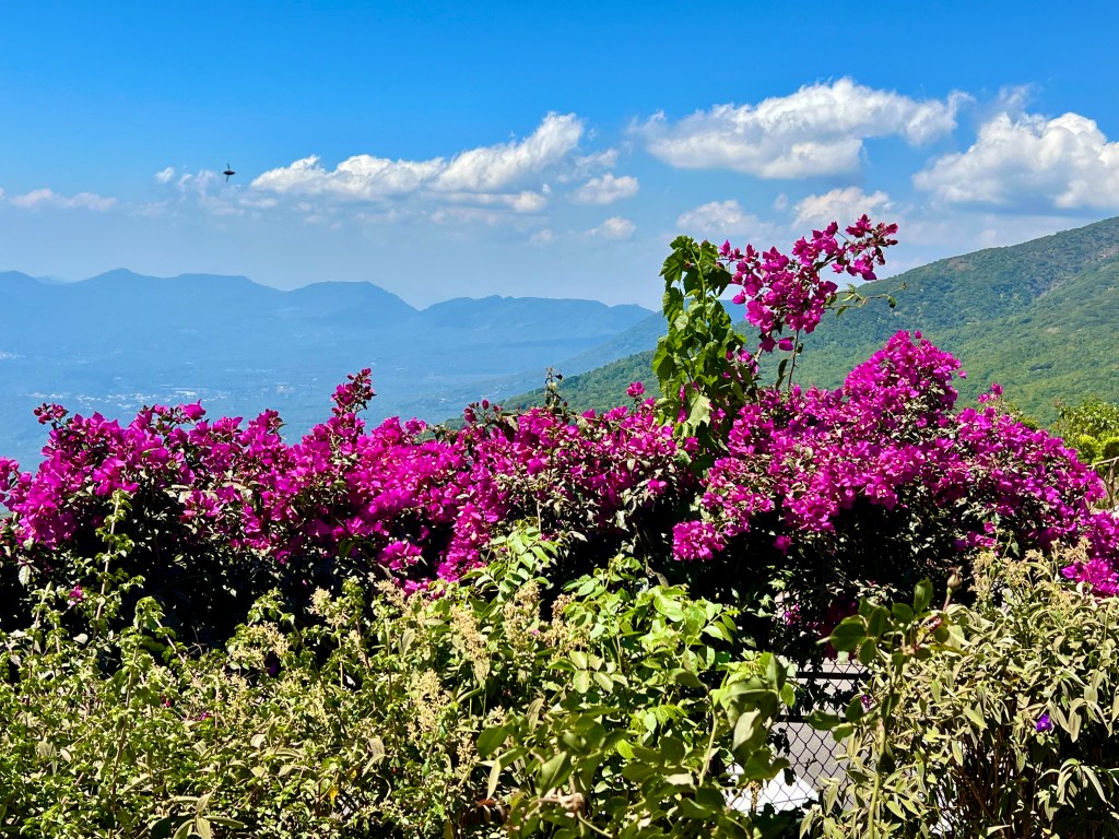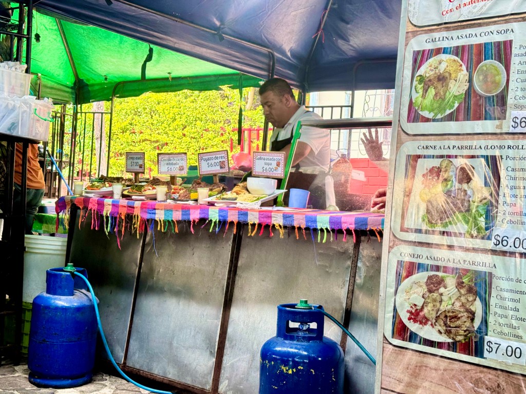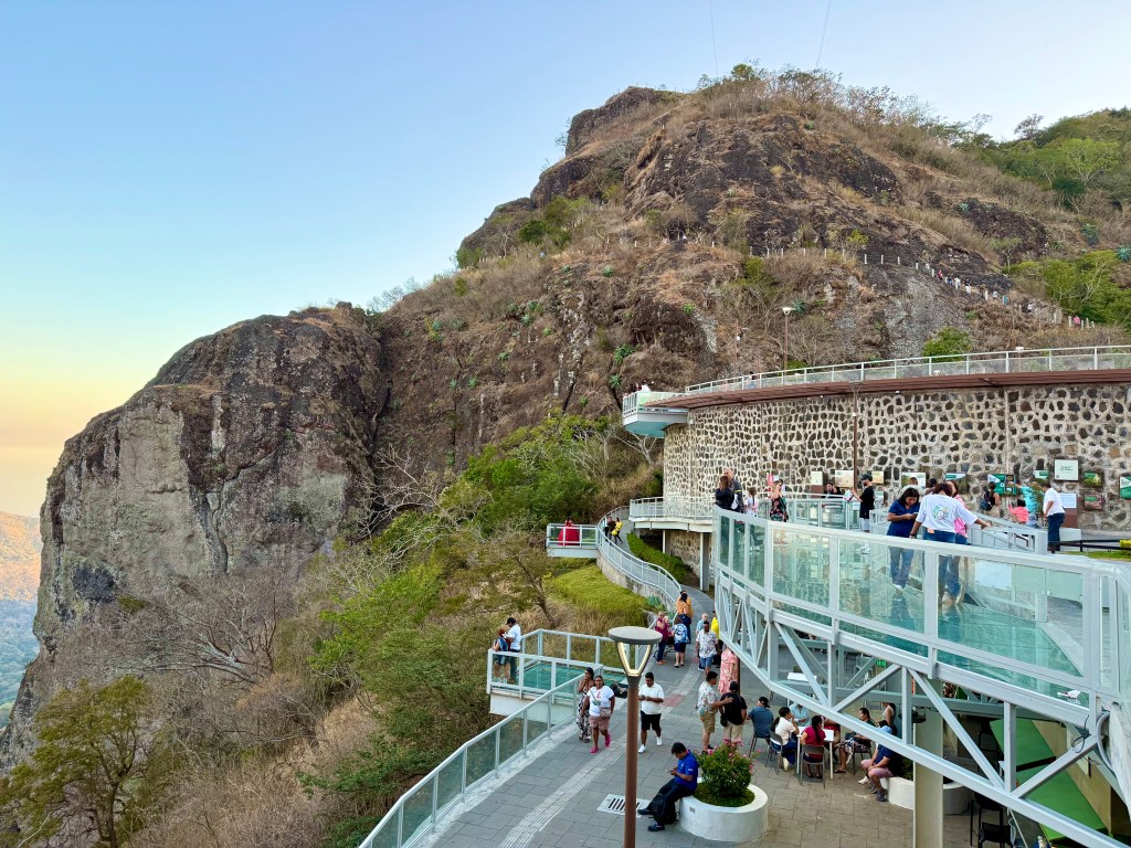 After walking around the center for a while, I met an old friend in the library, and we took an Uber up to Puerta del Diablo, which is a viewpoint on a hillside outside of the city. We arrived too late to do the climb to the top; the gate closes at 5:30pm, but we were able to do the other smaller hill on the opposite side of the plaza and to the cave. The view is fabulous and the food in the food court was excellent. A plaque near the entrance to the gate explains the story of the site: “There are various legends surrounding the history of the Puerta del Diablo site. One recounts that the property was privately owned by the Renderos family, which gave rise to the name of the area Planes de Renderos. The daughter of the Renderos family, Maria de la Paz, was courted by the devil himself, and the family decided to hunt him down. One night after calling upon young Maria de la Paz, the devil found himself cornered by his would-be captors. He broke through the rocky outcrop to escape through the middle of the peak. Since then, the site has been known as Puerta del Diablo due to the curious shape of the two elevated peaks on either side of the crevice.”