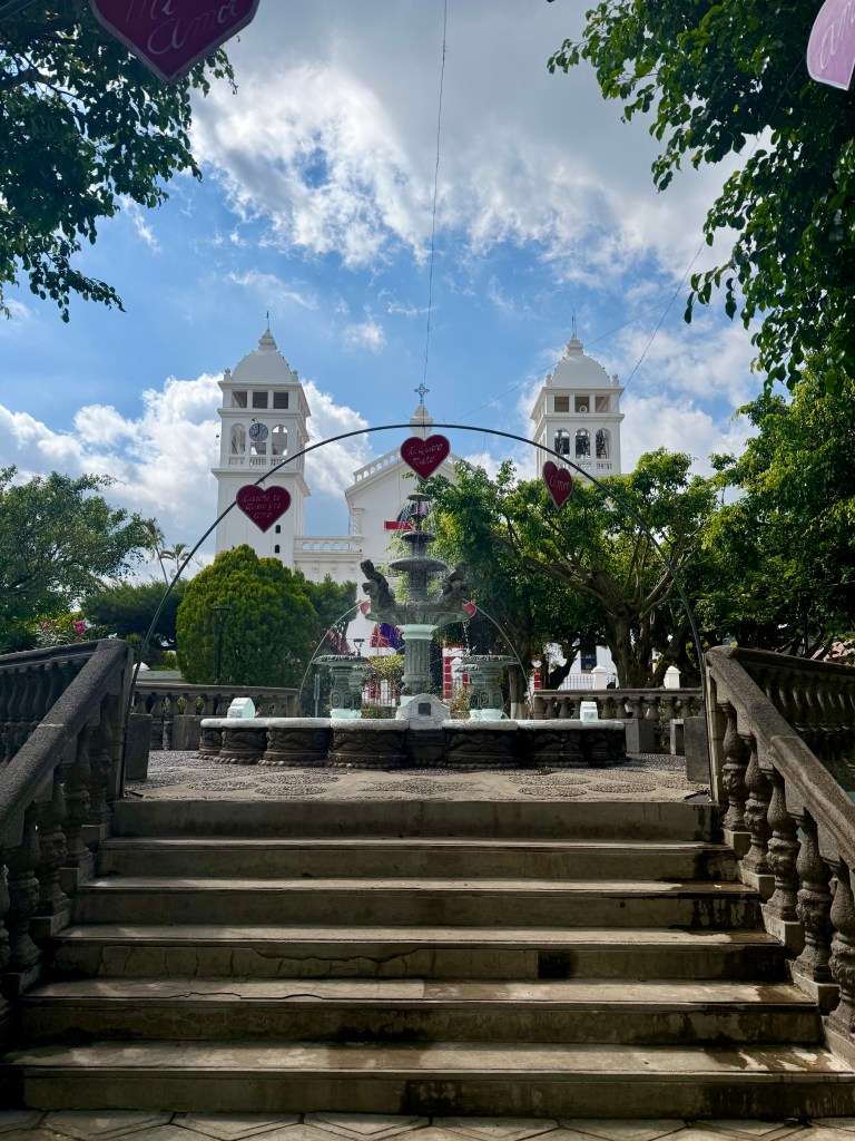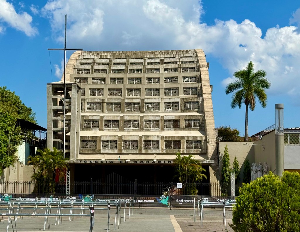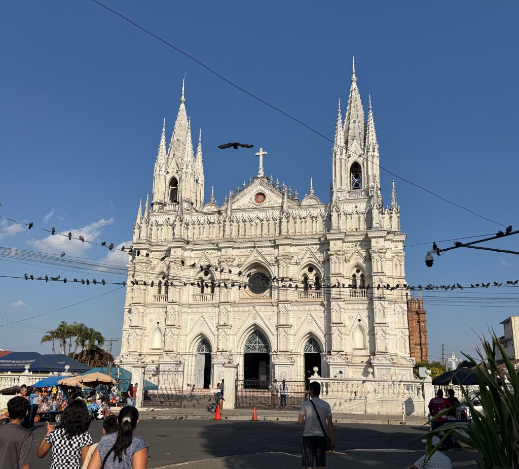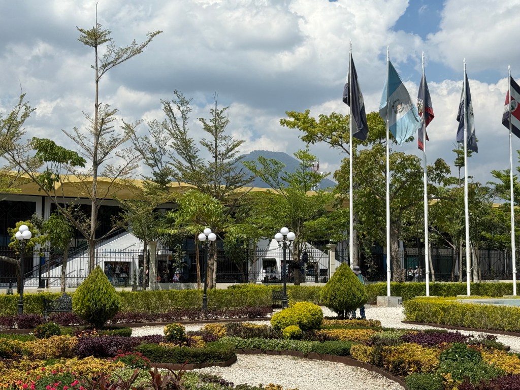 My first morning in the city, I took an Uber from my B&B in the suburbs into the historic center. I had planned on going into a tourist information agency to get a map as I prefer to save the battery power Google Maps eats, but there wasn’t one. Instead, there are pillars around the historic center with QR codes that lead to texts explaining the history of the city and indicating a few walking tours. There are a number of very lively squares and markets in the historic center, although the buildings themselves are only from the early 20th C. The older structures were destroyed by volcanic eruptions over the years, but the Salvadorians continually rebuilt. There are between 22 and 36 active volcanoes in tiny El Salvador (depending on which reference material one uses) and according to the government 224 volcanoes in total, including the dormant and extinct ones. A number of volcanoes shoot up directly from the center of town and have very steep inclines. Given the precarious nature of the natural world in the region, it is no wonder that religion remains a mainstay in the society, even though this too seems to be changing. Catholic churches are a fixture in the center, as is the National Palace and the National Theater. All of these structures have been rebuilt after having suffered from either earthquakes or volcanoes.