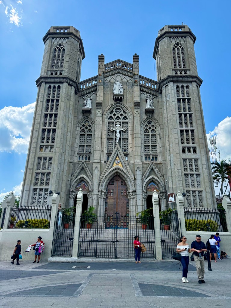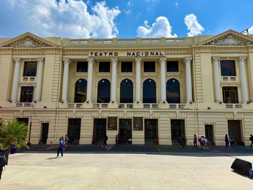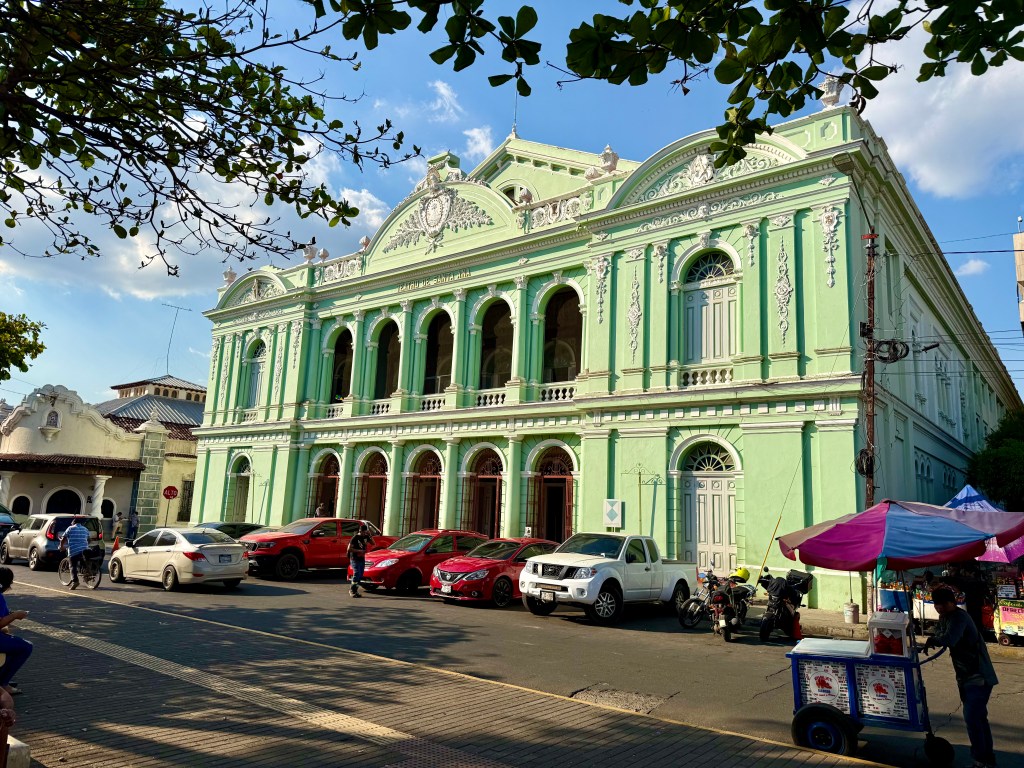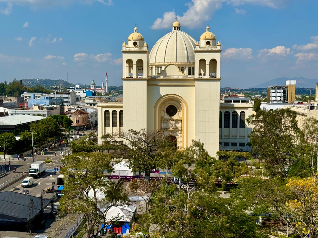 My first morning in the city, I took an Uber from my B&B in the suburbs into the historic center. I had planned on going into a tourist information agency to get a map as I prefer to save the battery power Google Maps eats, but there wasn’t one. Instead, there are pillars around the historic center with QR codes that lead to texts explaining the history of the city and indicating a few walking tours. There are a number of very lively squares and markets in the historic center, although the buildings themselves are only from the early 20th C. The older structures were destroyed by volcanic eruptions over the years, but the Salvadorians continually rebuilt. There are between 22 and 36 active volcanoes in tiny El Salvador (depending on which reference material one uses) and according to the government 224 volcanoes in total, including the dormant and extinct ones. A number of volcanoes shoot up directly from the center of town and have very steep inclines. Given the precarious nature of the natural world in the region, it is no wonder that religion remains a mainstay in the society, even though this too seems to be changing. Catholic churches are a fixture in the center, as is the National Palace and the National Theater. All of these structures have been rebuilt after having suffered from either earthquakes or volcanoes.