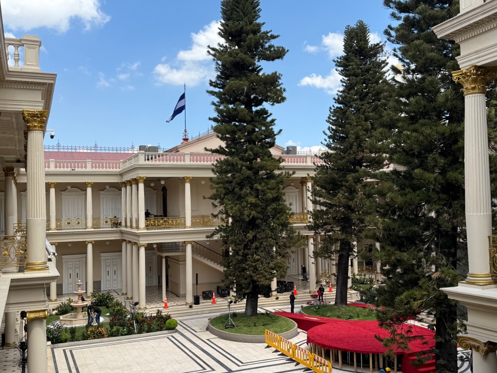 Besides the religious buildings there are three secular structures that are worth mentioning. The first is the National Palace, which was constructed in 1905. It is a mix of styles, mostly Neoclassical and Renaissance Revival. The Palace is open to the public and ½ hour tours are available. The main assembly rooms are named for colors (red, yellow, pink and blue) or for the figures on the walls (jaguars). Off the red room, is a balcony from where the current President gave his speech in 2024.