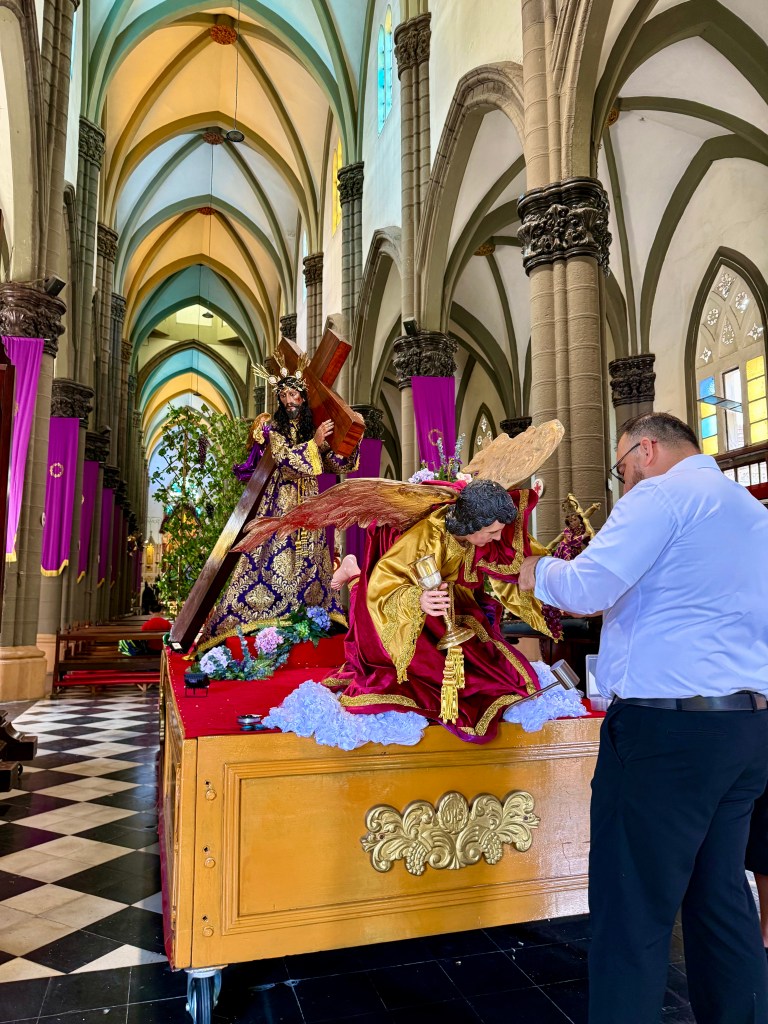 The main Easter processional church is El Calvario, which has a Neogothic façade. It was first constructed 1661, was rebuilt, then destroyed, then rebuilt again; the current building is from 1951. While I was there, a couple were working on putting the final touches to a float for the Passion festival with Jesus carrying the cross led by an angel. The wooden sculptures were beautiful.