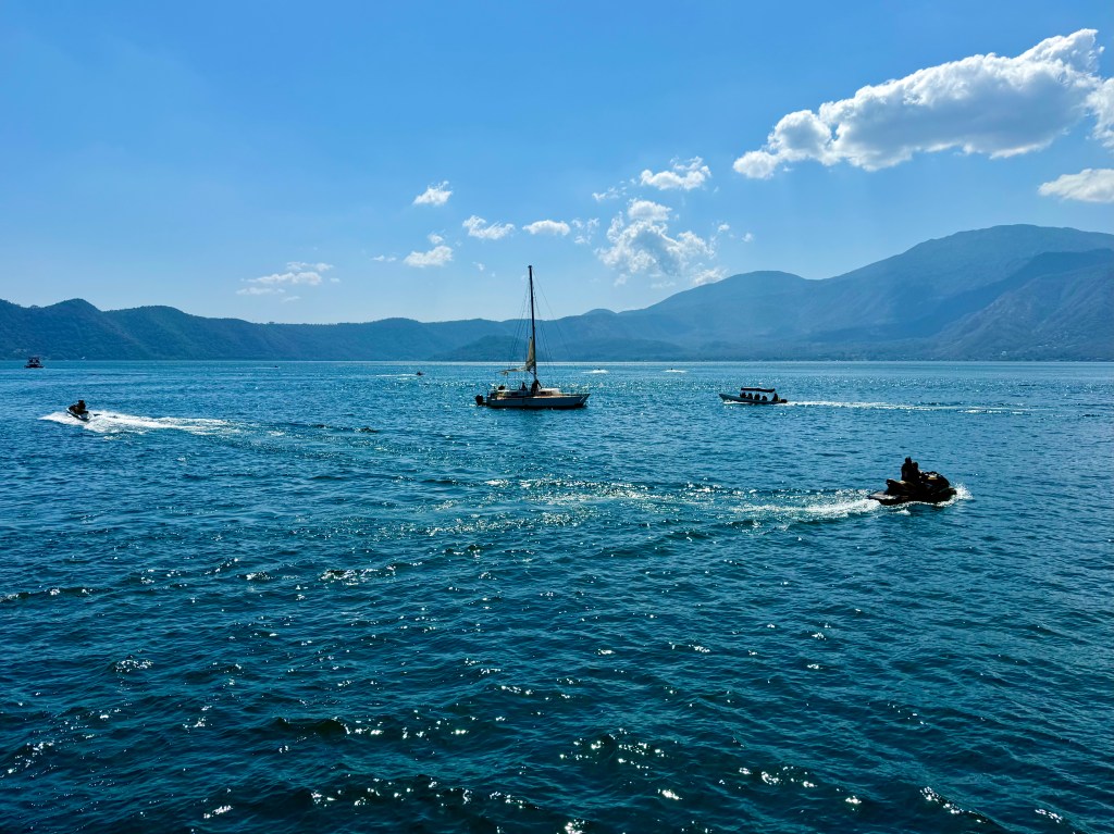 From the volcano, we headed down to Lake Coatepeque, which is named for its serpent shape. The lake is supposed to also be a crater from an ancient volcano. It is quite large and is a haven for water sports. As it was very windy there was only one sailboat out on the water, but lots of jet skiers and a few intrepid swimmers. We had lunch by the lake being blasted with very loud El Salvadorian pop music, that both young and old were singing along with.