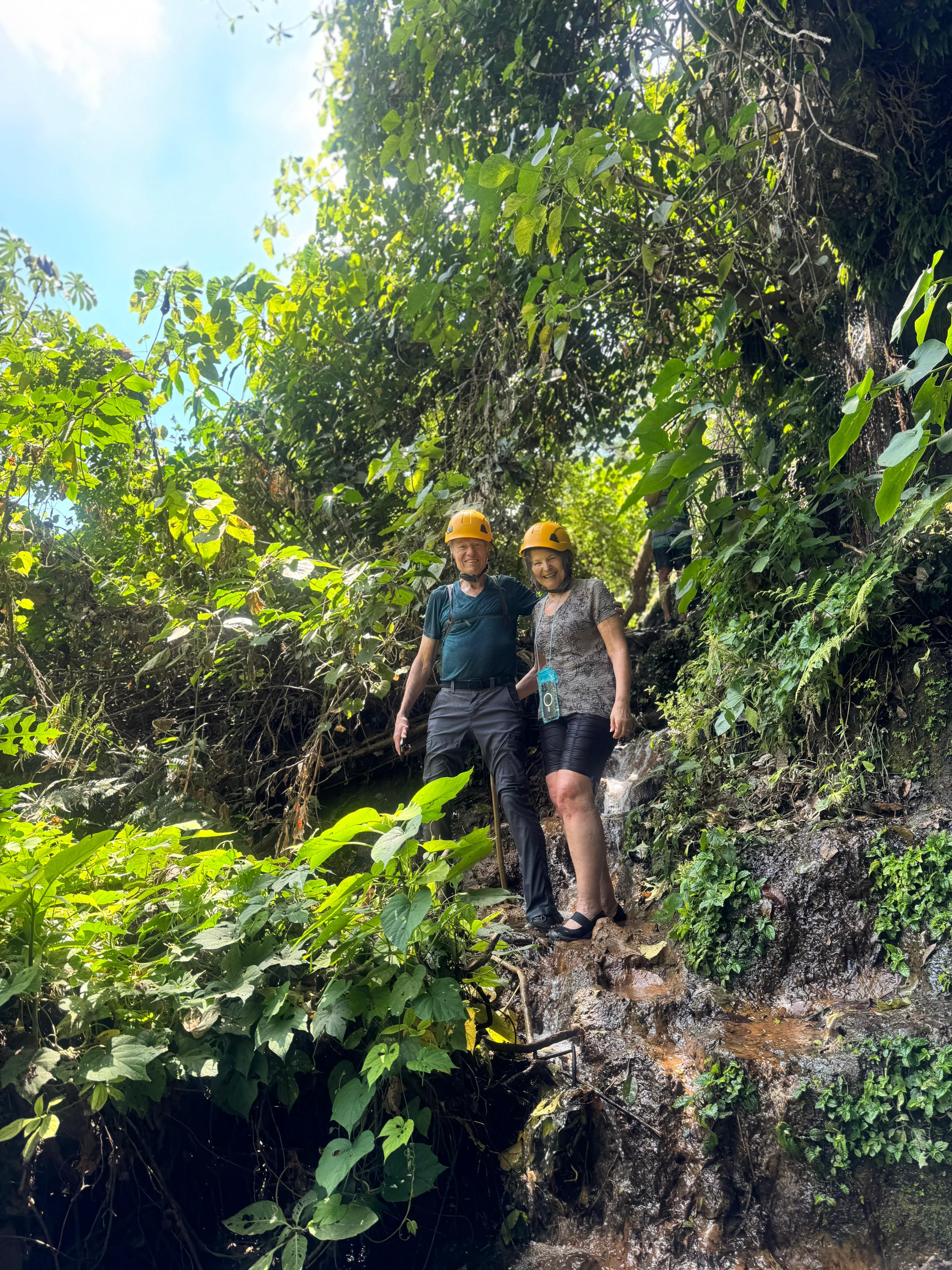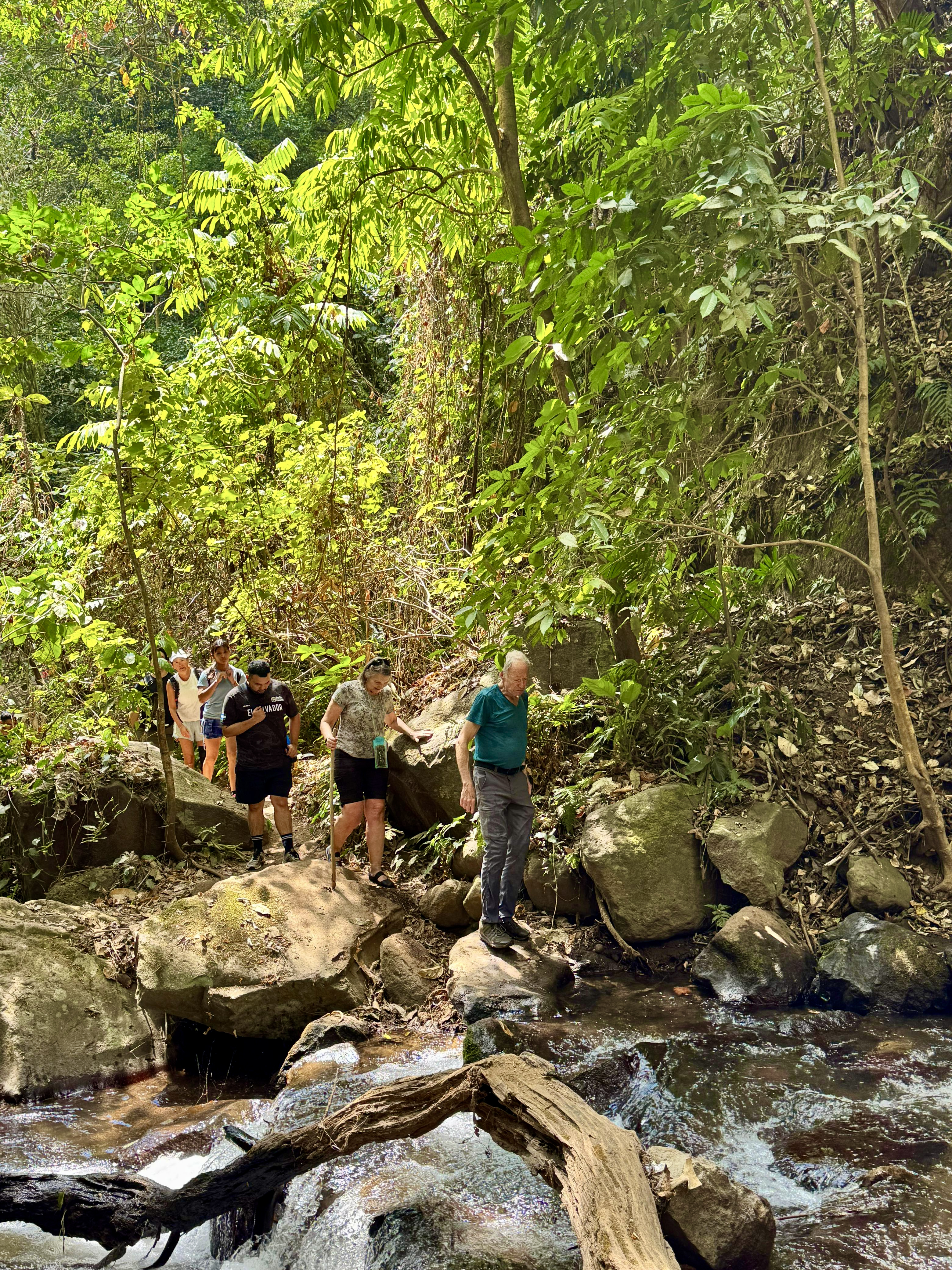 The next day, we booked an excursion to the Juayua waterfalls. The advertisement for the excursion said it would be a mild hike to seven waterfalls – it didn’t say anything about having to scale number five to get to the remaining two! I saw the cliff and thought my heart would stop. As there was no going back, I had to crawl up with the water crashing over me as I tried to find foot and hand holds in the rock. Lots of other people had done this before me, but they were considerably younger with good knees and hips! With the help of the guides, I did make it up, drenched but nonetheless successful. It was wonderful being in a rainforest again, and the streams we crossed were warmer than anticipated, even though standing under the waterfall was like having a cold shower.