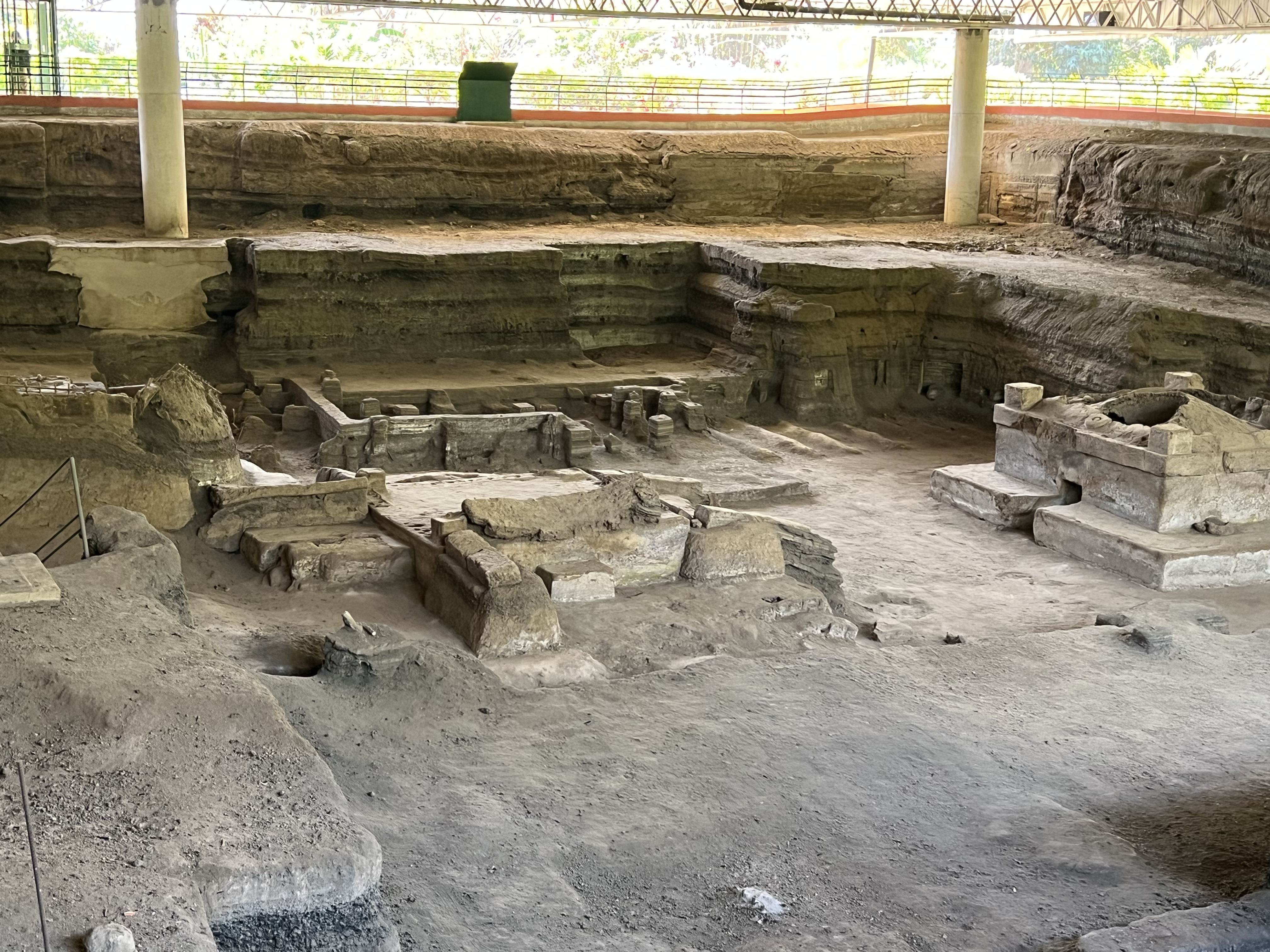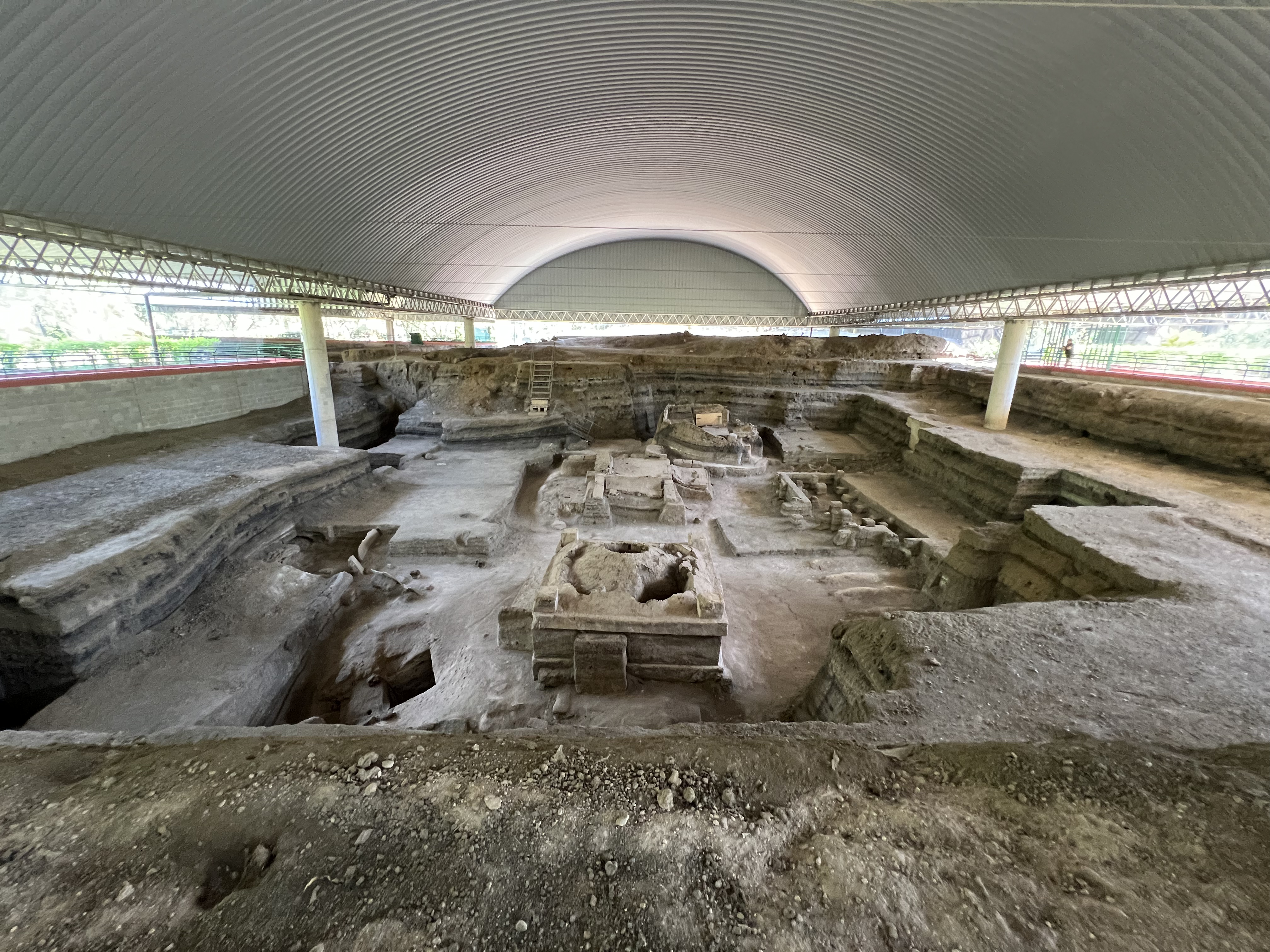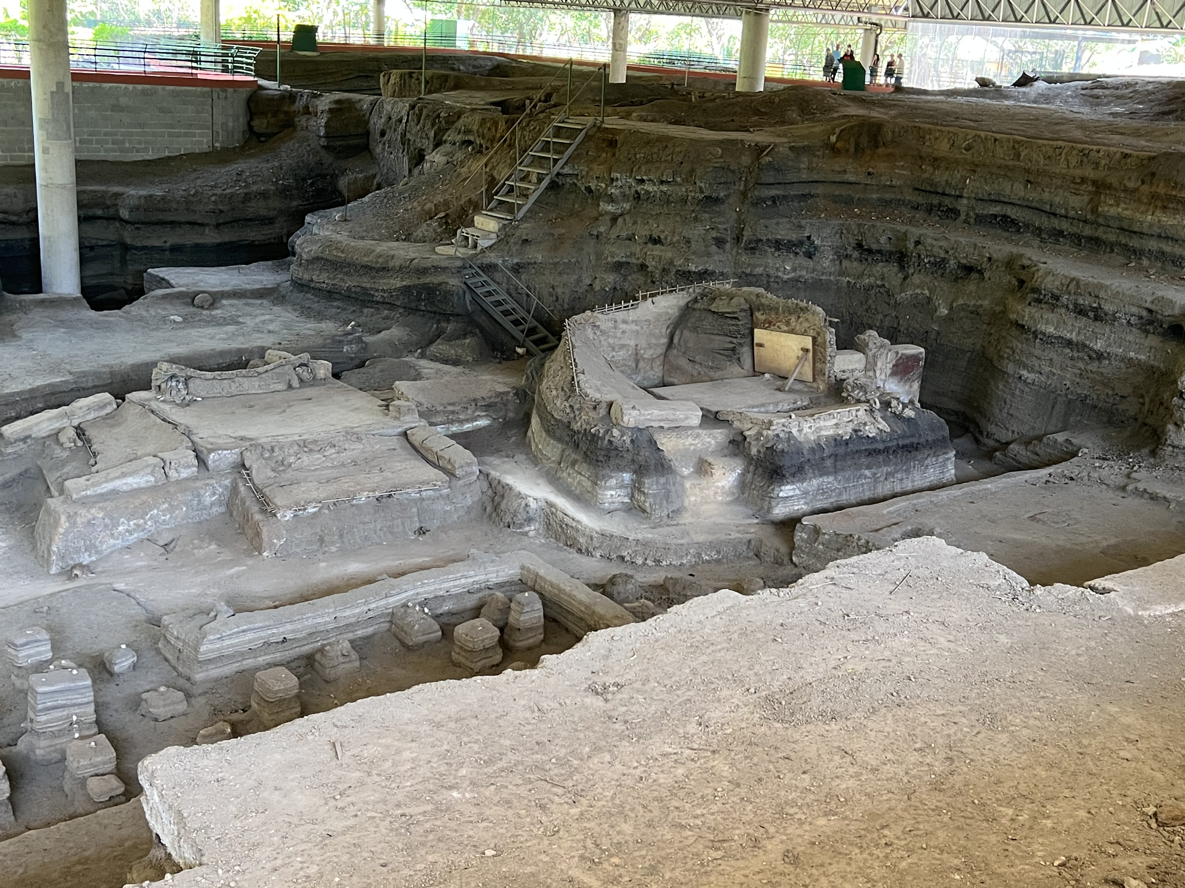 Joya de Cerén is the only UNESCO site in El Salvador. The site is fairly small, it takes about an hour to view the entire site and museum. It houses the remains of a few residential structures from the Classical Mayan Period, ca. 650 AD, that were covered in 14 layers of volcanic ash. While only a couple of family sites have been uncovered, they demonstrate that each family had at least three buildings: a kitchen, a storage unit and a bedroom. No evidence of a lavatory has been found, but there was a communal sauna, which was probably used for purification and health reasons. A community structure with two rooms, as well as a shaman’s house and ritual sanctuary have also been uncovered. The on-site museum houses the ancient Mayan ceramic works that were found here as well as in neighboring areas. This was a fascinating site, very different from the other Mayan ruins that I have seen. There were no pyramids, but rather local houses and a community center. To date no human remains have been found, which seems to indicate that the people were warned of the pending disaster in time to get away, probably by an earthquake. It was also remarkable to see how archeologists had dug through the 14 layers of ash to find the structures. The site was located by accident. When the government wanted to build a silo to store grain, the backhoe toppled the roof on one of the bedrooms. The work on the silo stopped and the archeologists took over.