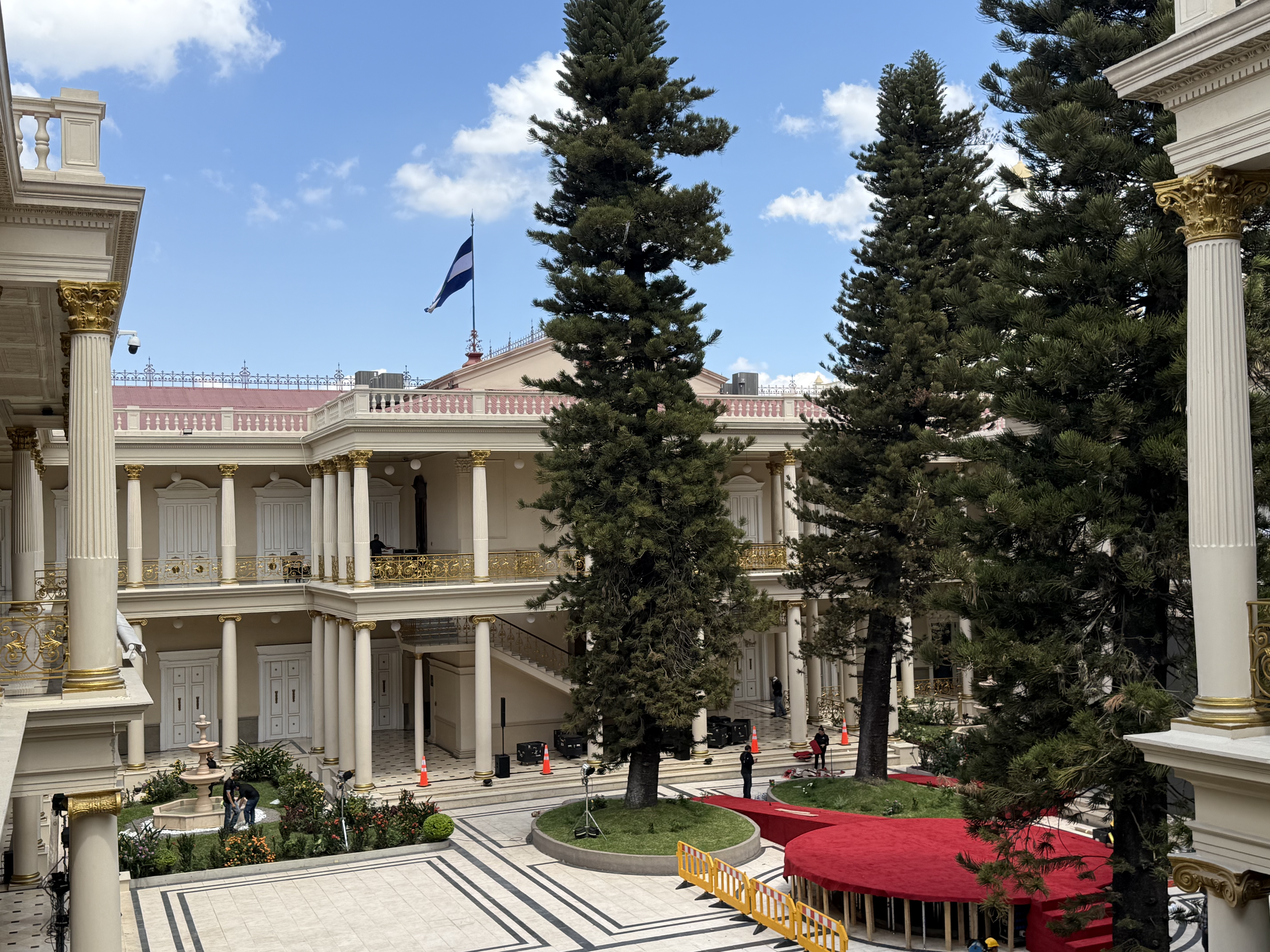 Besides the religious buildings there are three secular structures that are worth mentioning. The first is the National Palace, which was constructed in 1905. It is a mix of styles, mostly Neoclassical and Renaissance Revival. The Palace is open to the public and ½ hour tours are available. The main assembly rooms are named for colors (red, yellow, pink and blue) or for the figures on the walls (jaguars). Off the red room, is a balcony from where the current President gave his speech in 2024.