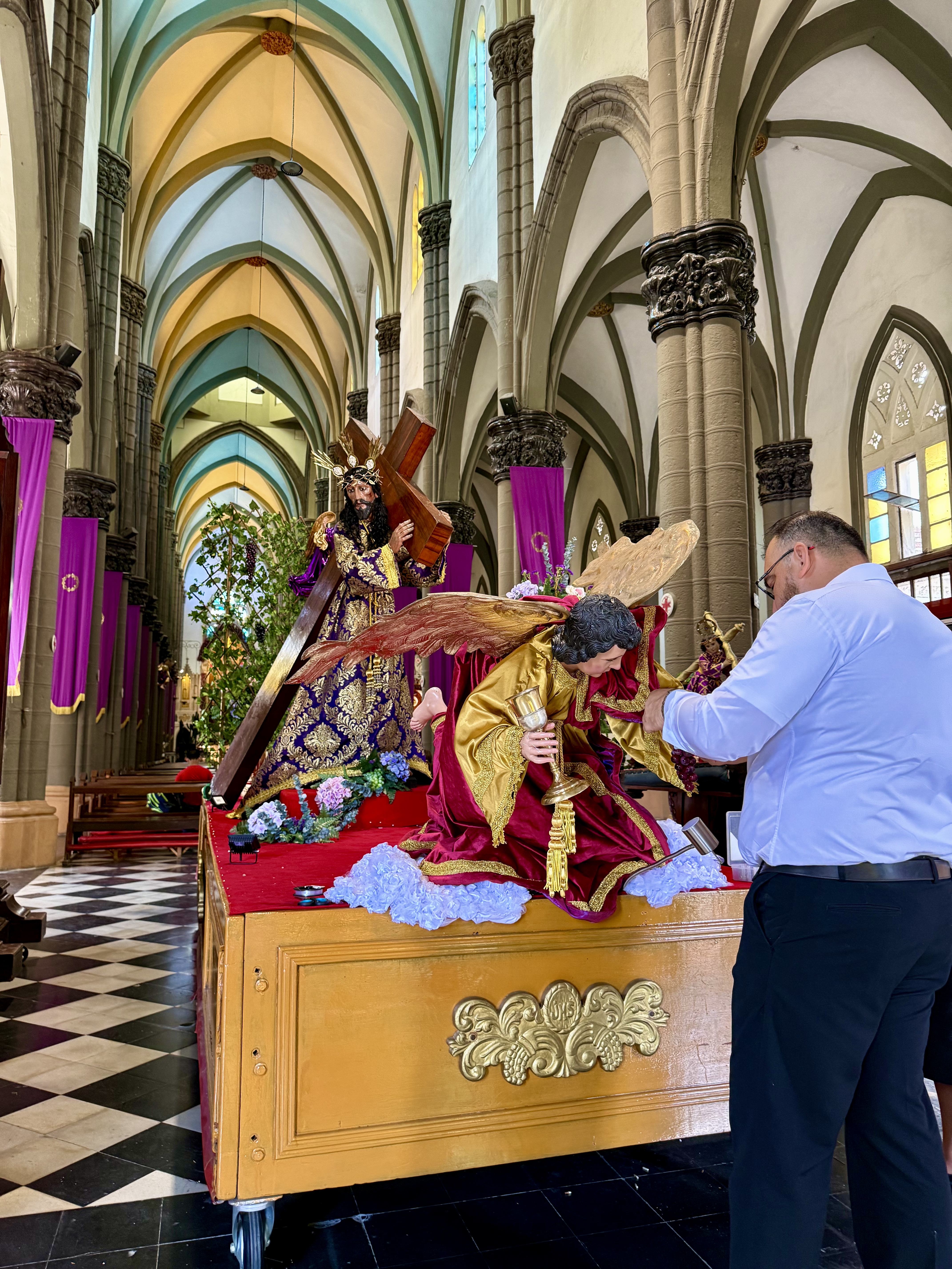 The main Easter processional church is El Calvario, which has a Neogothic façade. It was first constructed 1661, was rebuilt, then destroyed, then rebuilt again; the current building is from 1951. While I was there, a couple were working on putting the final touches to a float for the Passion festival with Jesus carrying the cross led by an angel. The wooden sculptures were beautiful.