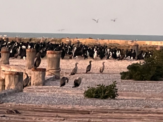From Bushy Beach we drove down to the Harbor in the hopes of seeing a Blue Penguin even though we had been warned that they weren’t around at the moment. We didn’t see any, but we saw what we mistakenly thought were penguins on a blocked off wharf. It turns out they were Shag birds & not penguins although they look like them.