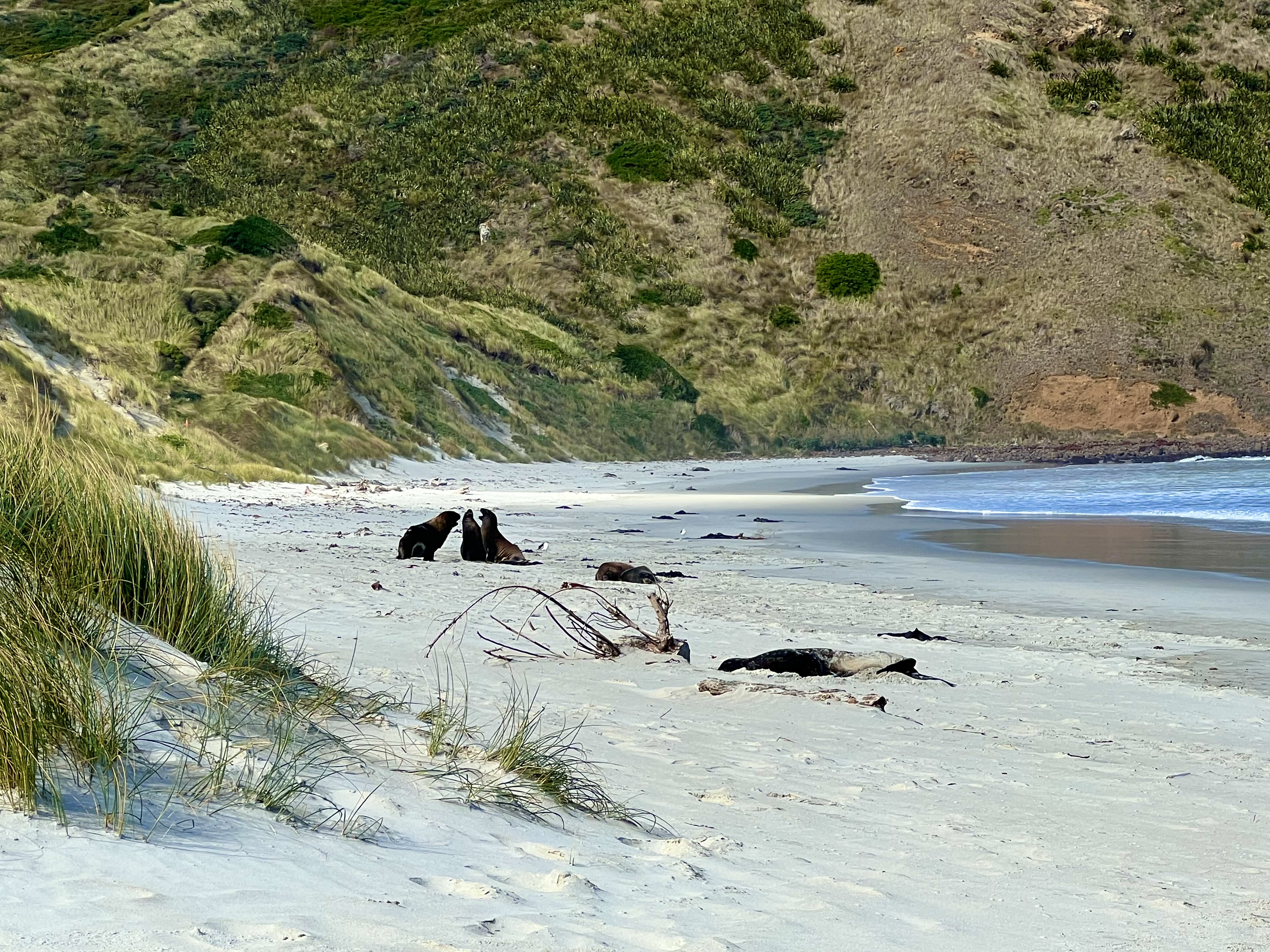 The next morning, we went to the Dunedin Saturday Farmer’s Market, which is next to the Victorian styled Railway Station. There were musicians at both ends of the sets of stalls making for a very festive grocery shopping experience. After coffee and an apple cherry tart from one of the local bakers, it was off to Sandfly Beach to see the wildlife there. This beach is not named for the sandflies that attack everyone at Milford Sound, but for the way the sand flies with the wind. We were lucky to have a clear warm sunny day with very little wind. The fur seals seemed to enjoy the weather as well, as they were lined up lying along the beach looking like long garden slugs until they actually moved. A few of the younger pups still had their silver fur coats, but most were dark brown. This was confusing because the larger heavier animals looked to me more like the sea lions we had previously seen and the smaller slighter ones the fur seals, but the sign on the beach said that this was a fur seal colony. I’m still not sure, but whatever they were both the heavier ones and the smaller ones were fun to watch. I’m developing an attachment to seals on this trip as they sometimes act like puppies and like my dog, Nori, with her friends, Enzo and Hutch. They play as if they were mad at each other, but it is just playing and then they sort of kiss and make up. It is hysterically funny to watch.