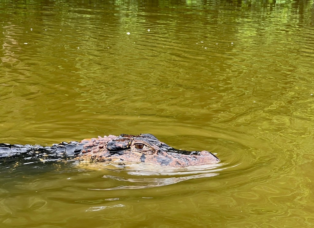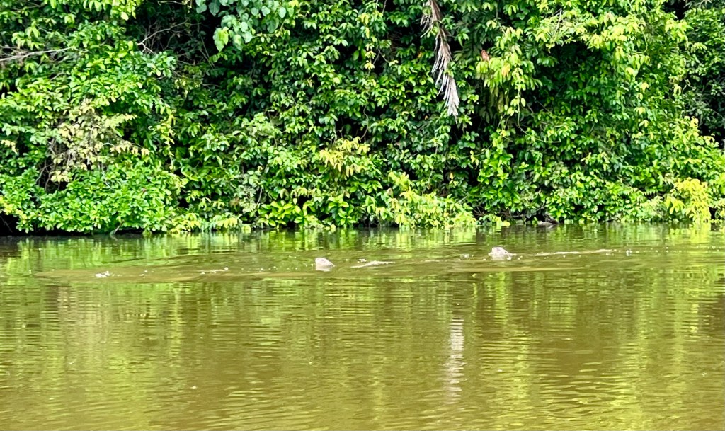 During the walk, we saw a few more brown capuchin monkeys and could see movement from the squirrel monkeys, but they weren’t visible due to the dense brush. Floating/paddling along the sides of the lake, we were very lucky to see a number of birds, many I knew, such as the blue and yellow macaw, the great white heron, the kingfisher, and the anhinga, but many I had not come across before and do not know the names of. We saw the head of a white caiman and were entertained by a black caiman that came right up to the boat. The best part, for me at least, was when we came across a family of giant river otters playing on a log. After they had amused themselves, they dove into the water and swam in our direction, but with a good 30 feet between us, before they disappeared underwater.