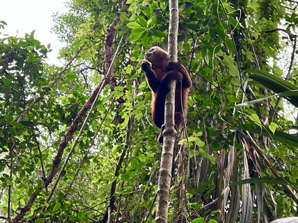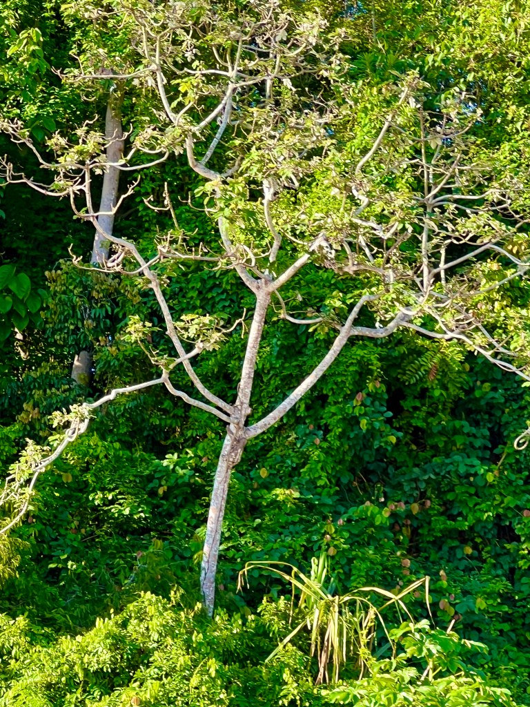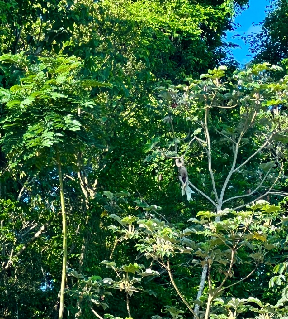 On the first day there were three excursions: the nature walk, a canoe trip to and walk on Monkey Island, which was only a few minutes from the lodge, and a caiman viewing at night. This worked out to being first, a bit about the flora, then a bit about the terrestrial fauna and finally the water’s inhabitants. During the nature walk, Fernando explained that there are two different species of termites living in the forest, one lives on tree trunks, with a mixture of their saliva and excrement forming tunnels on the sides of a tree. Apparently, this mixture can be collected from the tree trunk and used as an insect repellent. The termites don’t hurt the living trees as they only feed off of dead wood – the woodwork in my former house in Yuma, AZ, for example. The other kind are the ones that build mounds on the forest floor, which are the kind I have seen in equatorial regions across the globe. We also learned that the kapok tree is locally called ‘the mother of the forest’ because it can grow up to 60-70ft tall and live up to 1,000 years. It produces a cotton like substance from June to August that locals use for pillows and blankets. Other trees that were highlighted during the walk were the walking palm, which moves to where it can catch sunlight through the canopy, various other kinds of palms, fig and strangler fig trees. These, along with the kapok, were similar to those in Daintree National Park in Queensland, Australia, if a bit smaller than their Australian cousins.