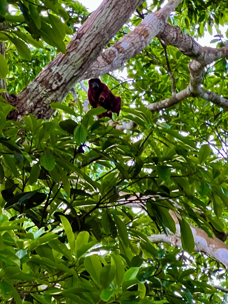 After a few hours on the lake, we returned via the path we took when we arrived to meet our riverboat that took us back to the lodge in time for lunch. In the late afternoon, we gathered again, this time for a canopy walk on a couple of swinging bridges near the forest canopy. Again, we were incredibly lucky as a red howler monkey was playing in a tree not too far from the tower platform that stabilizes one side of one of the bridges. A small owl stuck his head out of a cavern in the tree in front of the platform and watched us the entire time we were watching him and the monkey. I had the sense that the wildlife here carefully pays attention to what the human tourists do, much the way we watch them. The final event of the day was a night-time walk on a path behind the lodge to see tarantulas and other creepy crawly jungle critters. We did see a number of the furry anchariids, as well as the very nasty black and large bullet ants, but no snakes, for which I was actually quite grateful. The best part of the night walk was seeing a porcupine in a tree. I didn’t know they existed in the rainforest, as I’m familiar with the ones that meander through the Wasatch Mountains in Utah and those in Michigan and Maine, i.e., very different habitats than in the tropical rainforest.