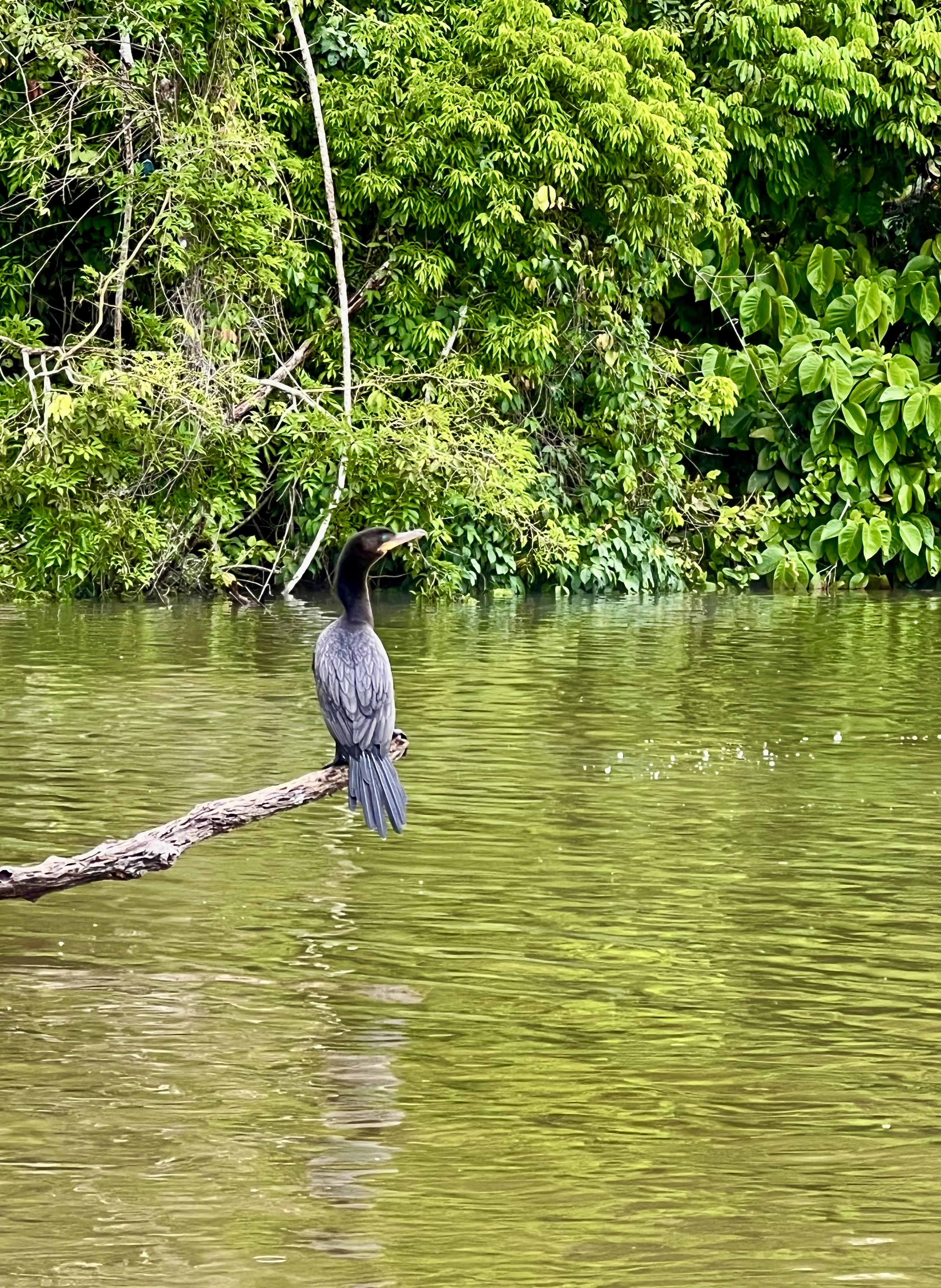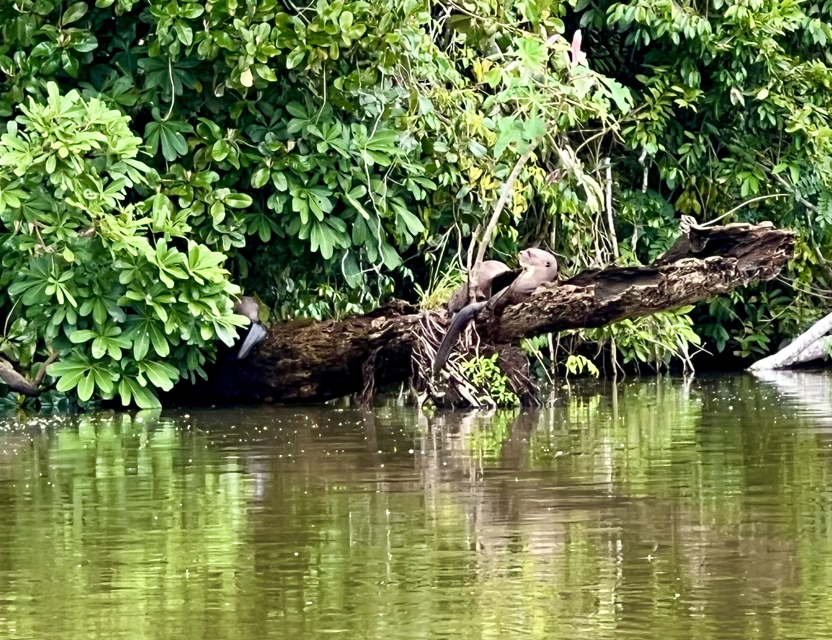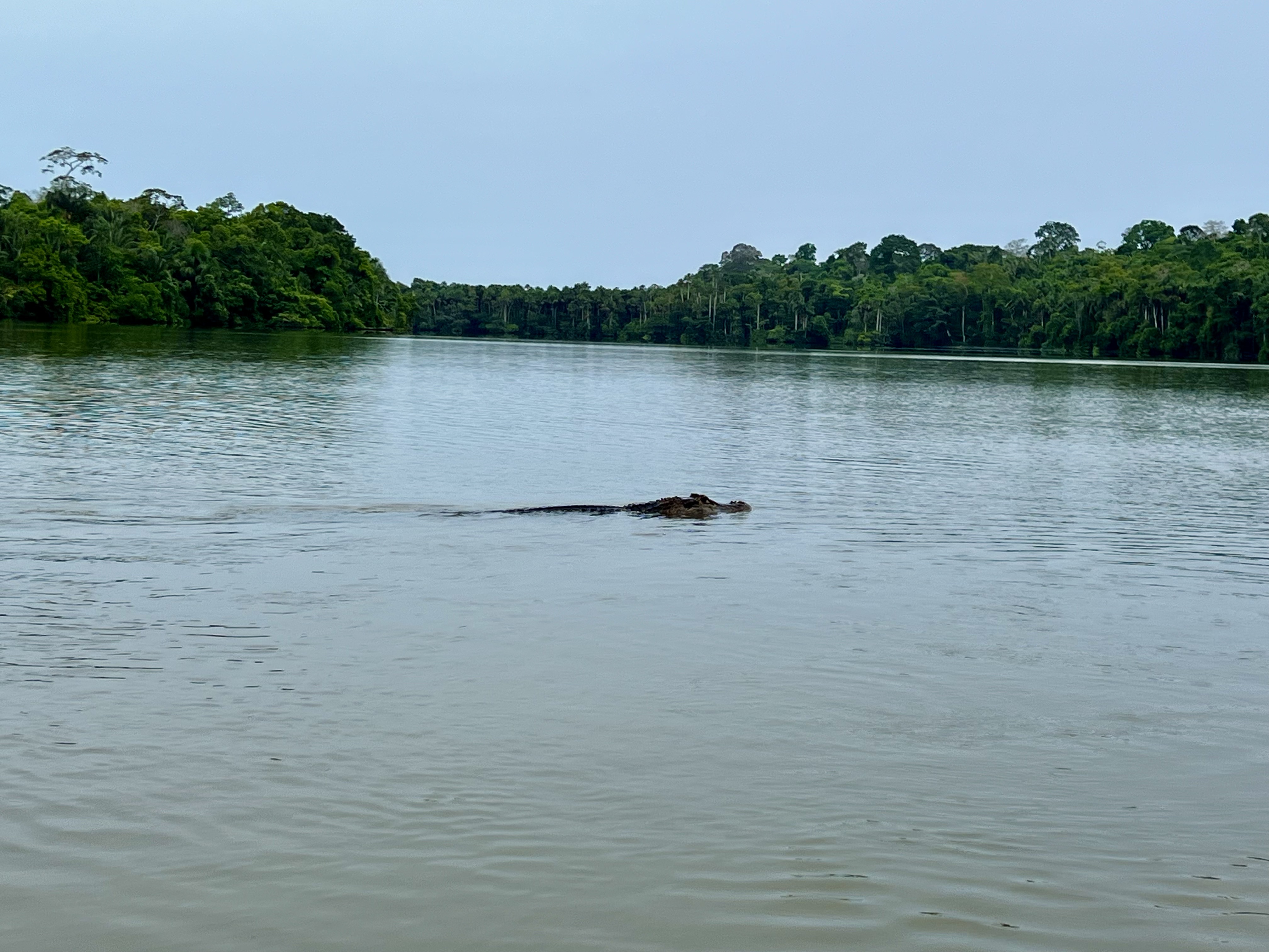 During the walk, we saw a few more brown capuchin monkeys and could see movement from the squirrel monkeys, but they weren’t visible due to the dense brush. Floating/paddling along the sides of the lake, we were very lucky to see a number of birds, many I knew, such as the blue and yellow macaw, the great white heron, the kingfisher, and the anhinga, but many I had not come across before and do not know the names of. We saw the head of a white caiman and were entertained by a black caiman that came right up to the boat. The best part, for me at least, was when we came across a family of giant river otters playing on a log. After they had amused themselves, they dove into the water and swam in our direction, but with a good 30 feet between us, before they disappeared underwater.