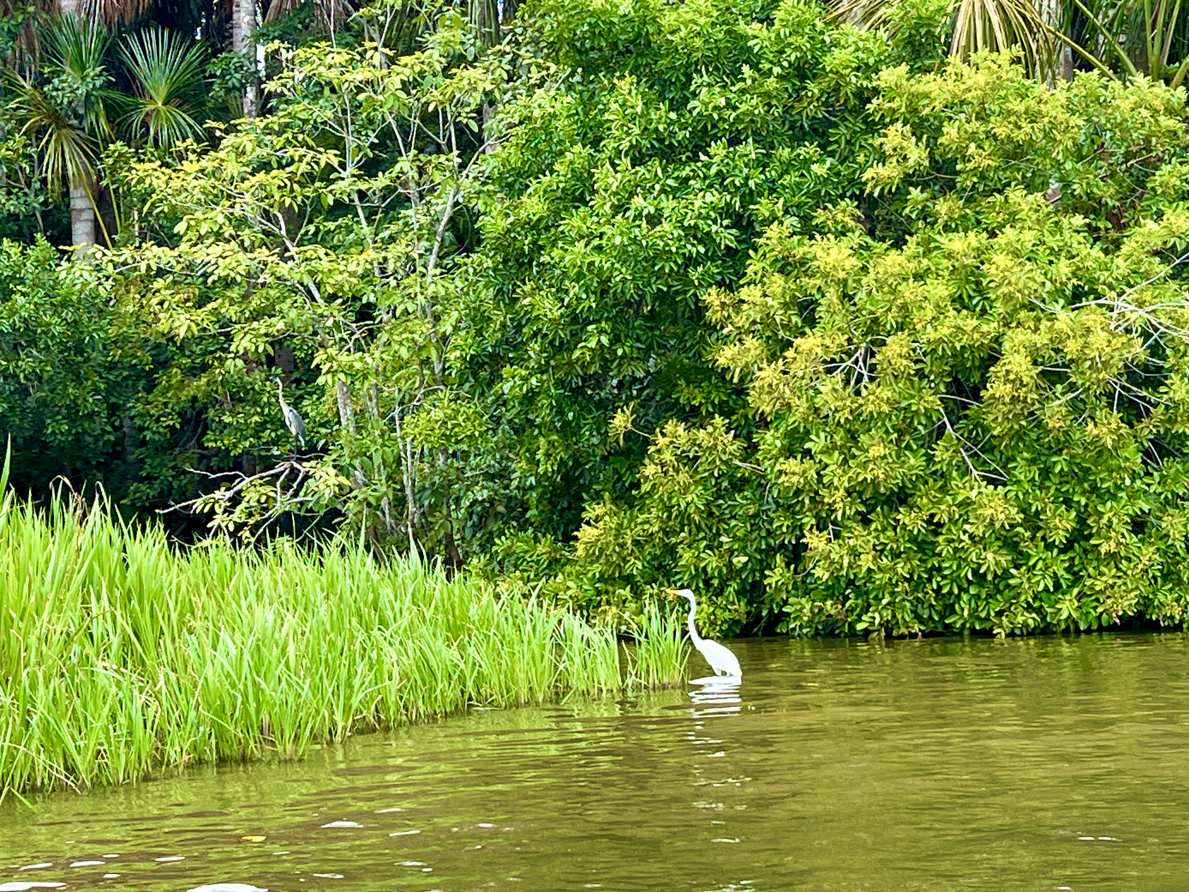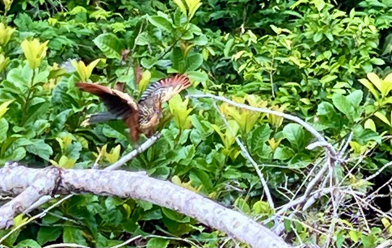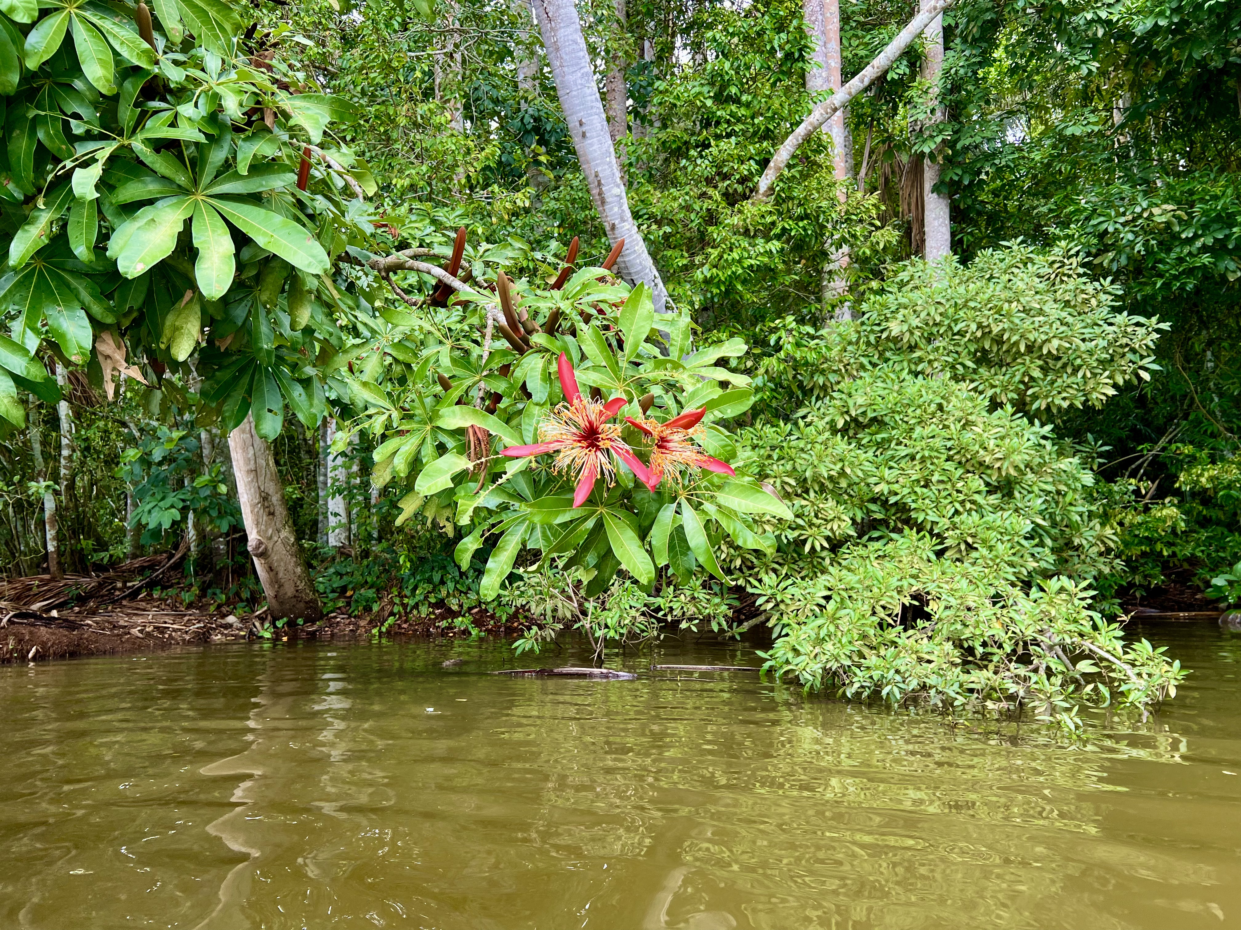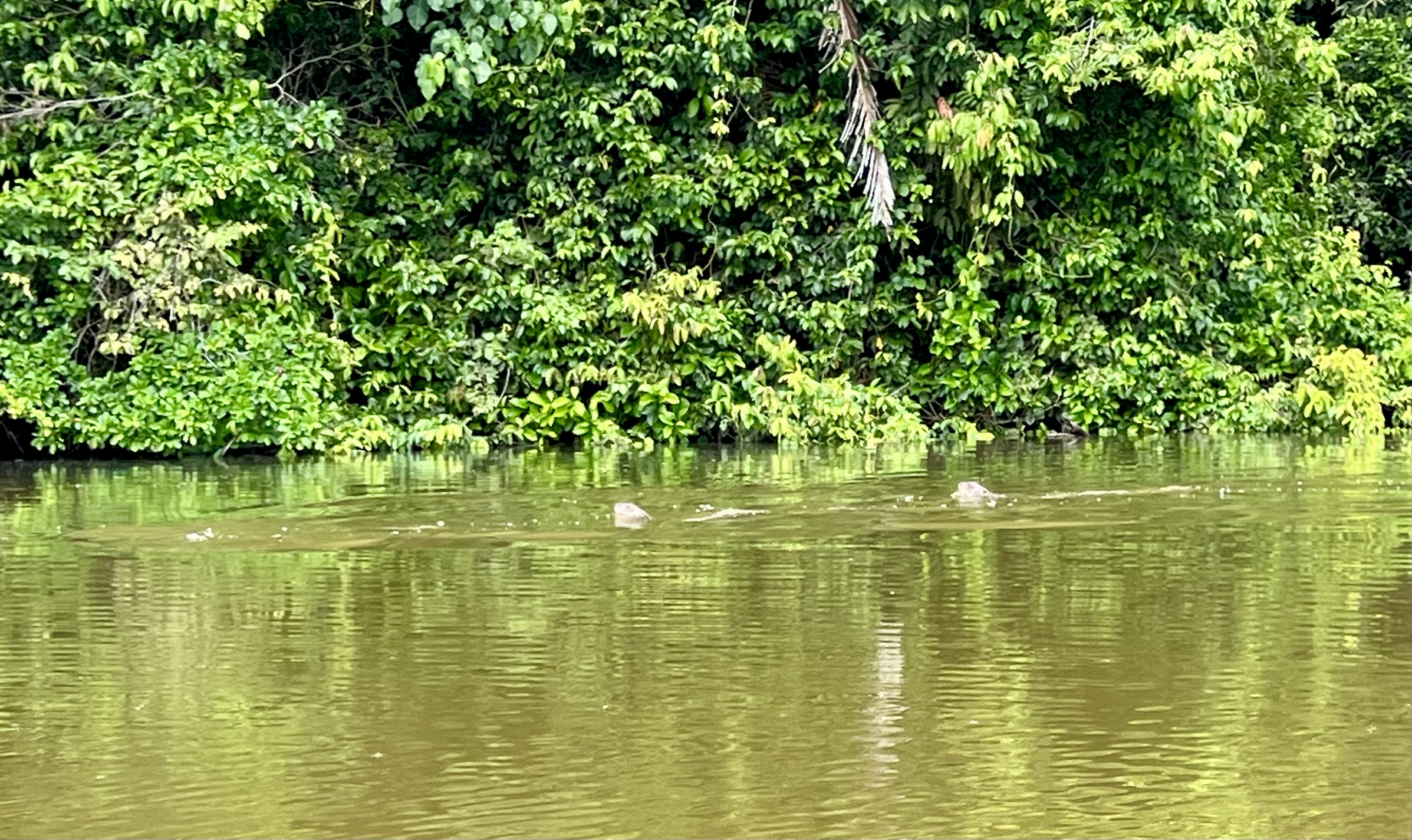 During the walk, we saw a few more brown capuchin monkeys and could see movement from the squirrel monkeys, but they weren’t visible due to the dense brush. Floating/paddling along the sides of the lake, we were very lucky to see a number of birds, many I knew, such as the blue and yellow macaw, the great white heron, the kingfisher, and the anhinga, but many I had not come across before and do not know the names of. We saw the head of a white caiman and were entertained by a black caiman that came right up to the boat. The best part, for me at least, was when we came across a family of giant river otters playing on a log. After they had amused themselves, they dove into the water and swam in our direction, but with a good 30 feet between us, before they disappeared underwater.
