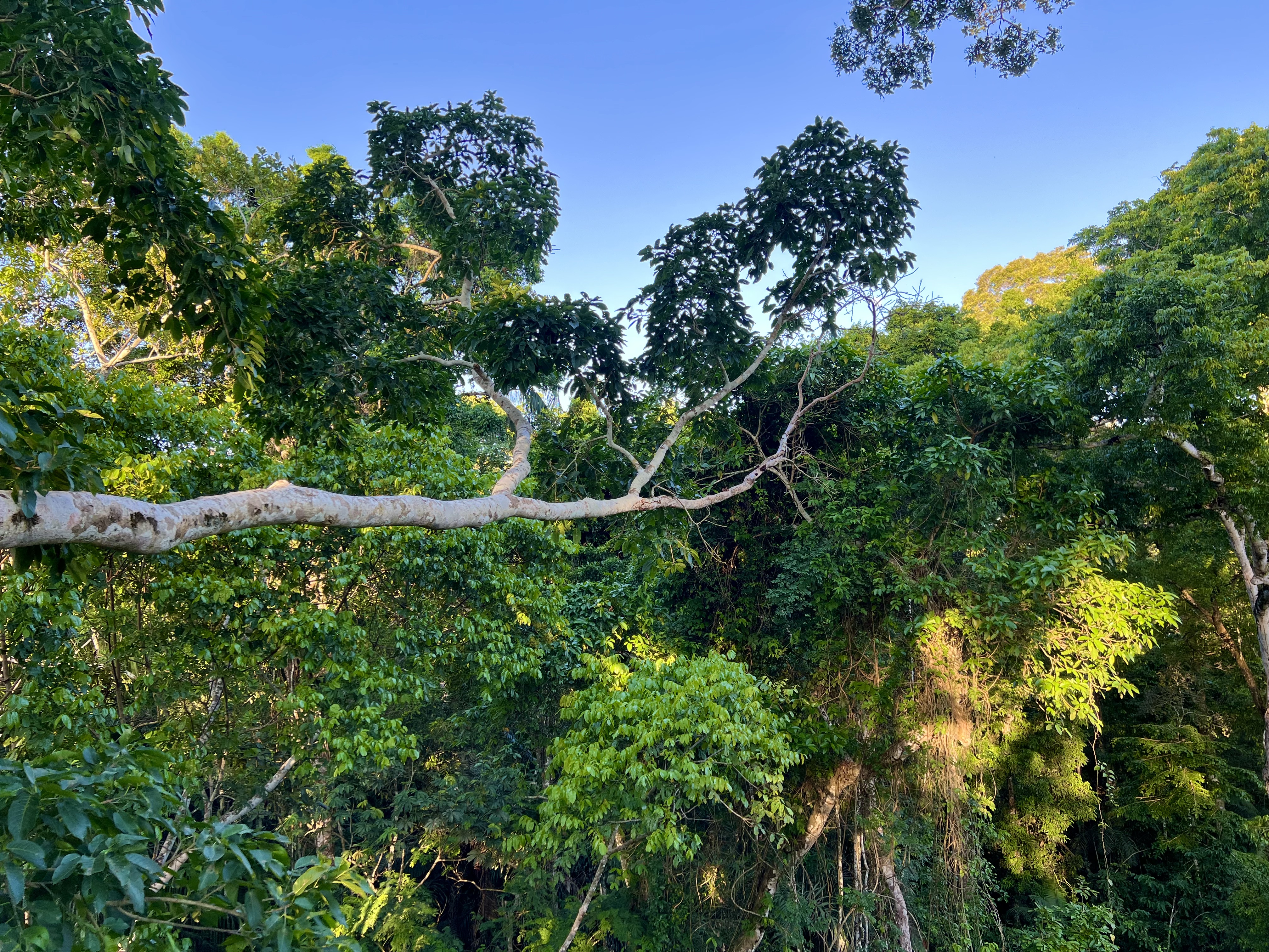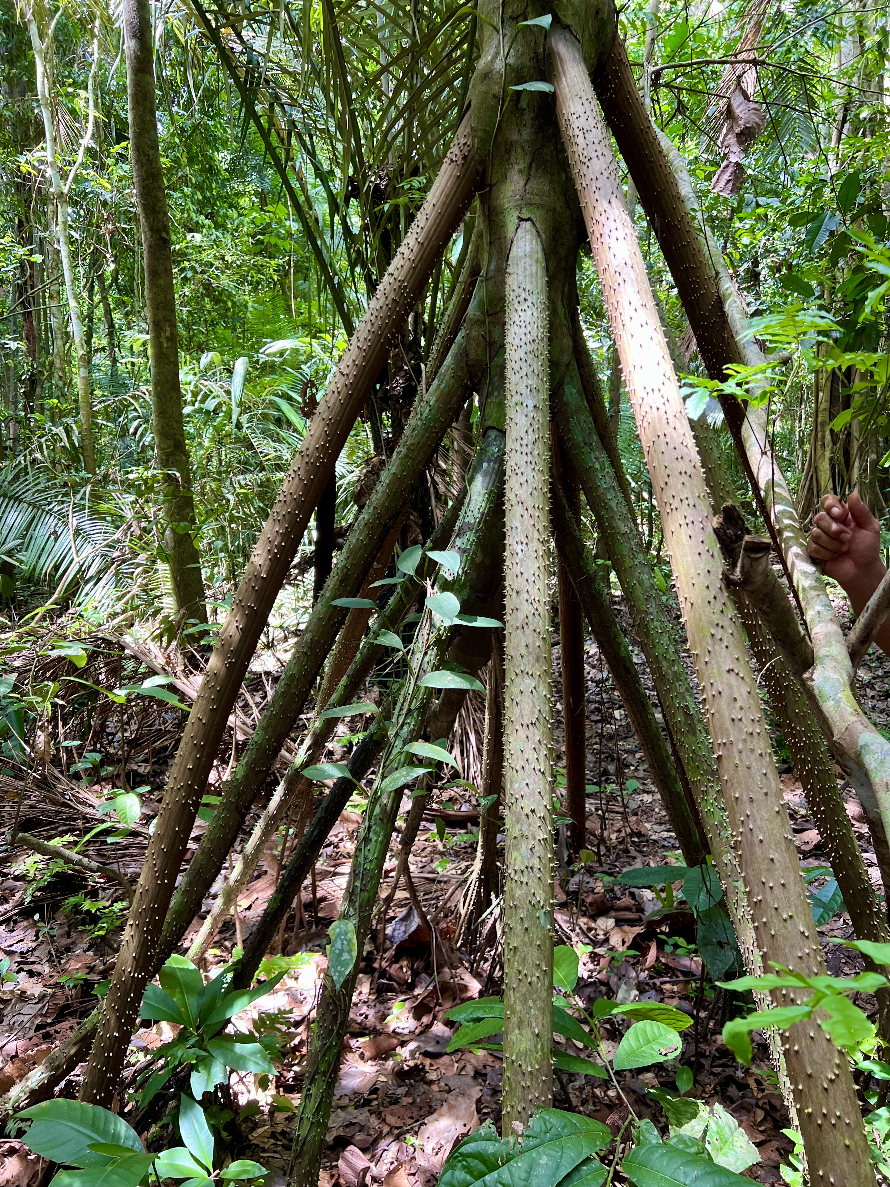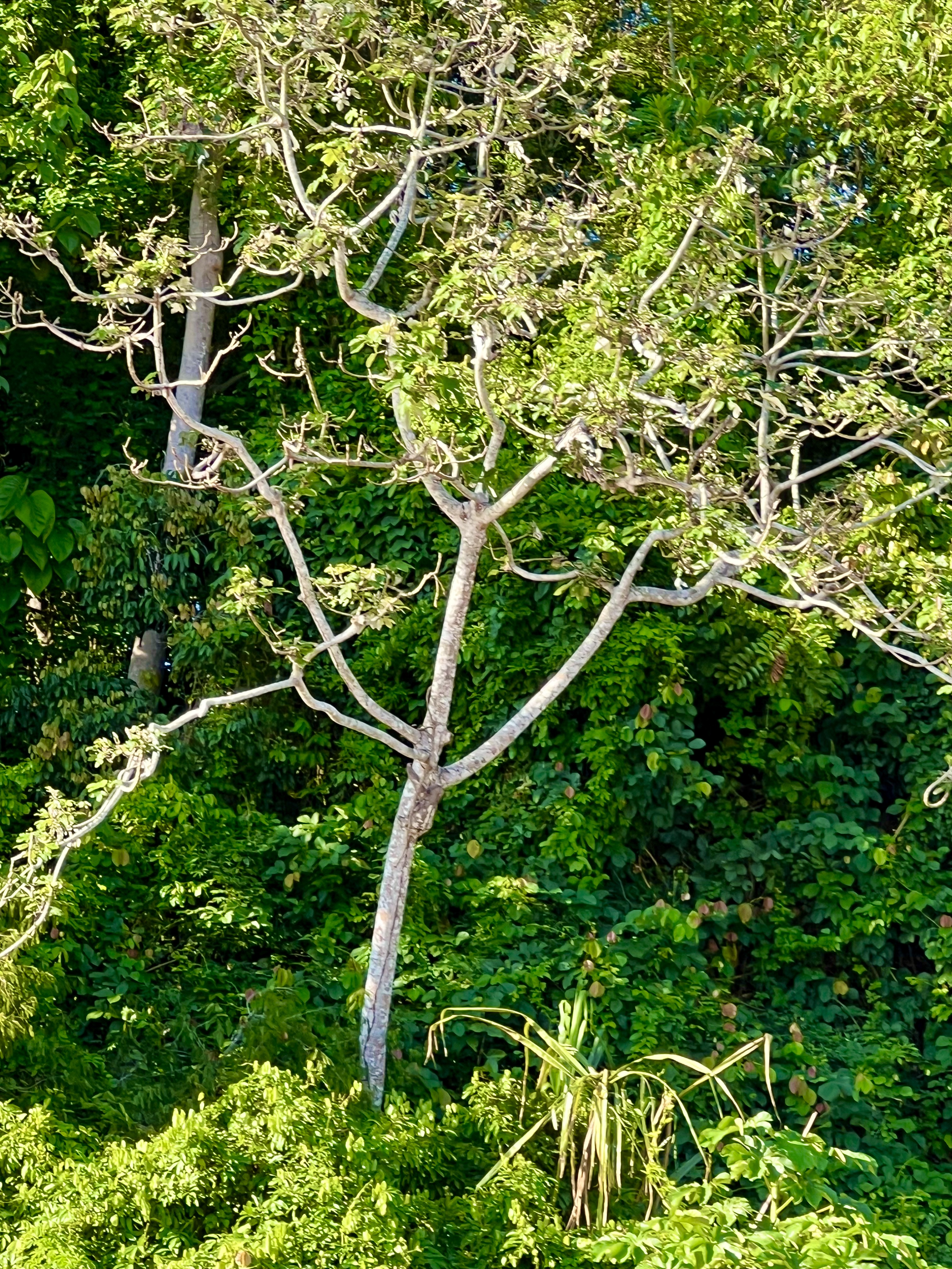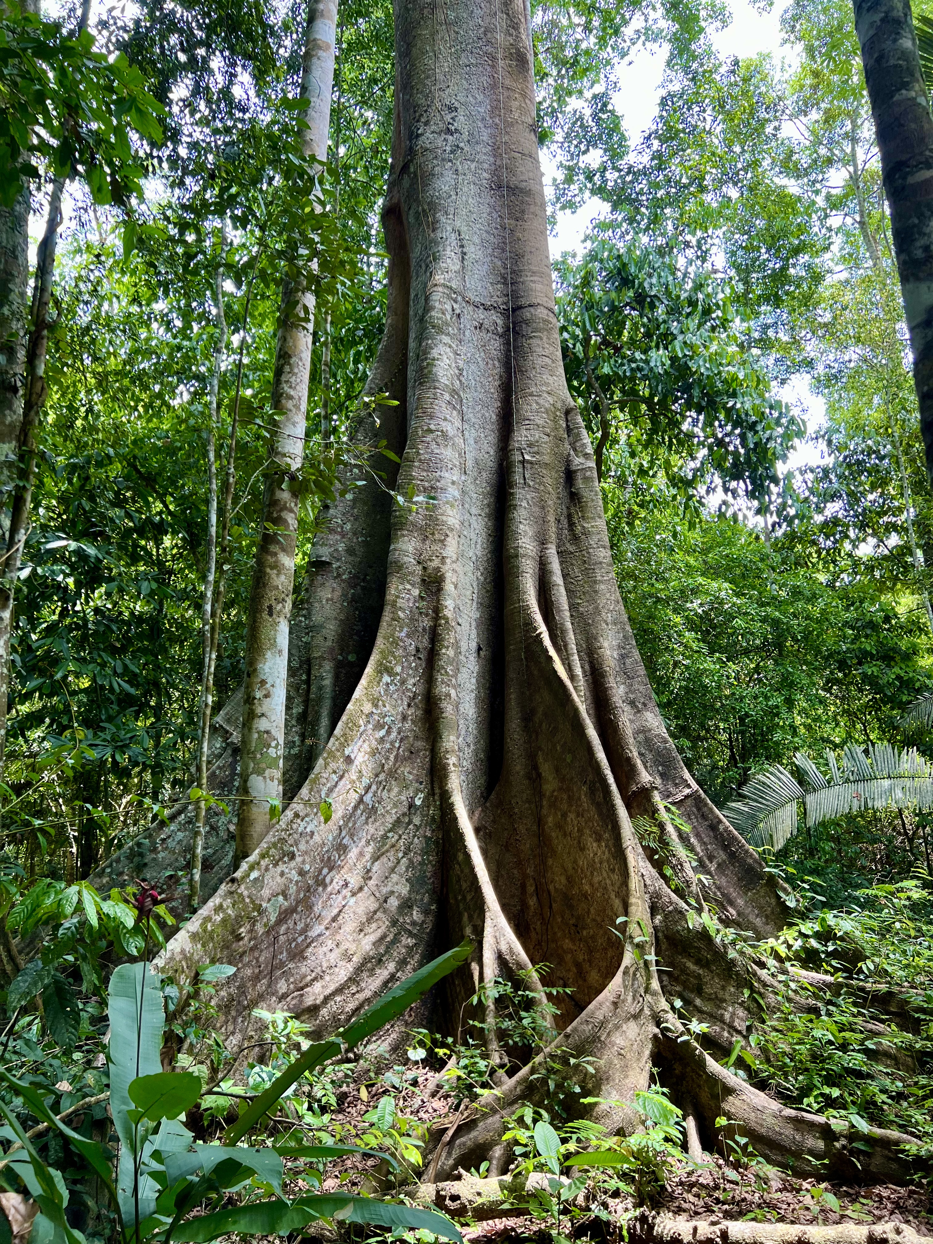 On the first day there were three excursions: the nature walk, a canoe trip to and walk on Monkey Island, which was only a few minutes from the lodge, and a caiman viewing at night. This worked out to being first, a bit about the flora, then a bit about the terrestrial fauna and finally the water’s inhabitants. During the nature walk, Fernando explained that there are two different species of termites living in the forest, one lives on tree trunks, with a mixture of their saliva and excrement forming tunnels on the sides of a tree. Apparently, this mixture can be collected from the tree trunk and used as an insect repellent. The termites don’t hurt the living trees as they only feed off of dead wood – the woodwork in my former house in Yuma, AZ, for example. The other kind are the ones that build mounds on the forest floor, which are the kind I have seen in equatorial regions across the globe. We also learned that the kapok tree is locally called ‘the mother of the forest’ because it can grow up to 60-70ft tall and live up to 1,000 years. It produces a cotton like substance from June to August that locals use for pillows and blankets. Other trees that were highlighted during the walk were the walking palm, which moves to where it can catch sunlight through the canopy, various other kinds of palms, fig and strangler fig trees. These, along with the kapok, were similar to those in Daintree National Park in Queensland, Australia, if a bit smaller than their Australian cousins.
