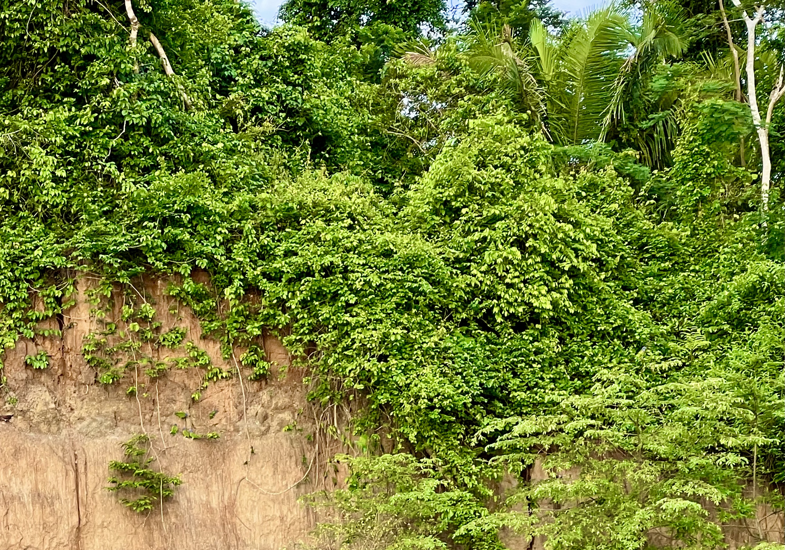 The next morning was another early one, this time the riverboat left at 4am. The goal was to see parrots and macaws at a clay lick about an hour and a half from the lodge. It was a delightful morning boat ride watching the sun come up behind us as we motored down the Tambopata River past Puerto Maldonado to the lick. The river itself is not attractive as it is a dirty sandy brown color with clumps of debris, mud, logs and plastic floating on the surface, but the forest on the sides appears dense and healthy. When we arrived at the lick, just before I could take any pictures, a pigeon scared off the birds who were feeding. They either flew completely away or headed into the trees near the lick. As many of the ones there were green parrots, it was almost impossible to recognize them amid the green leaves. As we headed back to town, where I was getting off to go to the airport to fly back to Lima, we again got very lucky and saw not one but two three-toed sloths in the trees by the shoreline, and one was hanging upside down chomping on green leaves.