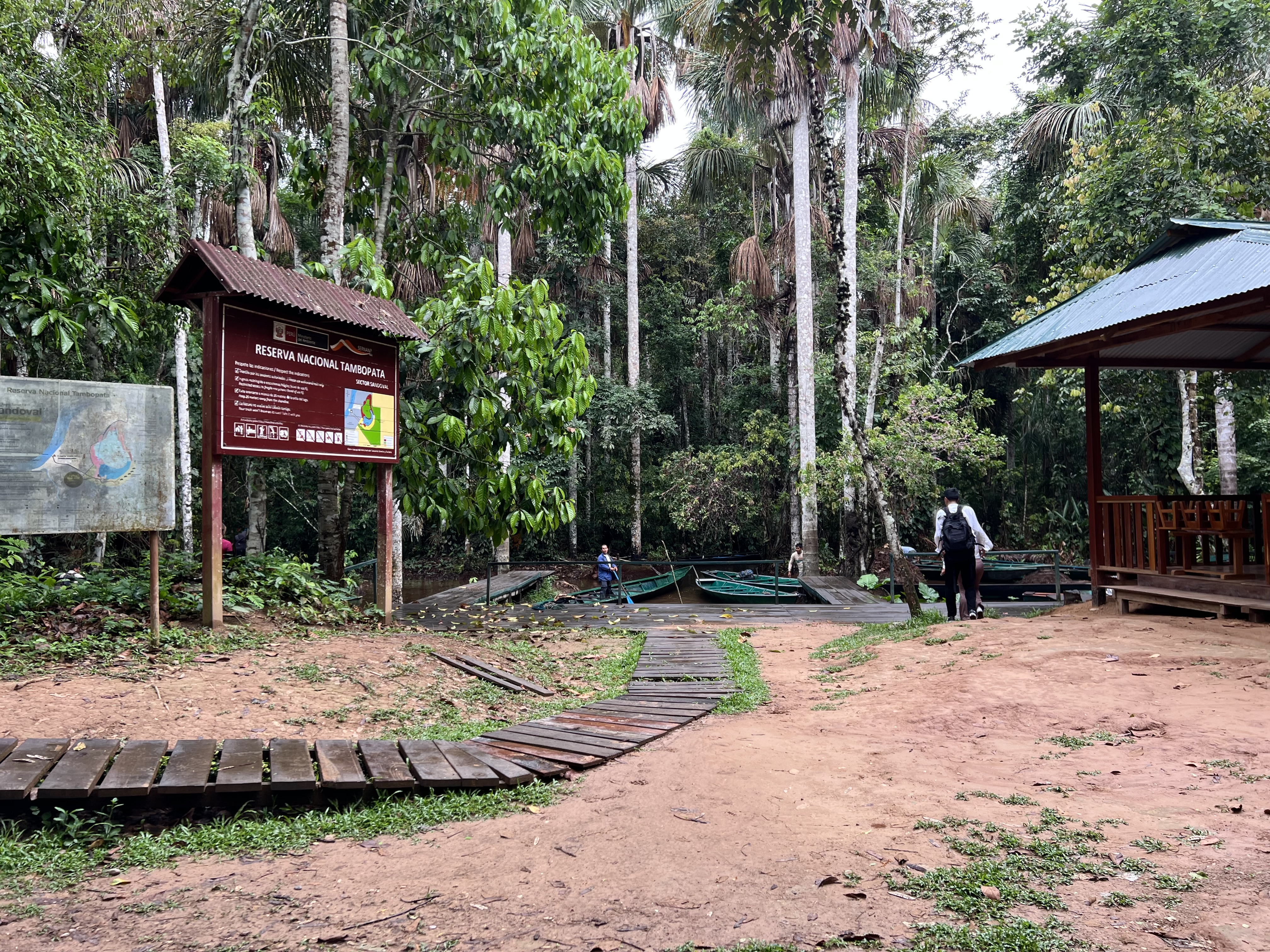 The following day, we were told that if it was raining, we should stay in bed longer, but if not we should be ready to get to the dining hall by 4:30am for the trip to Lake Sandoval. At 4:30 it was still raining, but by 4:45, it had stopped so I got up on the off chance that we would leave at 5. We left at 5:10 after Fernando woke everyone up. The day was overcast but not rainy, which made it a perfect day for wildlife viewing as it wasn’t unbearably hot. The boat ride took about forty-five minutes, then there was a 3km walk on a wooden boardwalk through the rainforest to the canoe dock for the lake. The riverboats are motorized, but the large canoes on the lake are paddle-powered.