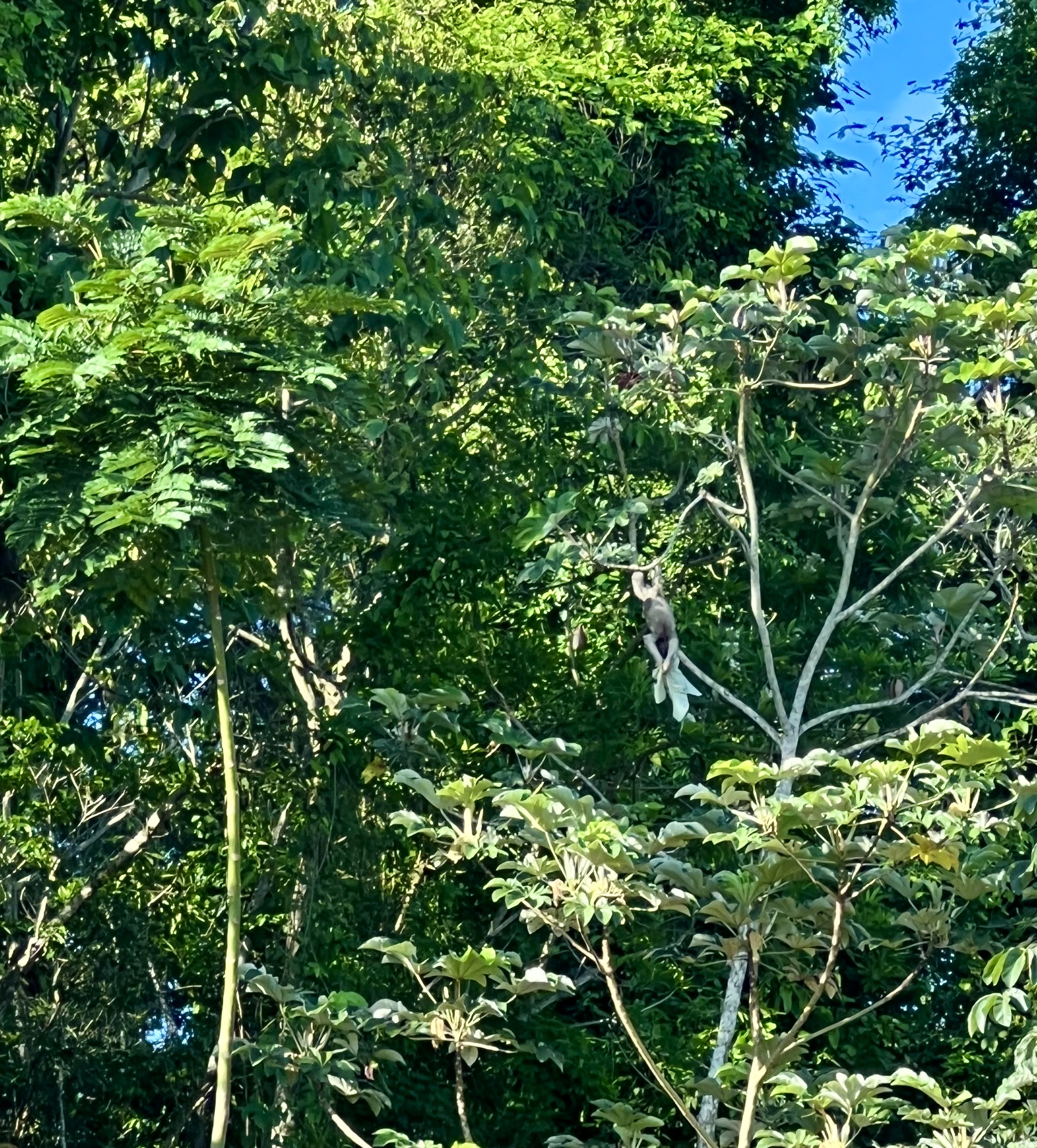 After a few hours on the lake, we returned via the path we took when we arrived to meet our riverboat that took us back to the lodge in time for lunch. In the late afternoon, we gathered again, this time for a canopy walk on a couple of swinging bridges near the forest canopy. Again, we were incredibly lucky as a red howler monkey was playing in a tree not too far from the tower platform that stabilizes one side of one of the bridges. A small owl stuck his head out of a cavern in the tree in front of the platform and watched us the entire time we were watching him and the monkey. I had the sense that the wildlife here carefully pays attention to what the human tourists do, much the way we watch them. The final event of the day was a night-time walk on a path behind the lodge to see tarantulas and other creepy crawly jungle critters. We did see a number of the furry anchariids, as well as the very nasty black and large bullet ants, but no snakes, for which I was actually quite grateful. The best part of the night walk was seeing a porcupine in a tree. I didn’t know they existed in the rainforest, as I’m familiar with the ones that meander through the Wasatch Mountains in Utah and those in Michigan and Maine, i.e., very different habitats than in the tropical rainforest.